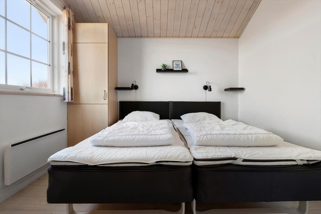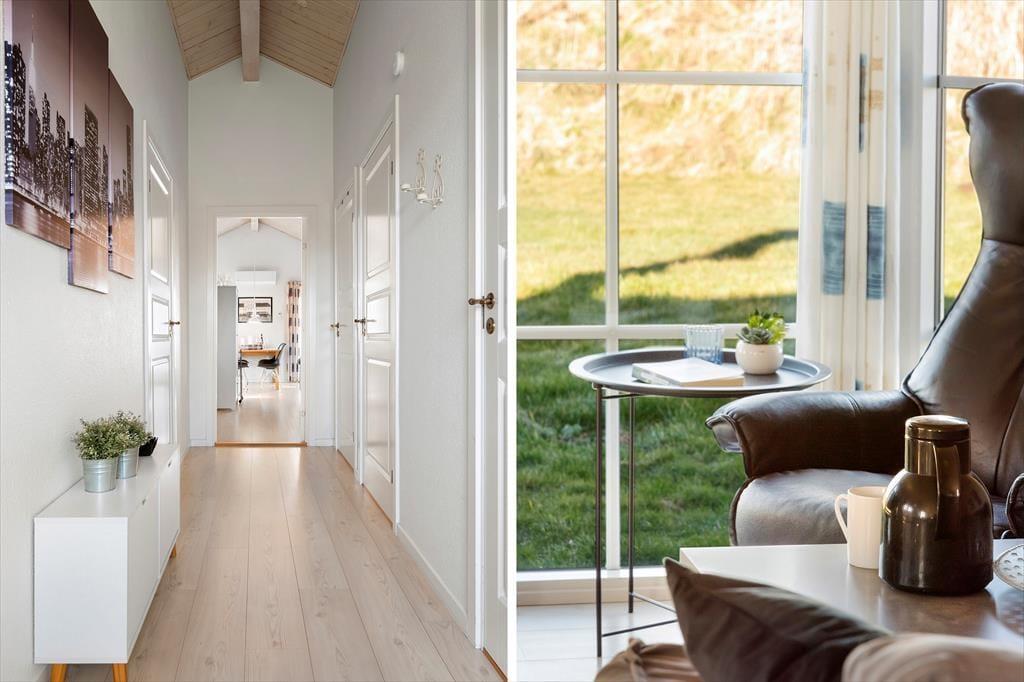 Sommerhuset er stilfuldt indrettet og fremtræder lyst og atmosfærefyldt. Sommerhuset indeholder 4 rummelige soveværelser med dobbeltsenge, et gæstetoilet og et stort badeværelse med spa og sauna. Opholdsrummet fremtræder lyst og hyggeligt og er sammenhængende med det åbne veludstyrede køkken, og herfra har man adgang til den lukkede terrasse.