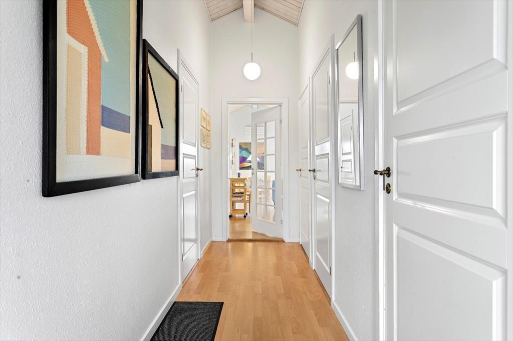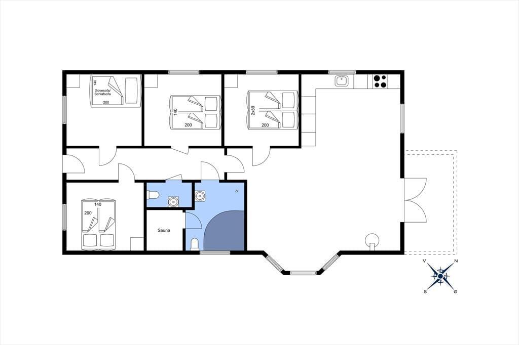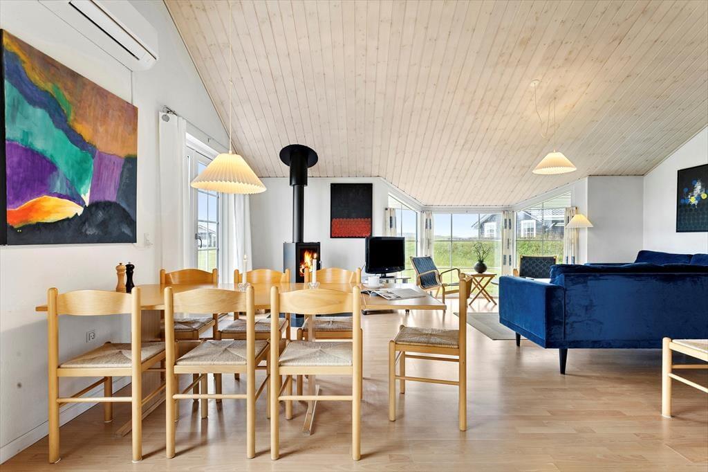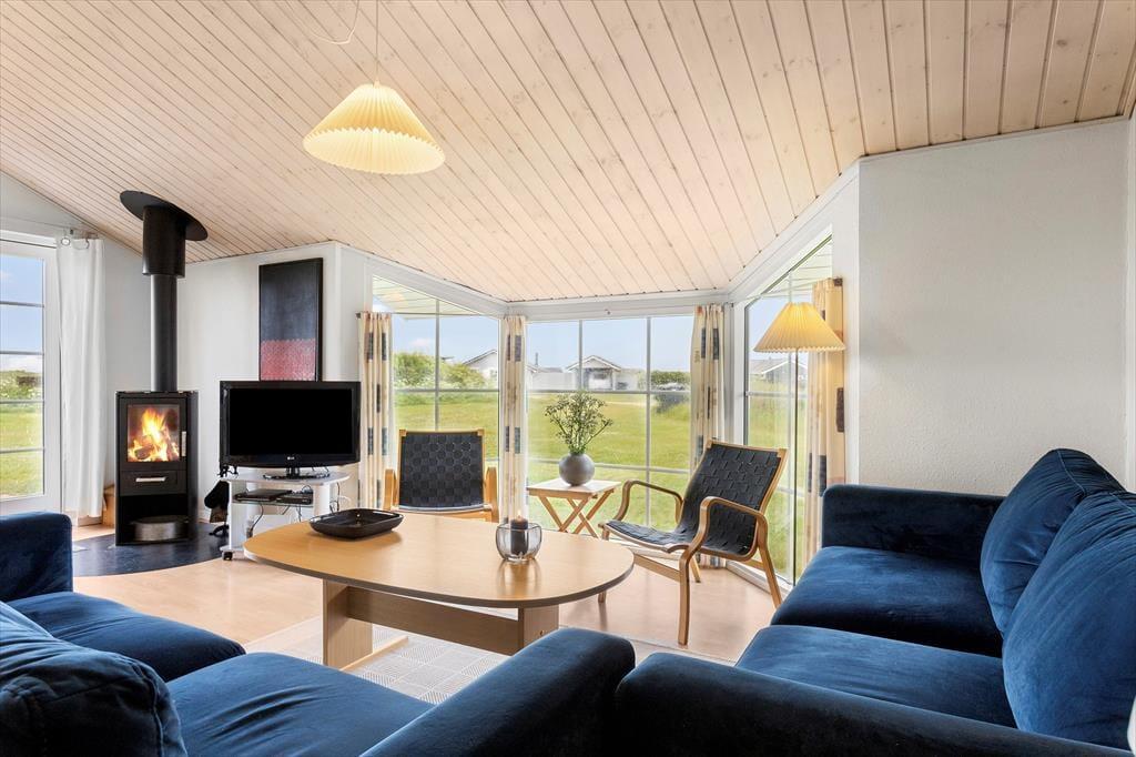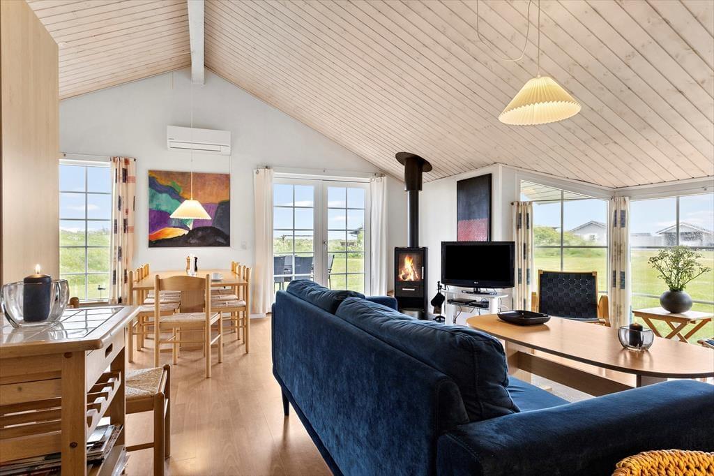 Et dejligt og rummeligt sommerhus med plads til otte overnattende personer fordelt på fire værelser. På det ene værelse er en sovesofa og en PlayStation 3-konsol, og i det hele taget er huset godt udstyret med pæne møbler, moderne faciliteter og nyttige hjælpemidler, som f.eks. vaskemaskine og tørretumbler, gratis trådløst internet og både sauna og spabad på det store badeværelse. Det kombinerede køkken og opholdsrum med tv og brændeovn lægger op til mange hyggelige timer, og herfra er der også udgang til terrassen. Et fint og meget anvendeligt sommerhus med alle muligheder for en afslappende ferie.