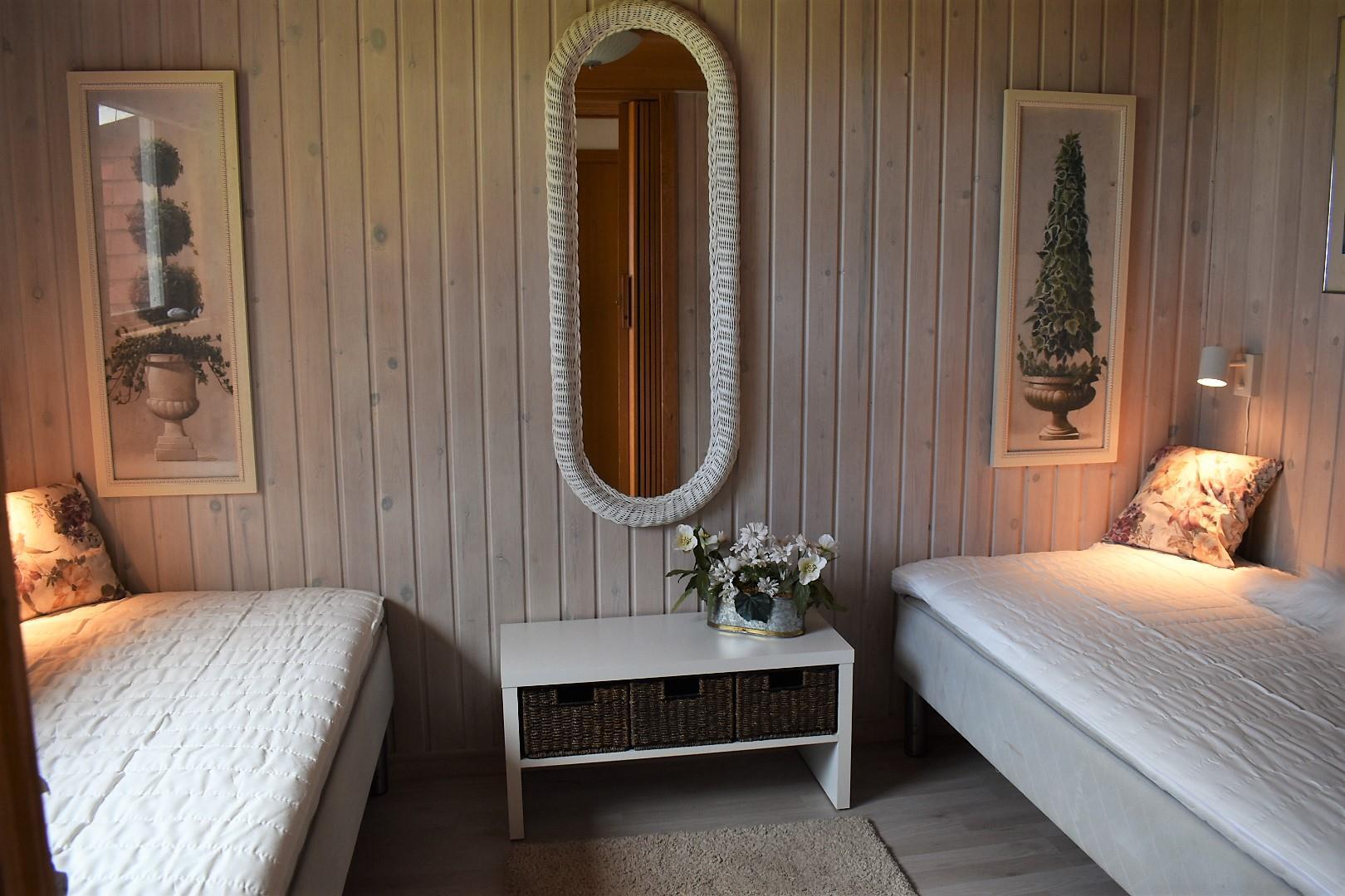 Sommerhuset rummer i alt fire soverum. Hovedhuset har 2 soverum, et stort værelse med dobbeltseng og panoramaudsigt til vandet samt et værelse med to enkeltsenge. Herudover er der to separate annekser, det ene på 16 m² med to enkeltsenge og det andet på 9 m² med dobbeltseng, begge med udsigt til vandet. Huset har desuden et rummeligt badeværelse med brusekabine og vaskemaskine samt et praktisk gæstetoilet.