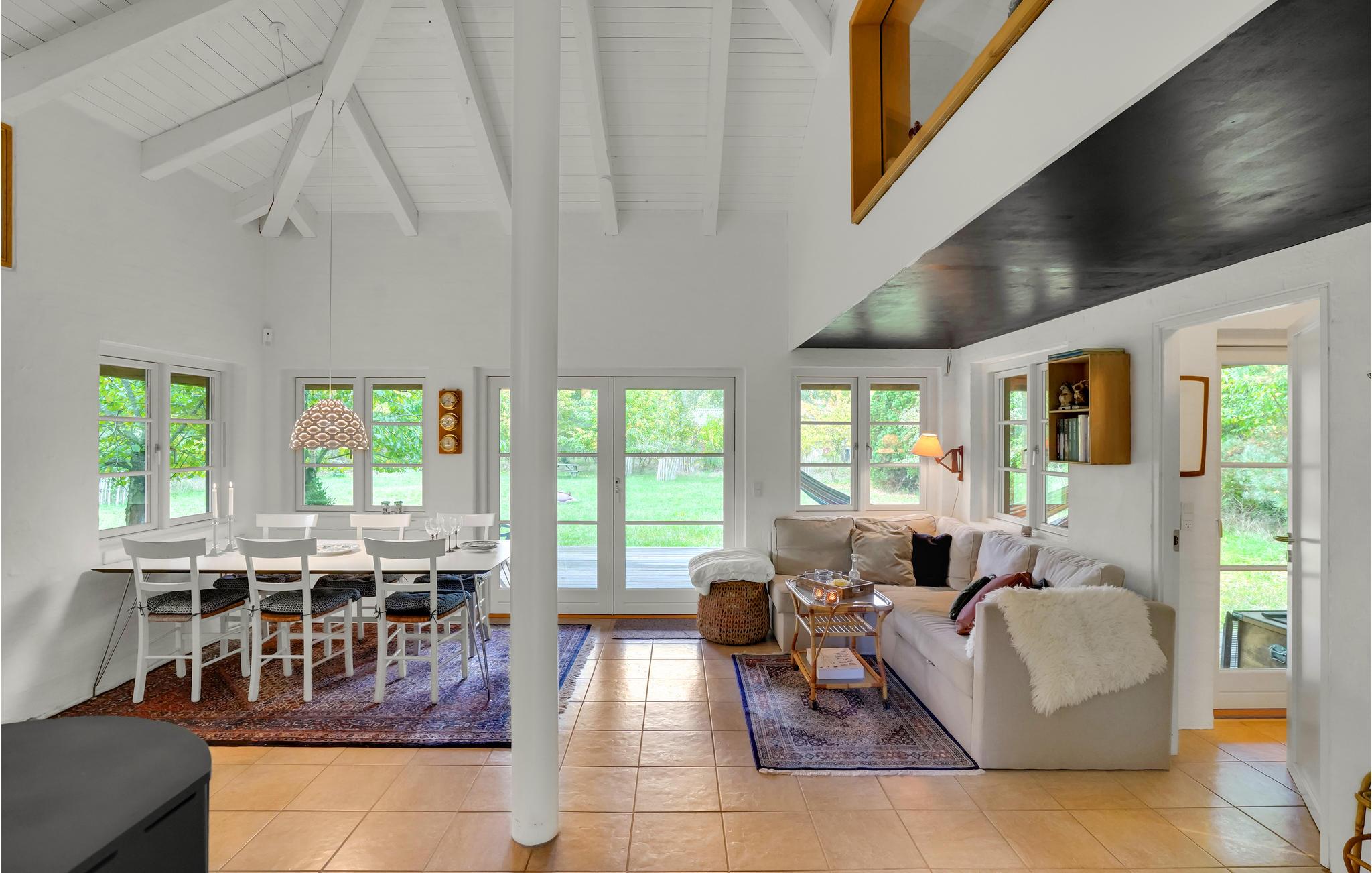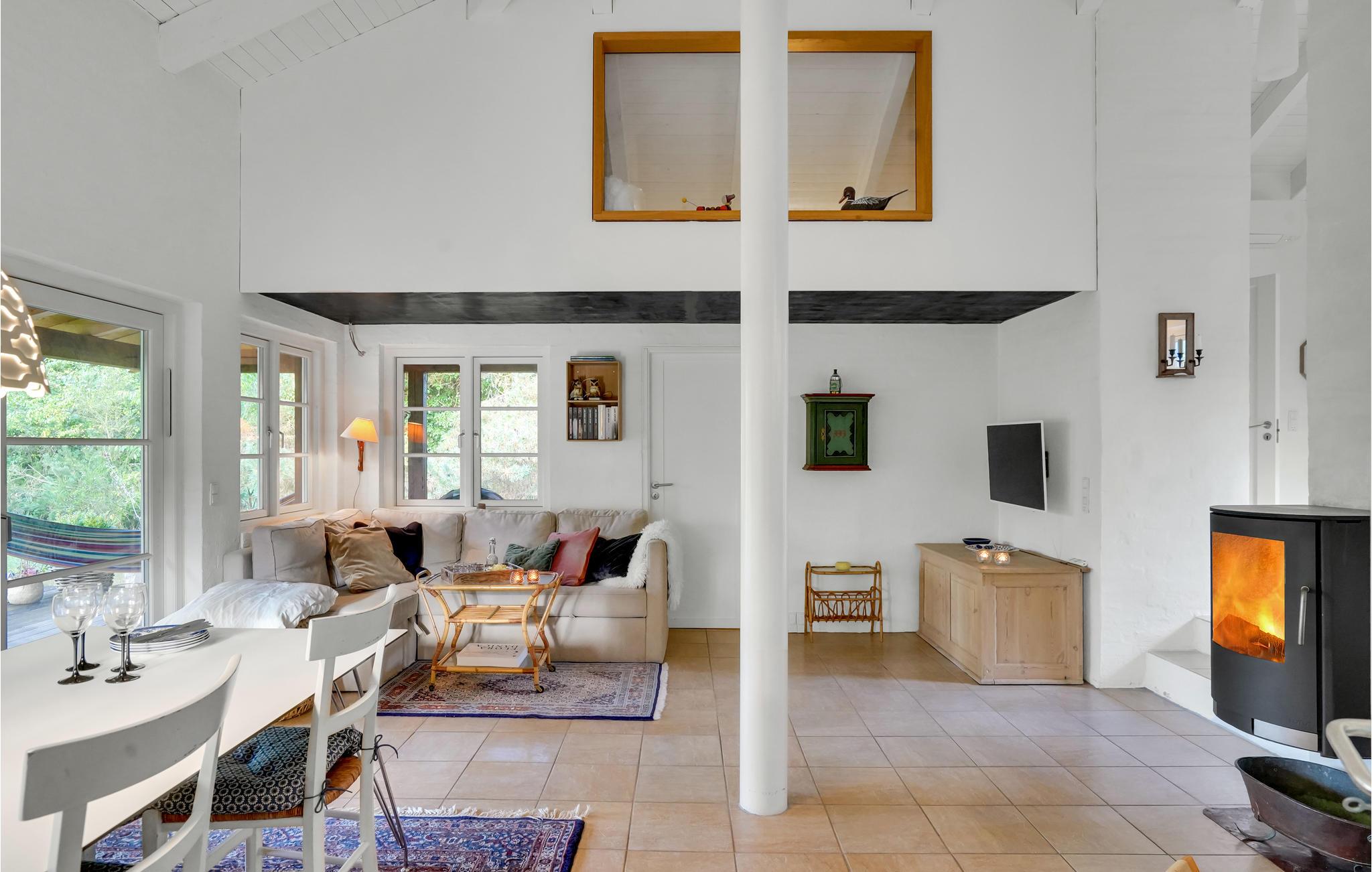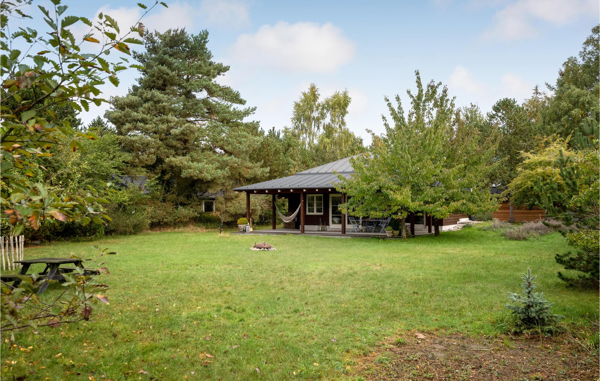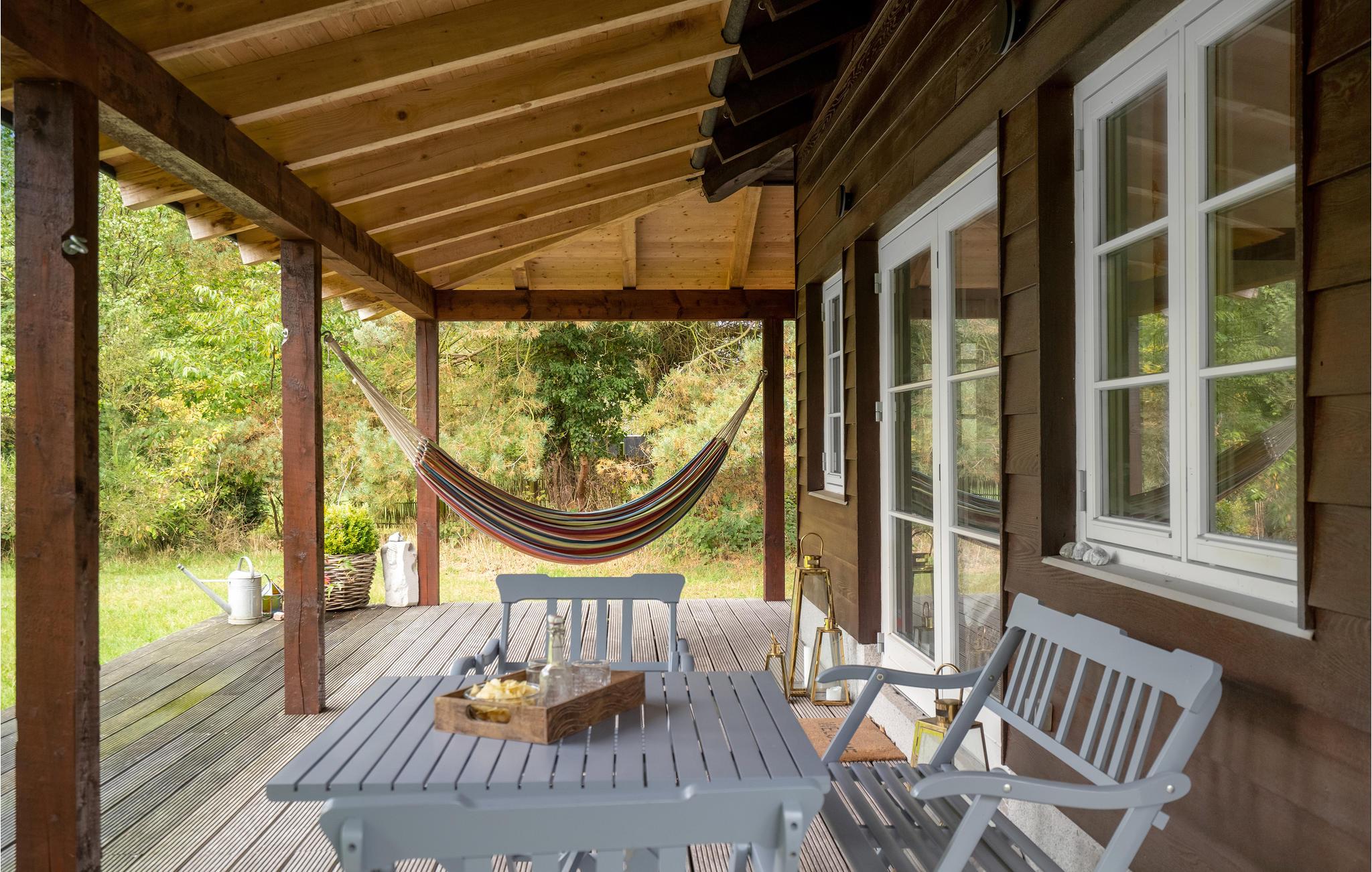 Dette skønne sommerhus byder velkommen i idylliske, naturskønne omgivelser. Huset ligger på en rolig naturgrund med bede og træer, og byder på et lyst interiør i høj kvalitet med alt hvad I behøver for et behageligt ophold. Tilbring mange skønne timer i den stilfulde stue, nyd jeres måltider med udsigt til det grønne og varm jer om aftenen foran brændeovnen, mens I lytter til den knitrende ild og spiller spil. Nyd sommervejret i fulde drag på verandaen. Slæng jer i hængekøjen med en god bog i løbet af dagen, mens ungerne render rundt på græsplænen, og afslut senere en dejlig dag omkring bålet.