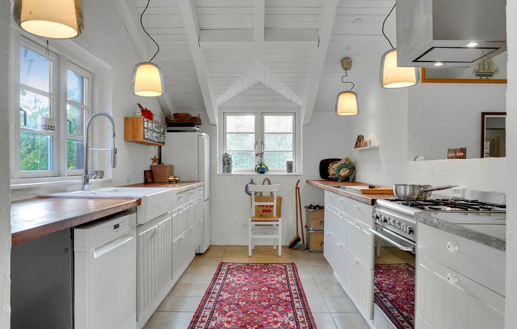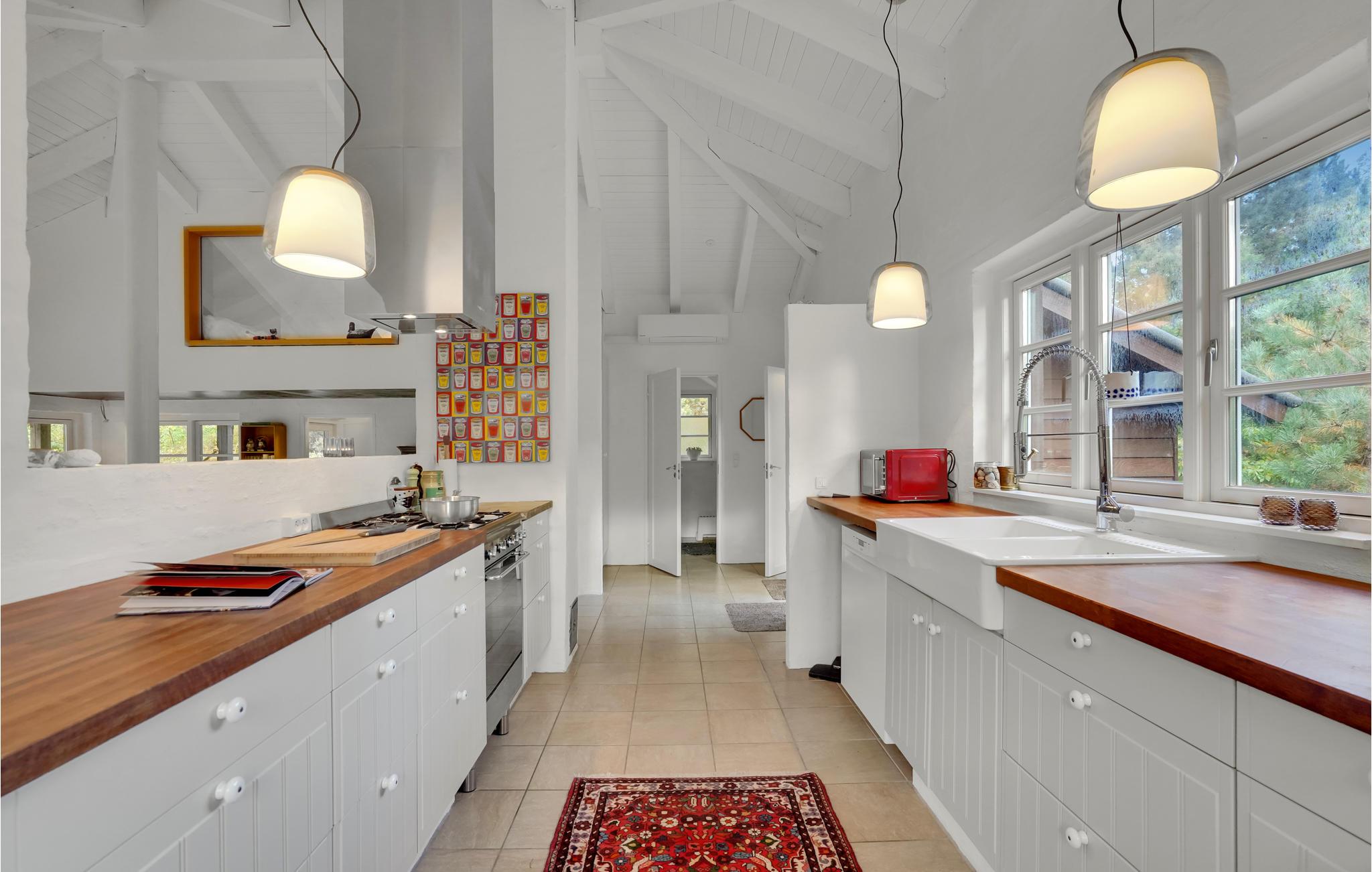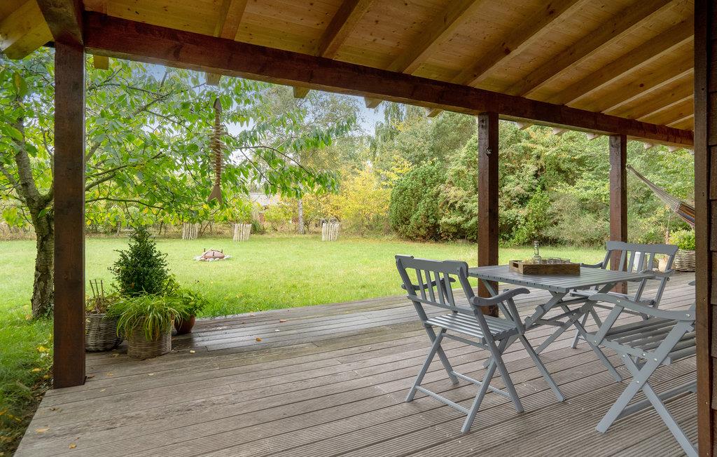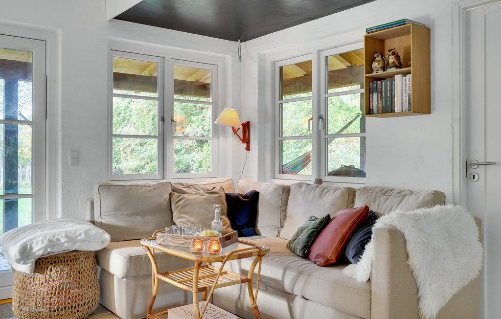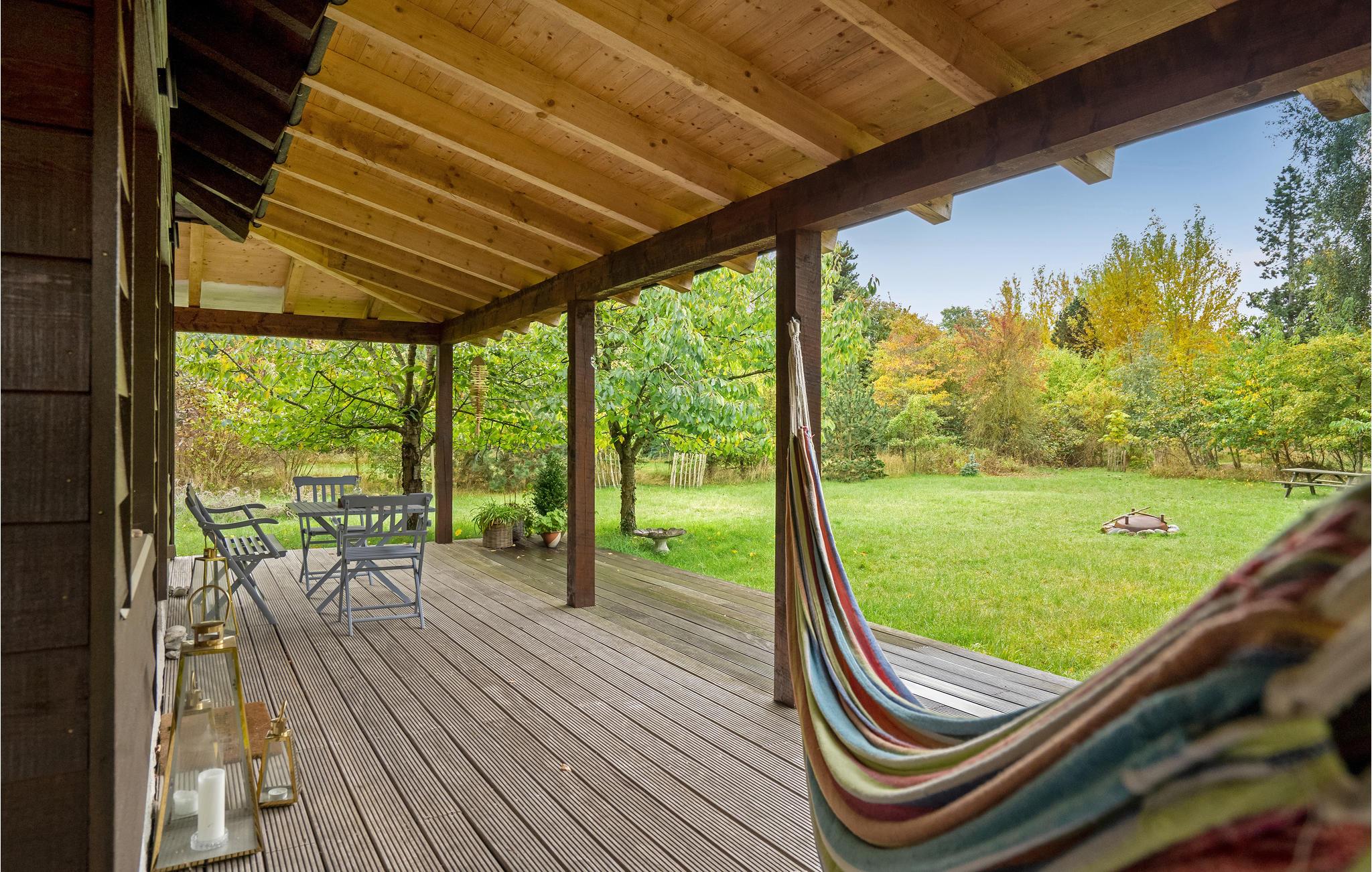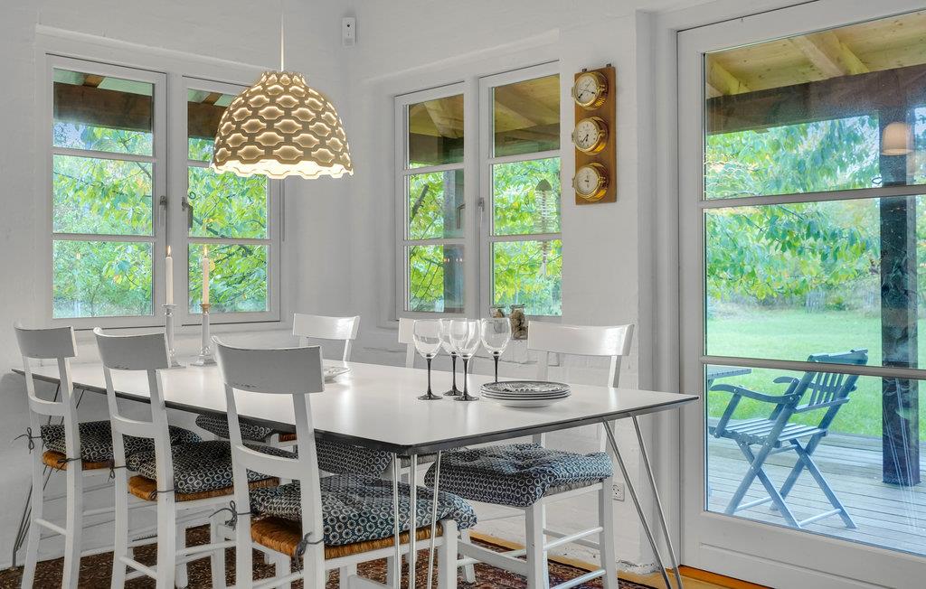 Dette skønne sommerhus byder velkommen i idylliske, naturskønne omgivelser. Huset ligger på en rolig naturgrund med bede og træer, og byder på et lyst interiør i høj kvalitet med alt hvad I behøver for et behageligt ophold. Tilbring mange skønne timer i den stilfulde stue, nyd jeres måltider med udsigt til det grønne og varm jer om aftenen foran brændeovnen, mens I lytter til den knitrende ild og spiller spil. Nyd sommervejret i fulde drag på verandaen. Slæng jer i hængekøjen med en god bog i løbet af dagen, mens ungerne render rundt på græsplænen, og afslut senere en dejlig dag omkring bålet.