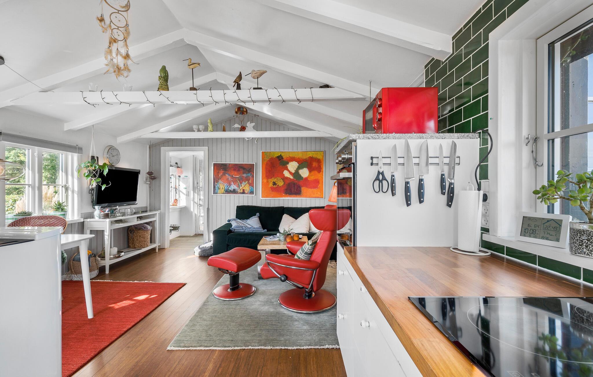 Jeres sommerhus ved Fynshoved Strand venter på jer i en malerisk beliggenhed direkte ved havet og byder på fantastiske udsigter. Ved indgangen til huset bliver I mødt af den lyse og farverige indretning, der straks skaber en afslappet feriestemning. Gør jer det behageligt i den hyggelige sofakrog eller i lænestolen, og nyd jeres ferietid til fulde. Brug det praktisk indrettede køkken til at tilberede jeres fælles måltider.