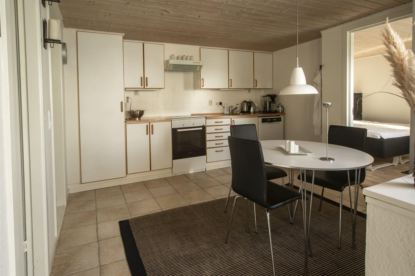 Køkkenet er udstyret med 1 køleskab. Der er 4 keramiske kogeplader, bageovn, mikrobølgeovn samt opvaskemaskine.