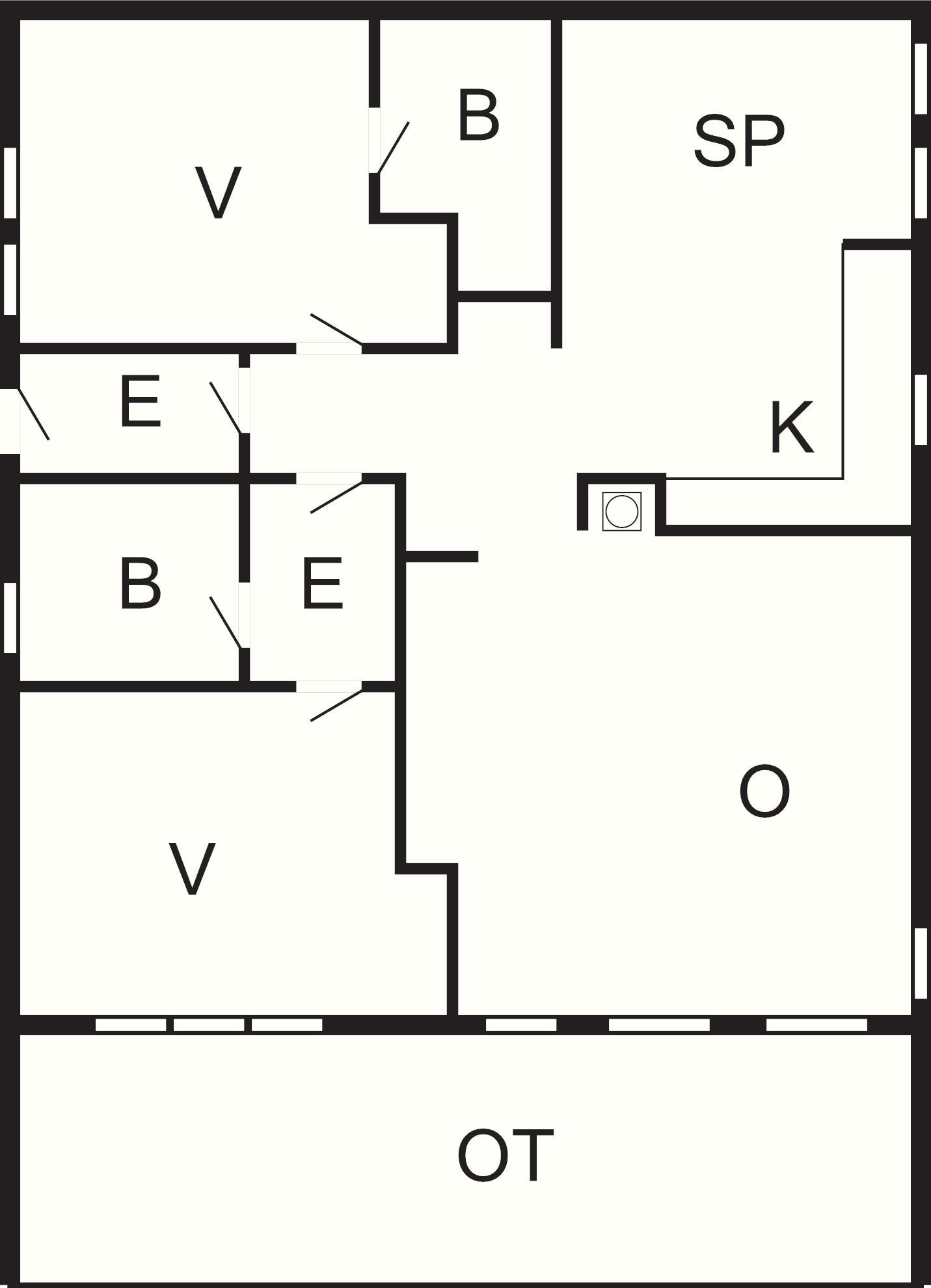 Dette kysthus er indrettet med entre og fordelingsgang samt to soveværelser, hvoraf det ene er med dobbeltseng. Det andet værelse i huset indeholder to enkeltsenge samt to køjesenge. Husene indeholder derudover en stor lys stue med brændeovn samt et stort køkken-alrum med spiseplads. Der er fra stuen direkte adgang til den store overdækkede terasse. I disse typer er der to badeværelser i boligen.