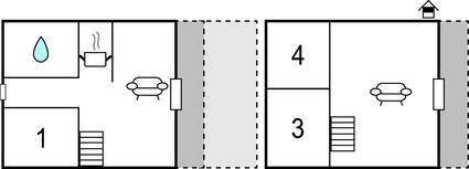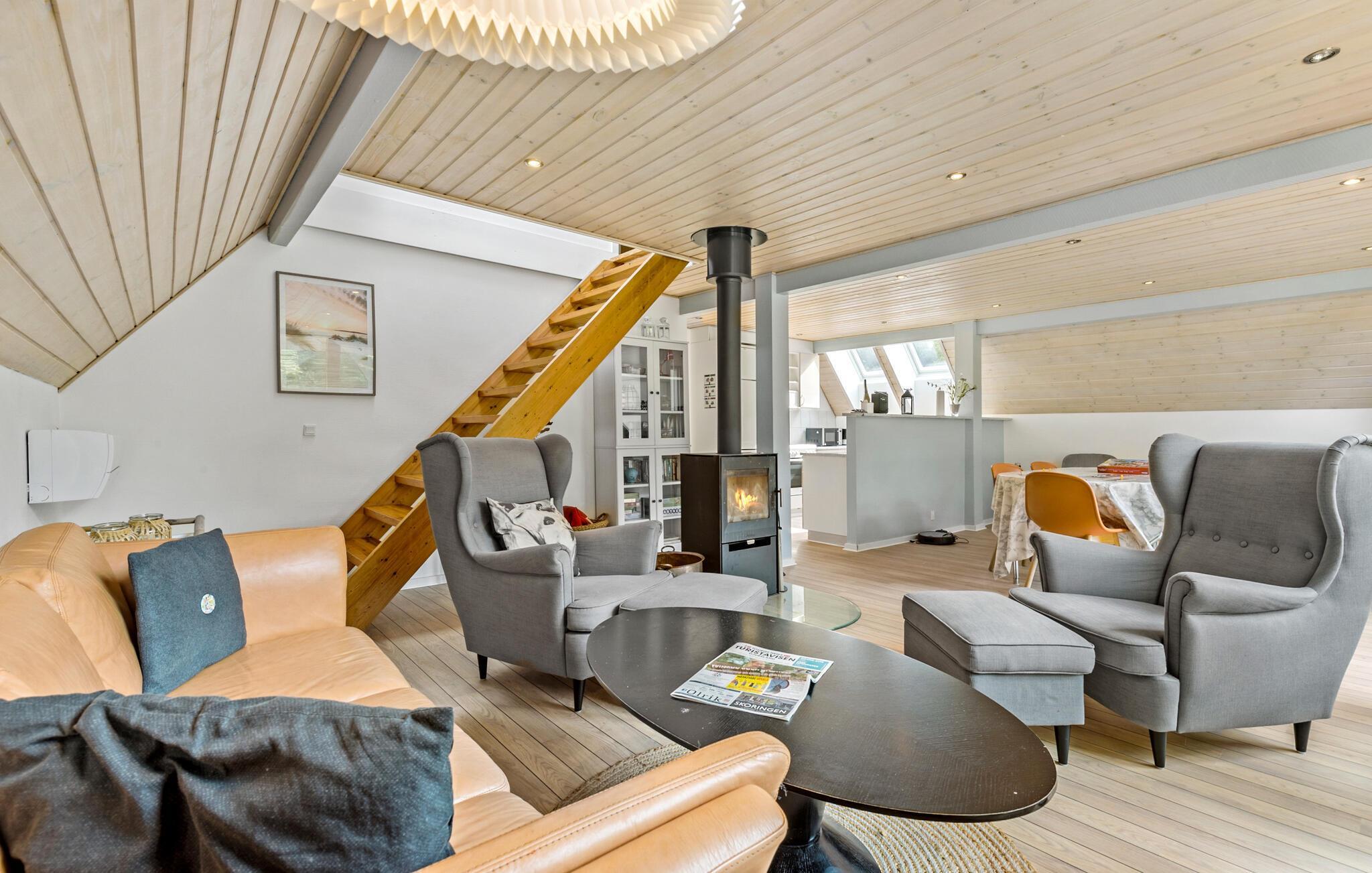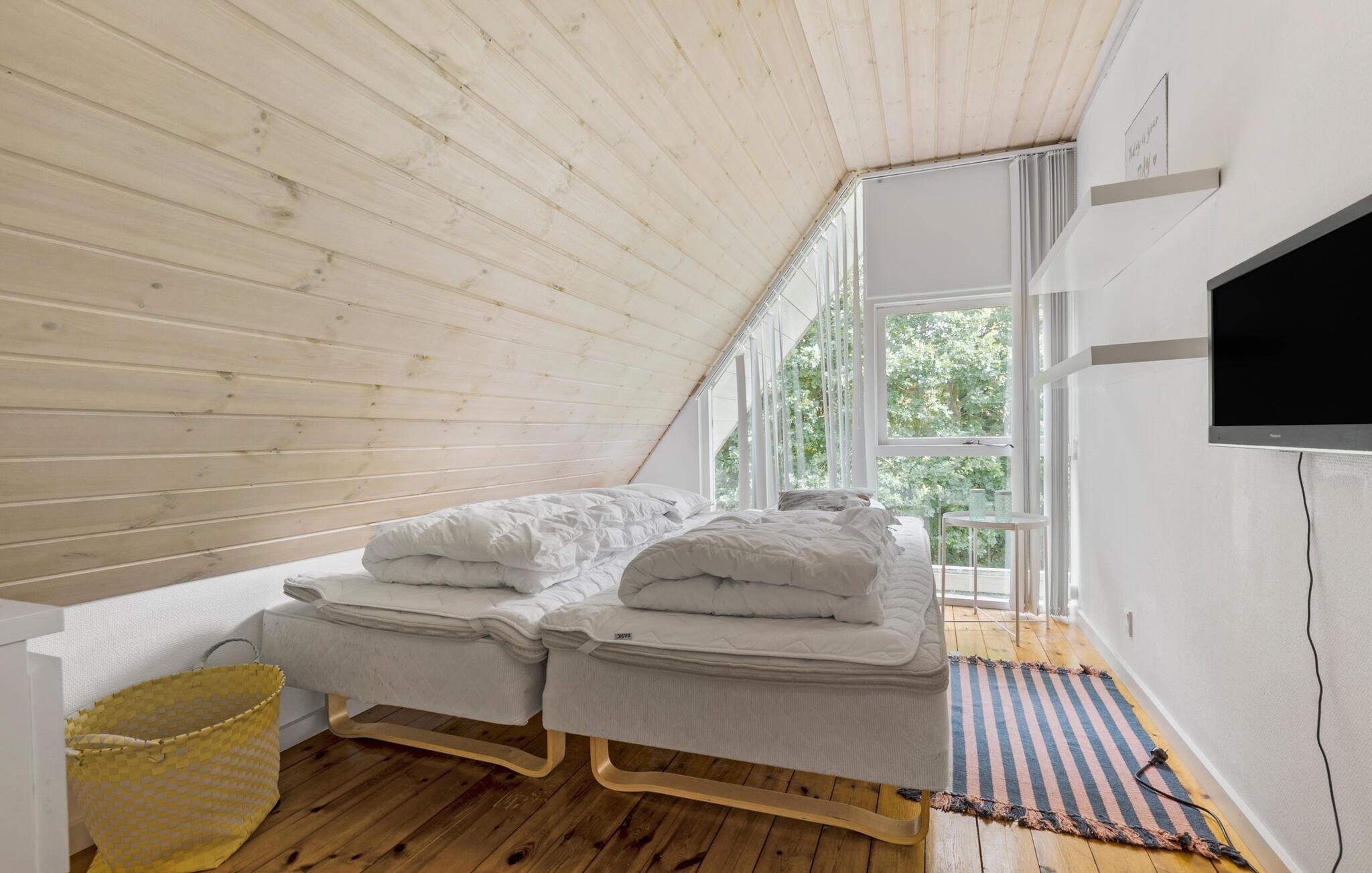 Huset er i to etager og i stueetagen ligger stue/køkkenet med udgang til den delvis overdækkede terrasse. I underetagen ligger ligeledes badeværelset. På første sal er der tre soveværelser samt en lille stue. Der er kun en kort gåtur ned til den helt fantastiske børnevenlige badestrand. Nyd at ligge i en af de mange "gryder" på en varm sommerdag.