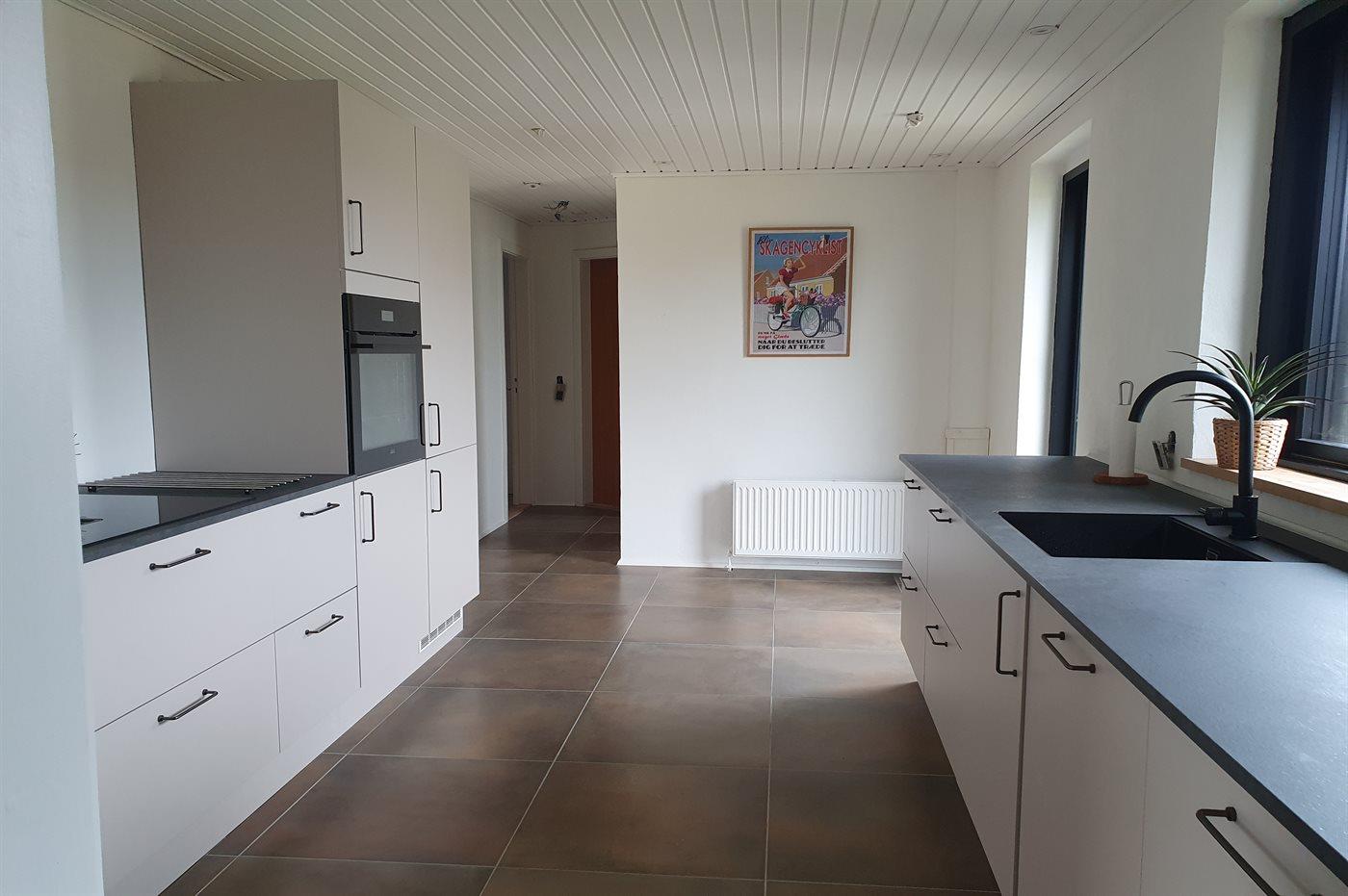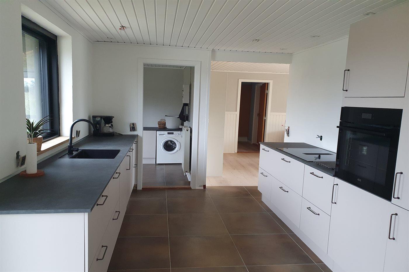 Køkkenet er udstyret med 1 køleskab. Der er 4 induktionskogeplader, varmluftovn, mikrobølgeovn samt opvaskemaskine.