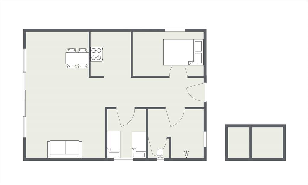 Dejlig lys stue med god spiseplads, her er der både mulighed for at fordybe sig i en god bog eller snuppe et spil kort med børnene. I forbindelse med stuen er der et funktionelt åbent køkken, med alle bekvemmeligheder. Der er et rigtig fint badeværelse med brus og 2 dejlige soveværelser. I master bedroom, er der elevationsseng. Fra stuen er der udgang til husets skønne terrasse, hvorfra I kan nyde solen fra morgen til aften. Der er også en fantastisk terrasse mellem huset og det tilhørende anneks, hvor der er plads til at 2 personer kan overnatte. Alt i huset fremstår lyst, lækkert og særdeles indbydende.