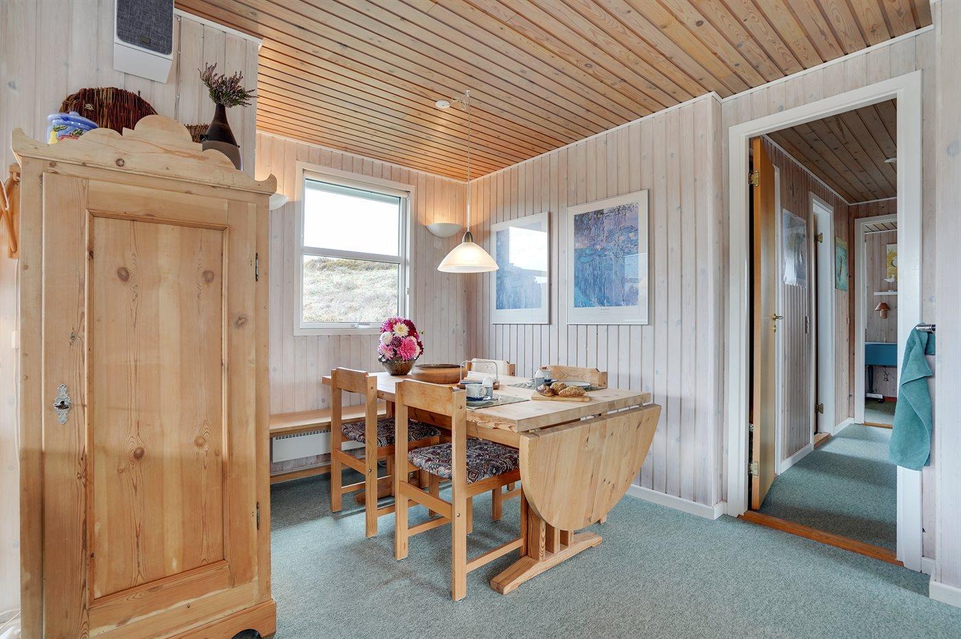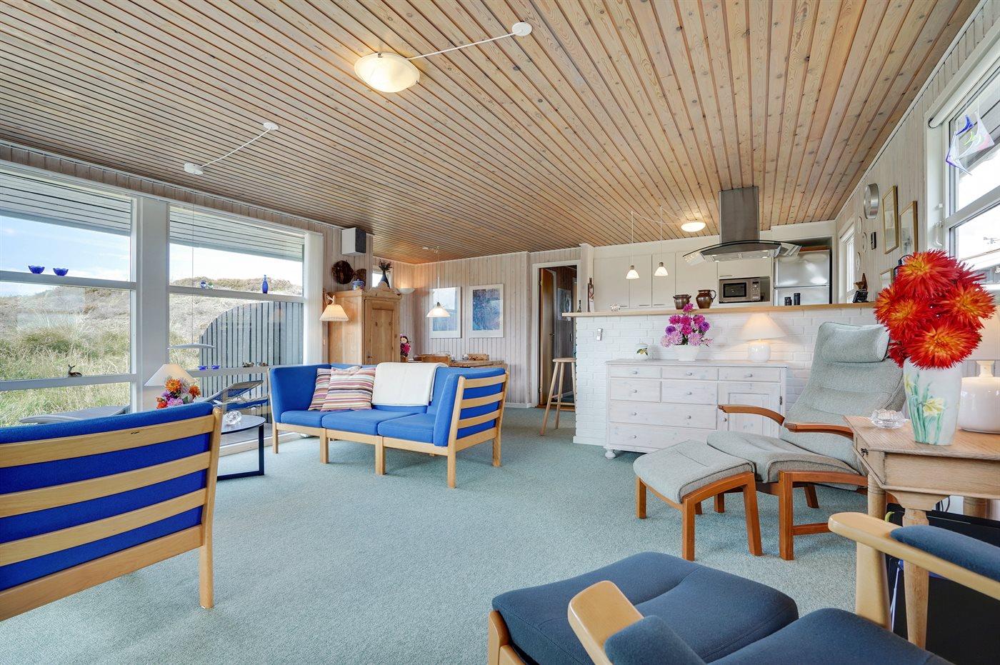 Boligen fremstår lys og venlig med lysindfald fra flere sider. Der er brændeovn. Køkkenet er i åben forbindelse med stuen - optimalt for fælles aktiviteter. Hyggelig spisekrog med stor sofa og flere lænestole giver mulighed for hygge og afslapning. Udenfor vinduerne kan man nyde udsigten til de lyngbeklædte bakker, hvor rådyrene færdes frit. Det er ikke tilladt at medbringe husdyr.