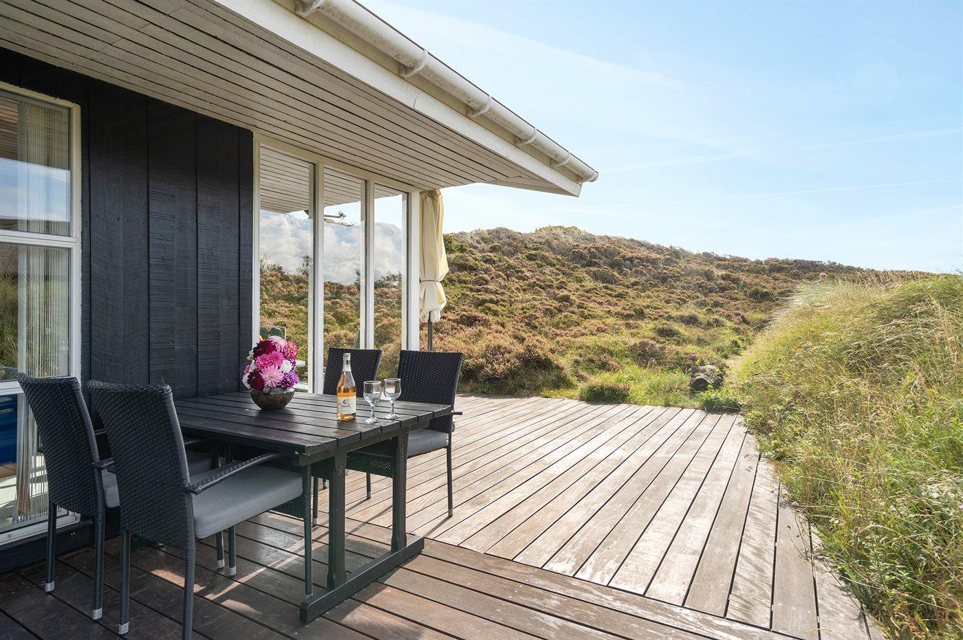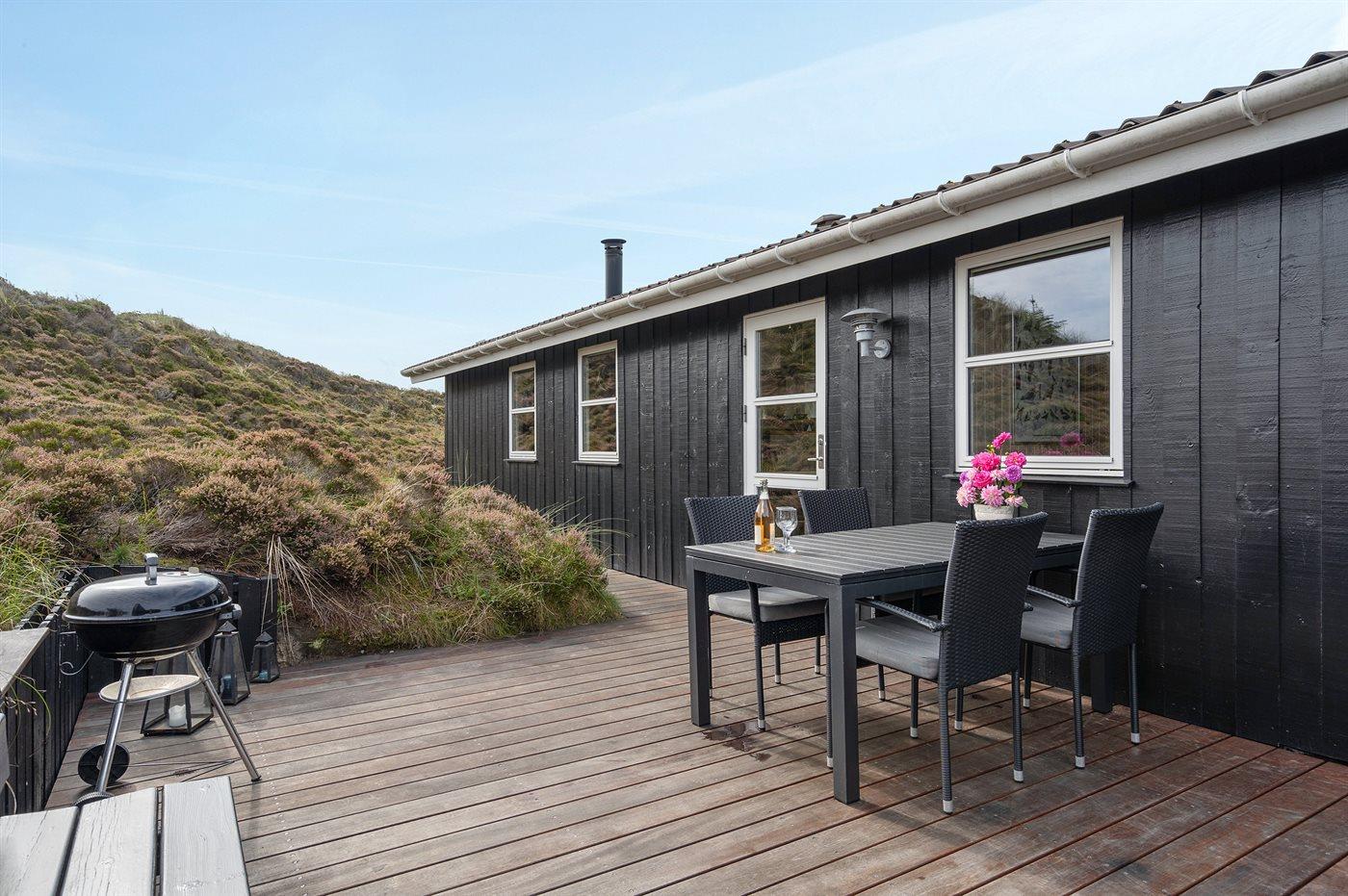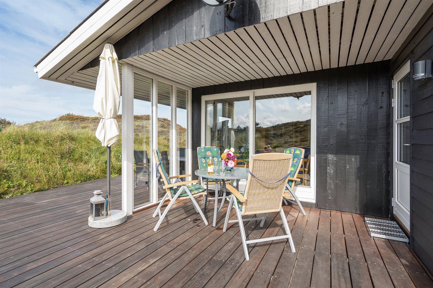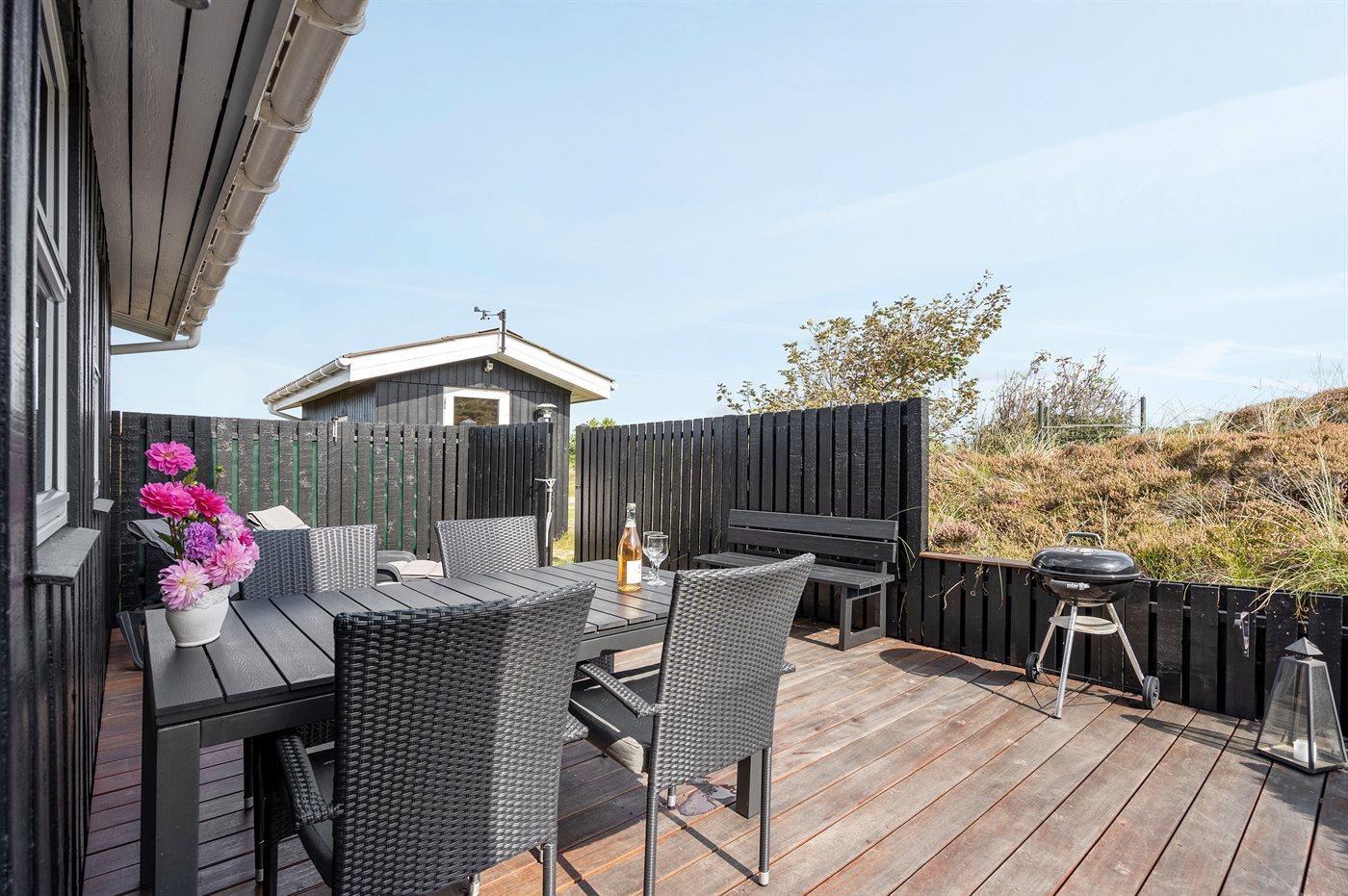 Til ferieboligen hører et eksklusivt 80 m² åbent sammenhængende og ugeneret terrasseareal, 27 m² mod øst, 30 m² mod syd samt 23 m² mod vest. Heraf er der 16 m² overdækket terrasse med direkte adgang fra stuen mod syd. I redskabsrum findes vaskemaskine, tørretumbler, brænde depot og grilludstyr. Lige udenfor forefindes tørresnor. Terrassemøbler består af 3 borde, 2 parasoller, 8 stole (stabelbare), 6 stole (fem-pos.), 2 bænke samt 4 solvogne.