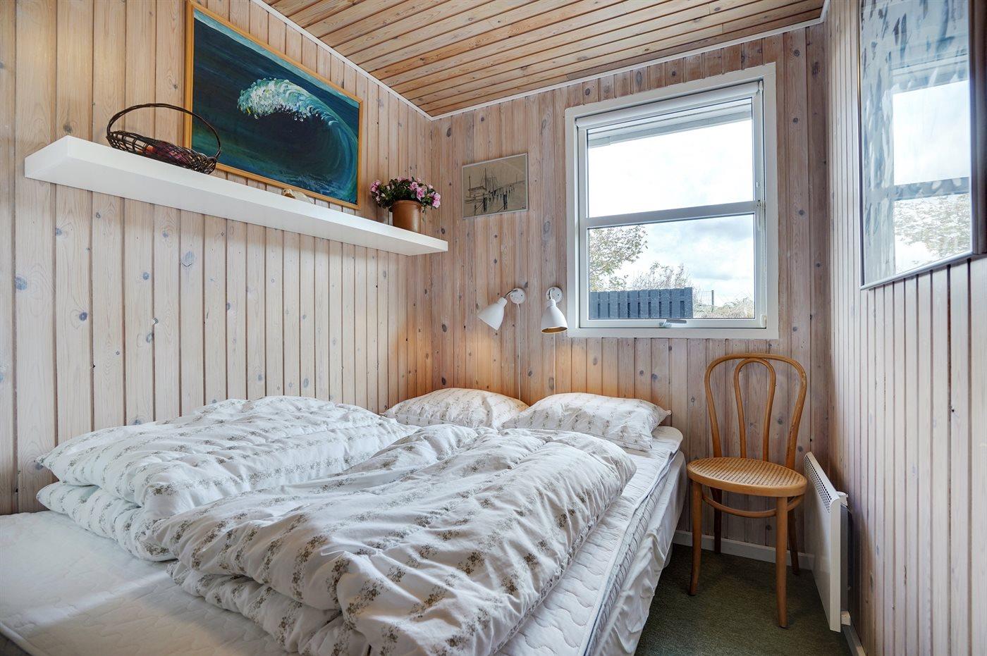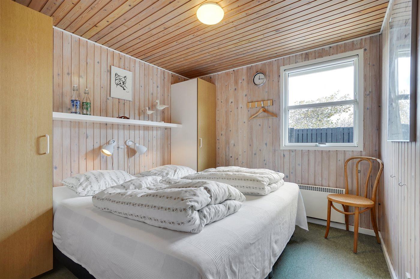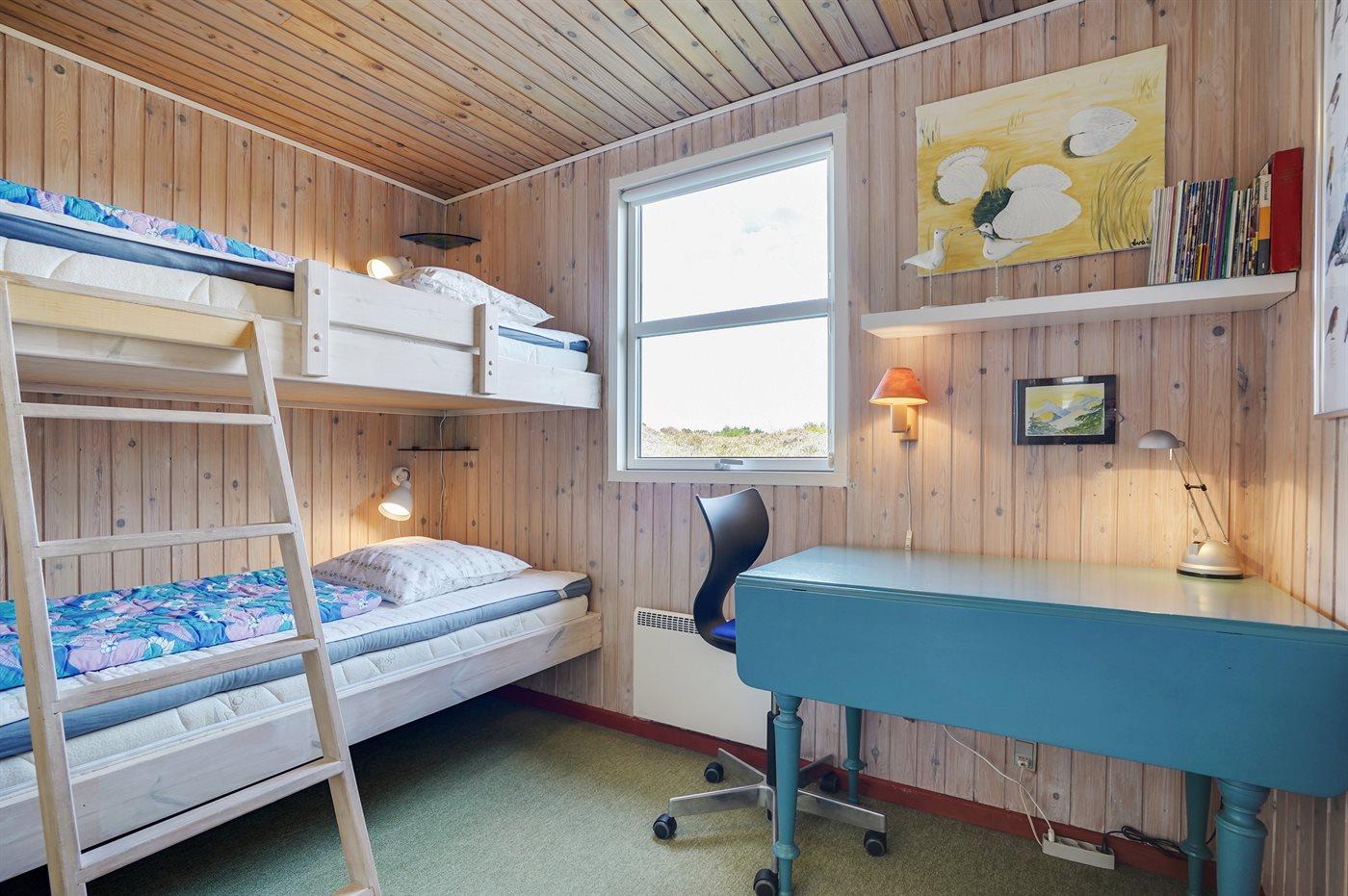 Der er i alt 3 soveværelser. Sovepladserne fordeler sig på: 2 sovepladser i dobbeltseng. 2 sovepladser i 3/4- seng og 2 sovepladser med springmadrasser i køjesenge (200x90cm).