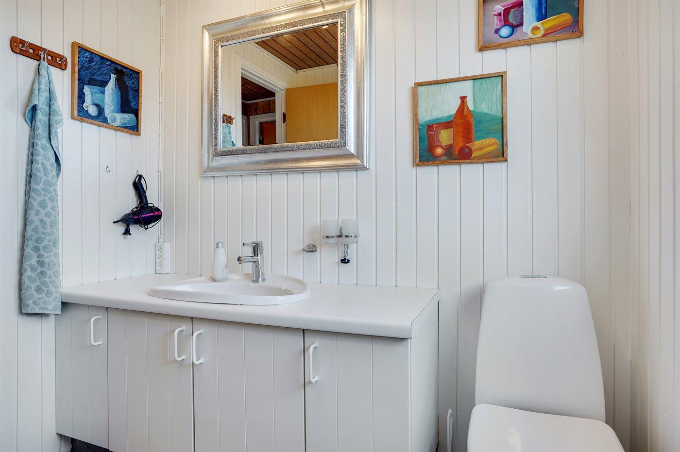 Der er 1 badeværelse med bruseniche og 1 toilet. På badeværelset er der varme i gulvet, håndklædetørrer og hårtørrer. Adgang til udendørs bruser. Rigeligt varmt vand med en beholder på 60 liter.
