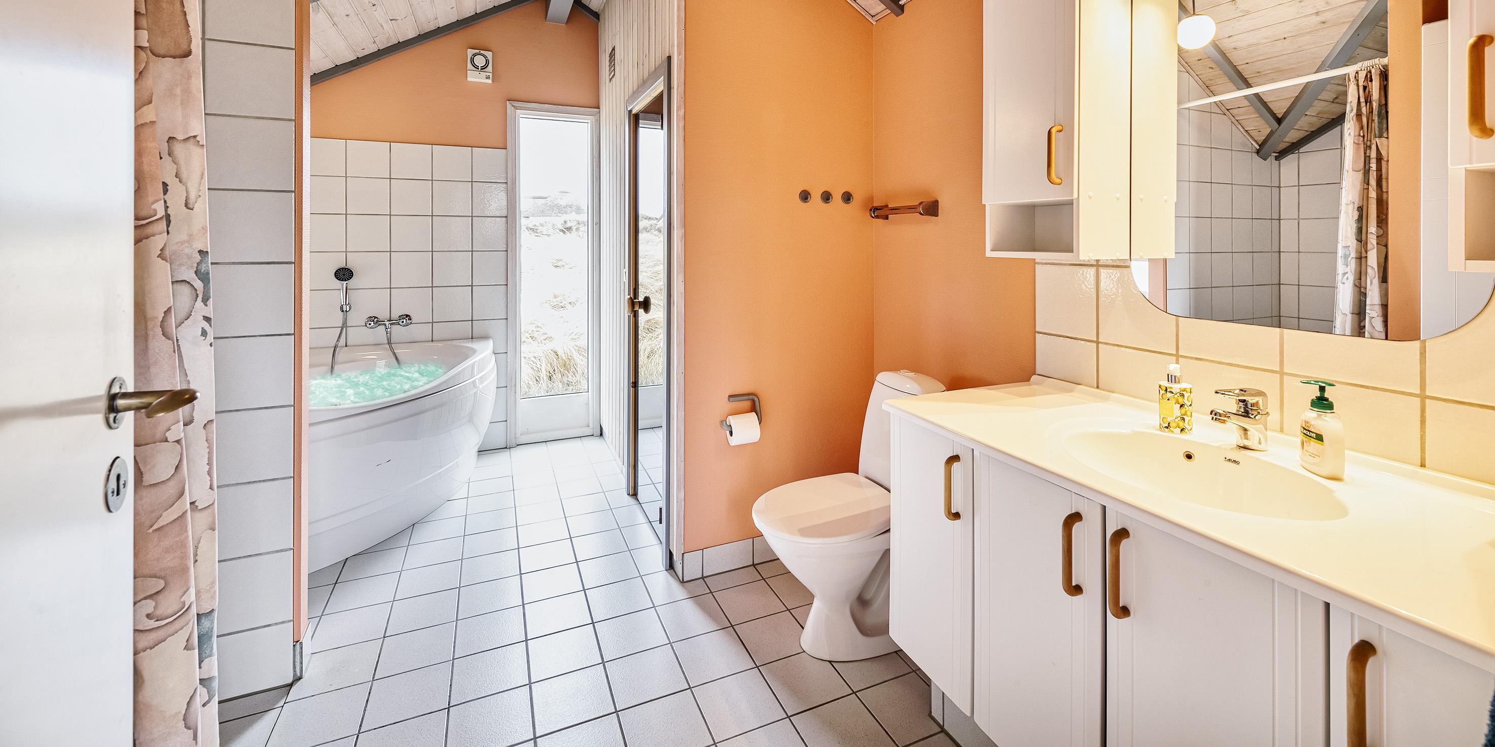 Hovedhuset indeholder: indgangspartiet er i direkte forbindelse med husets opholdsrum. Den hyggelige stue er indrettet med en god spiseplads med langbord hvorfra der er udsyn til brændeovnen og terrassen. Sofahjørne med udsyn til brændeovnen, fjernsyn (BOXER) og kig til klitlandskabet. Lille kontor hjørne med trådløs internetadgang og en printer. Køkken med opvaskemaskine, mikroovn, komfur med keramisk kogeplade og varmluftovn samt en køle-/frysekombination. En ekstra kæl- og fryseskab stå i gæstehus i gang. Fra køkkenet er der udgang til en østvendt terrasse hvor morgenmaden kan nydes til solopgang. Fra stuen er der indgang til 1 soveværelse med 2 enkeltsenge. Gæstetoilet med wc, vask og en vaskemaskine. Over den delvise lukkede træterrasse kommer man over i tilbygningen. Her forefindes der 2 store soveværelser, den ene er med en dobbeltseng, garderobeskab og et skrivebord med kig til terrassen. 1 Soveværelse med tre enkeltsenge samt garderobeskab. Masterbadeværelse med gulvvarme, bruseniche, vaskearrangement, wc, hjørnespa og en sauna. Mellemgang med ekstra køle-/fryseskab. Træterrassen ligger i læ og med adgang til den vestvendte terrasse. Fra den hævede træterrasse mod vest og hvor der adgang fra stuen, kan solnedgangen nydes ved en solrig sommerdag. 3 soveværelser: DS + 2S + DS/1S