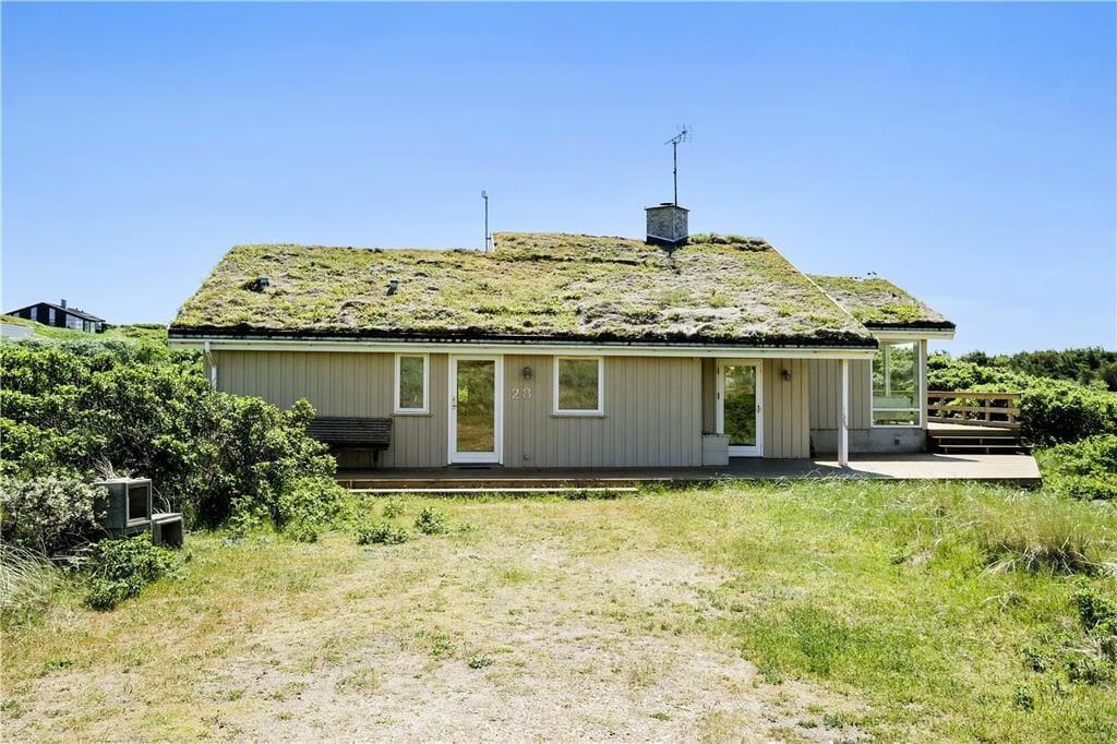 Med sit grønne tag og sin lyse facade passer sommerhuset perfekt ind i det naturskønne, kuperede klitlandskab. Inden døre er atmosfæren venlig og indbydende takket være de lyse farvetoner, de åbne rumforløb og den hyggelige indretning. Store vinduespartier inviterer dagslyset indenfor og giver udsigt til de flotte omgivelser – ikke mindst i opholdsafdelingen, hvor køkken og stue er integreret. På charmerende vis er rummet inddelt i to niveauer, og derudover kan I kravle helt til tops til husets hems. En brændeovn er her også, som står klar til at sprede varme og hygge på de kølige dage. Planløsningen byder desuden på et badeværelse og et gæstetoilet og endelig tre gode soveværelser, der i alt kan rumme otte personer.