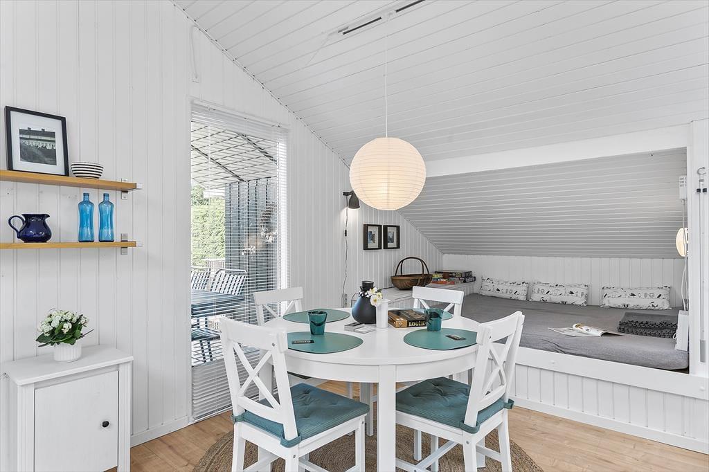 Atmosfæren er let og luftig inden døre i sommerhuset, der måler 64 m2 og har en glimrende planløsning til fire personer. I har også mulighed for at sove i stuens alkove, og om ikke andet passer den perfekt til en hurtig middagslur eller en eftermiddag på langs med en spændende roman. Stuen byder derudover på et hyggeligt sofaarrangement nær brændeovnen og et spisebord, der står praktisk placeret nær det pæne, åbne køkken. Den lyse og velfungerende indretningsstil pryder også badeværelset, der byder på bruser og vaskemaskine.