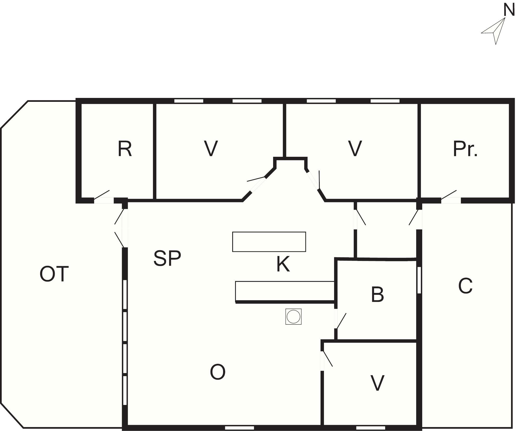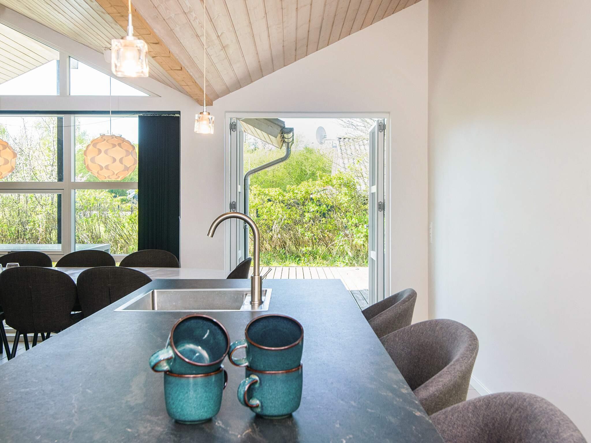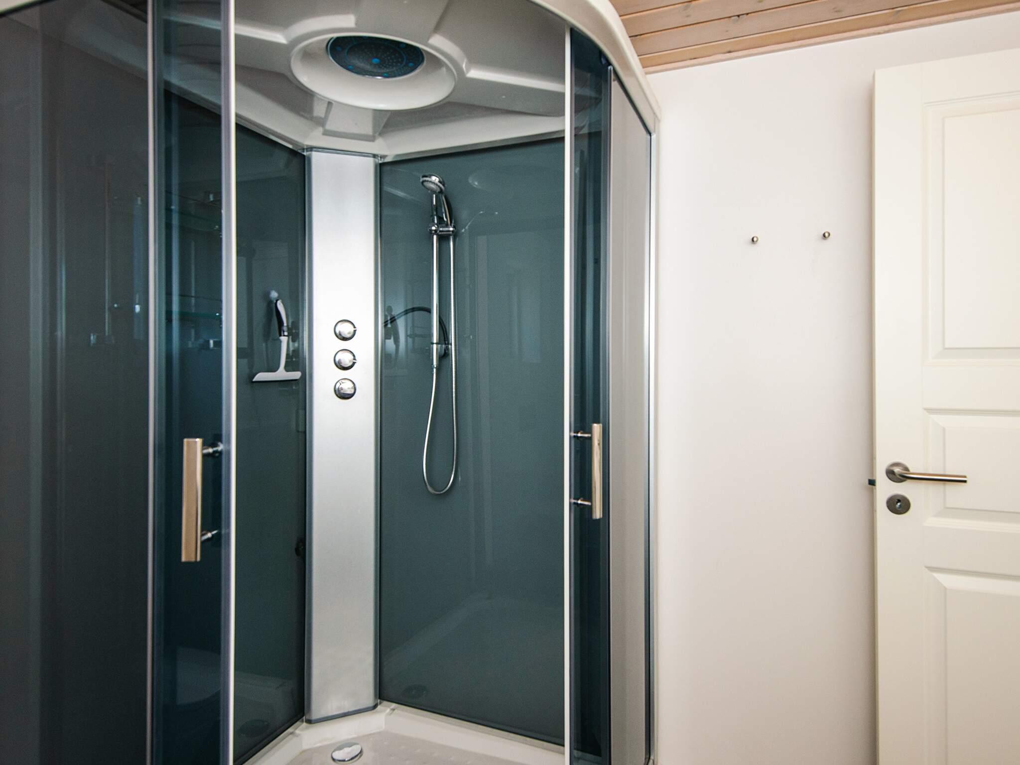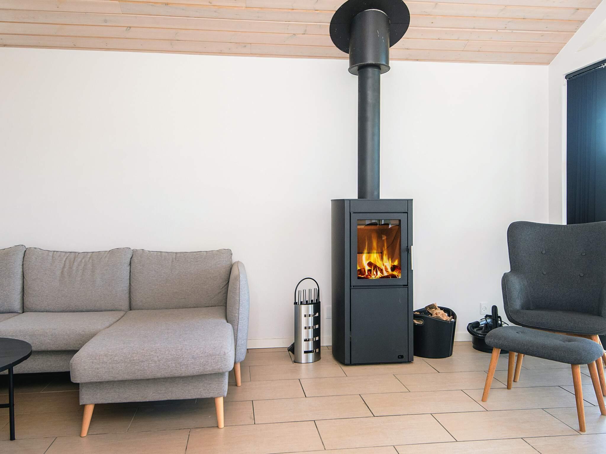 Overdækket terrasse beliggende i læ og med en sti for enden af vejen, der fører direkte ned til stranden ved Grønninghoved. Det kombinerede stue og køkken har panoramavinduer og udgang til terrassen. Den specielle brændeovn kan supplere gulvvarmen. Badeværelset tilbyer en lækker brusekabine til afslapning efter en aktiv dag, og derudover er der tre soveværelser med dobbeltsenge.
