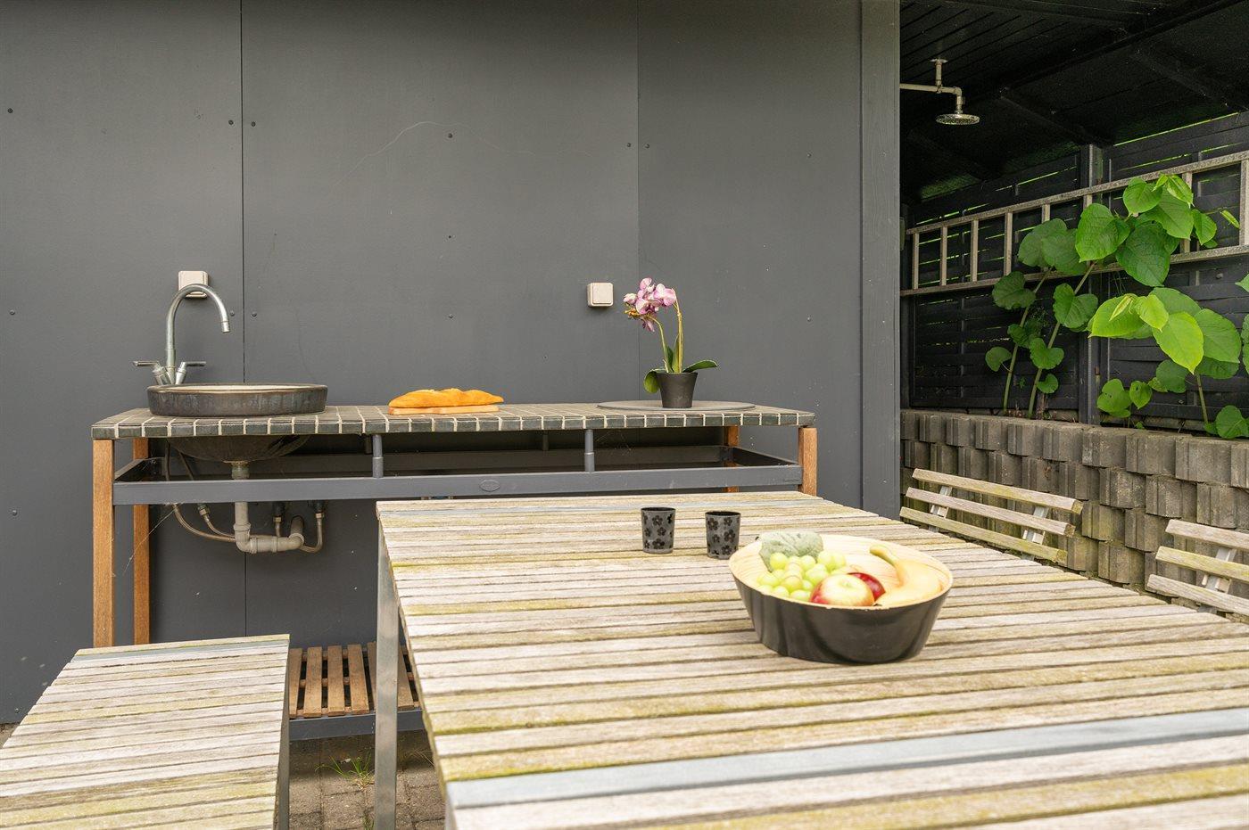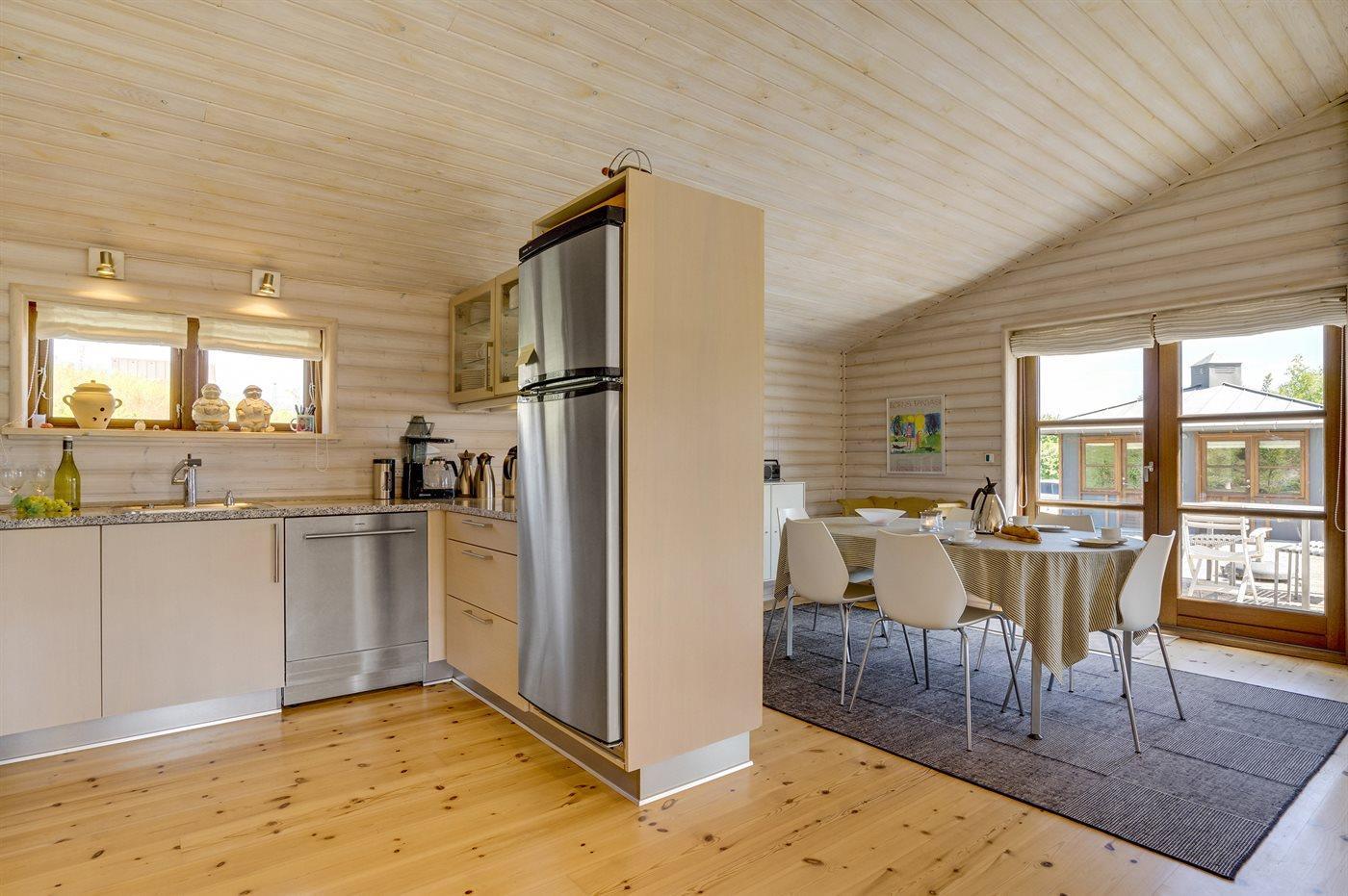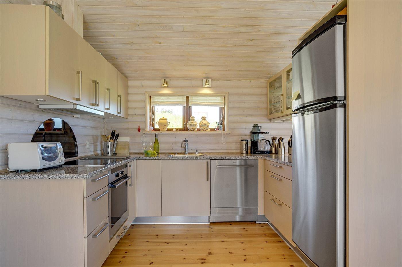 Køkkenet er udstyret med 1 køleskab. Der er 4 keramiske kogeplader, miniovn, varmluftovn samt opvaskemaskine.