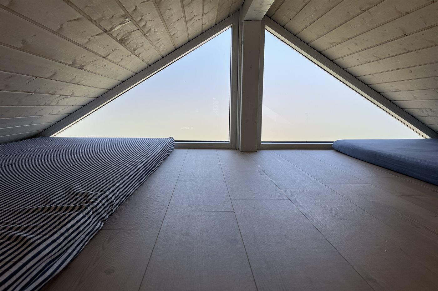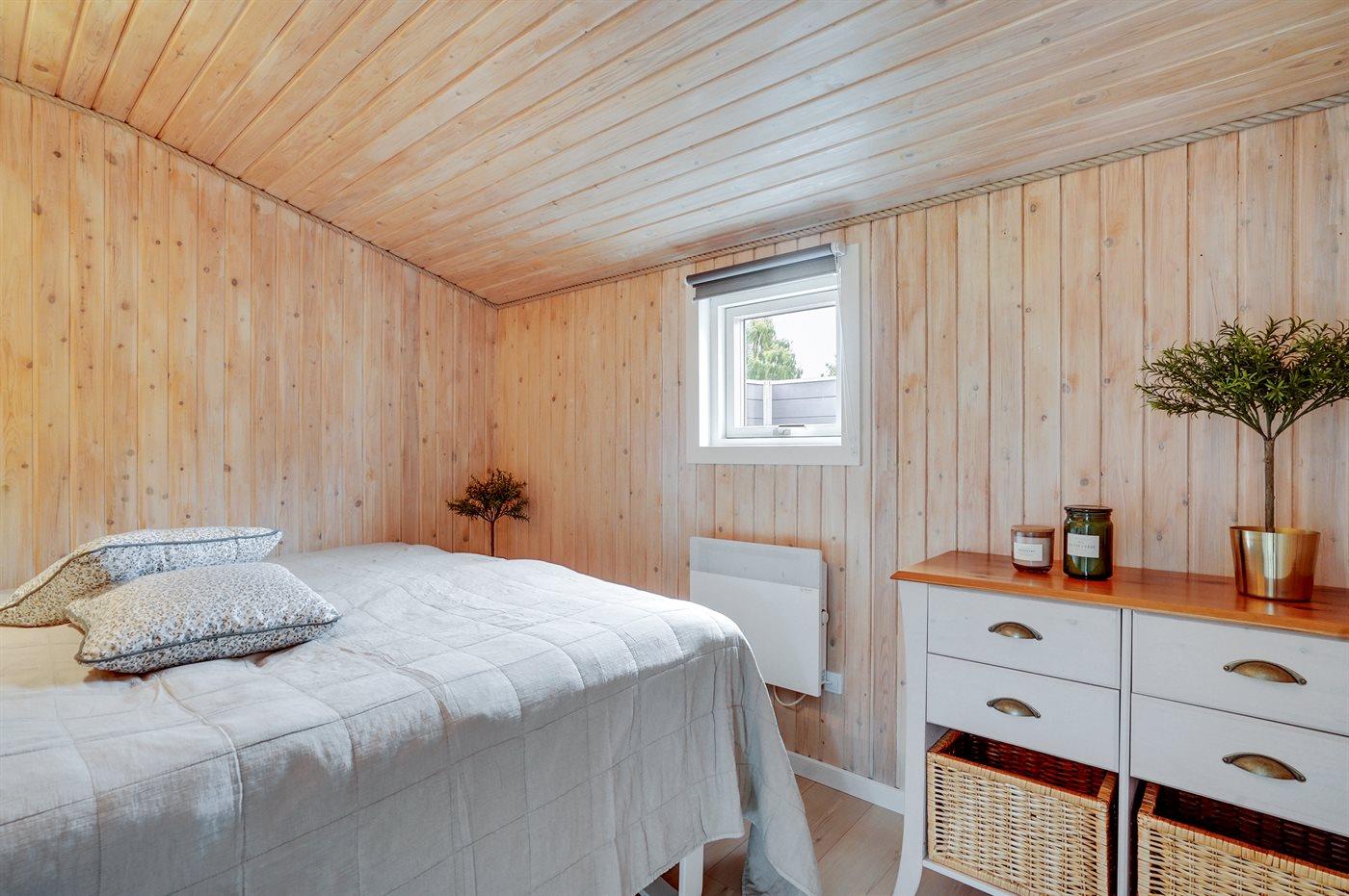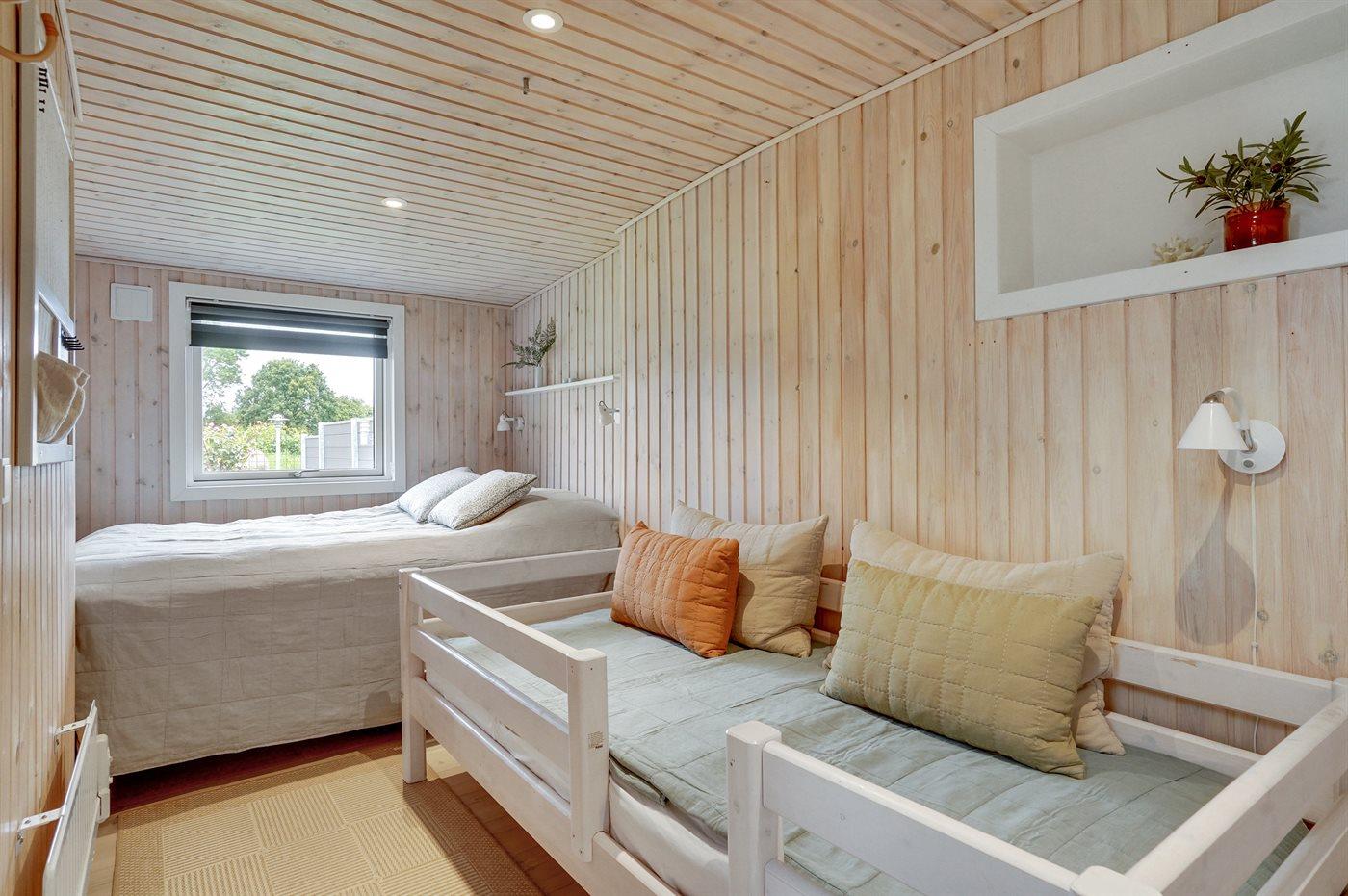 Der er i alt 2 soveværelser. Sovepladserne fordeler sig på: 4 sovepladser i dobbeltsenge. 1 soveplads i enkeltseng. 2 sovepladser på madrasser. 2 af disse sovepladser befinder sig på husets hems. Derudover er der 1 stk. barneseng.