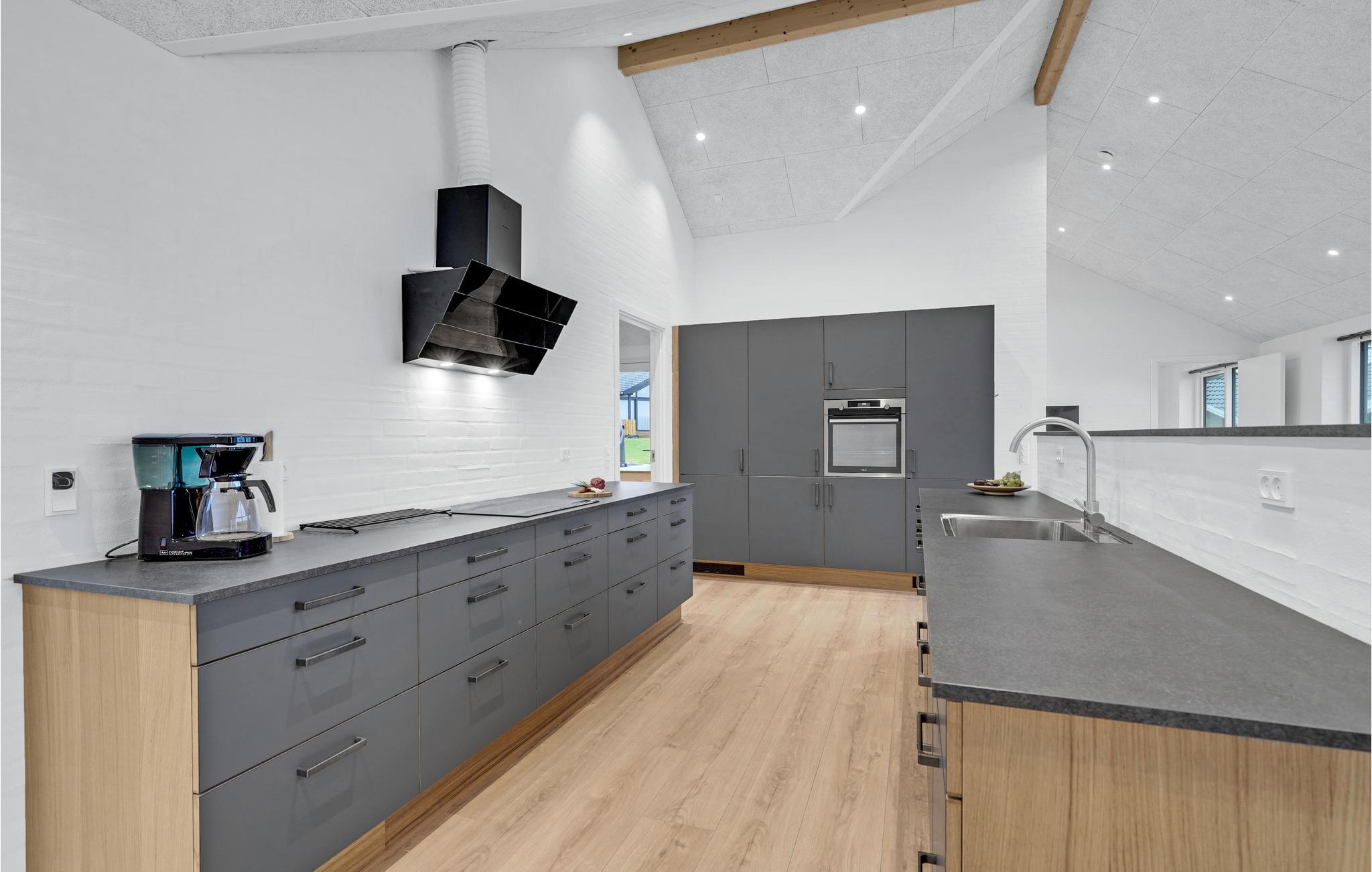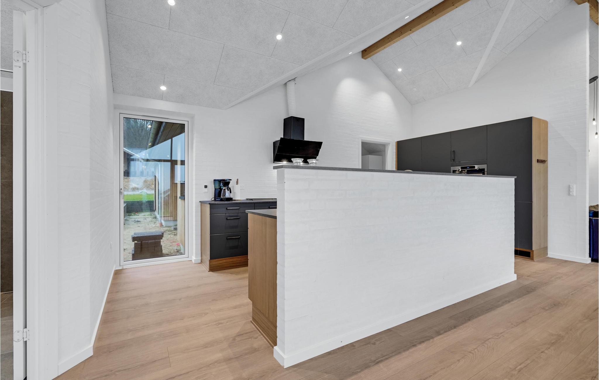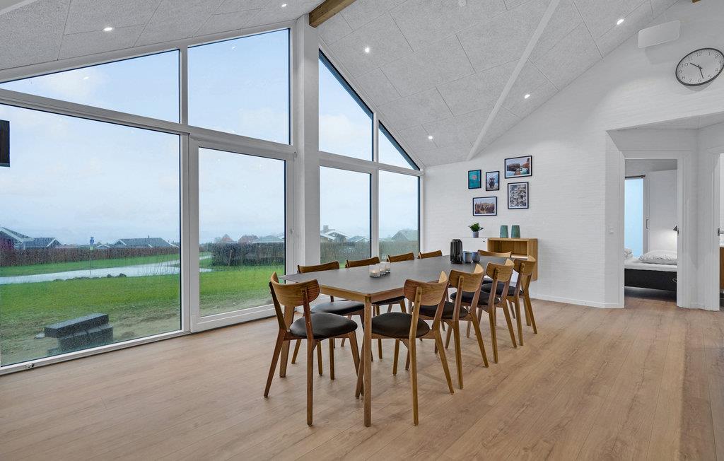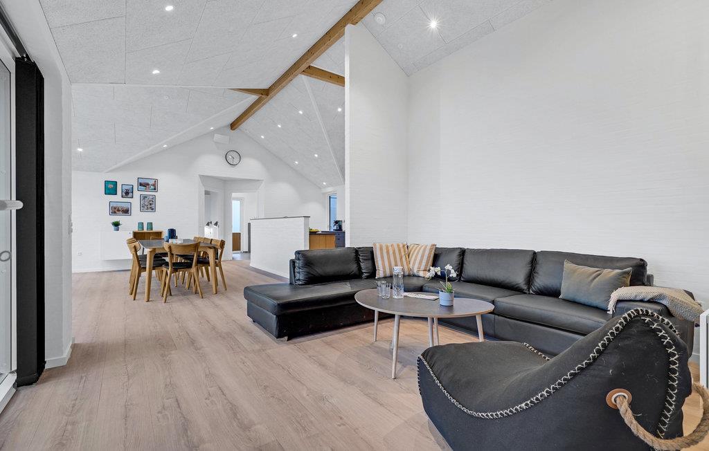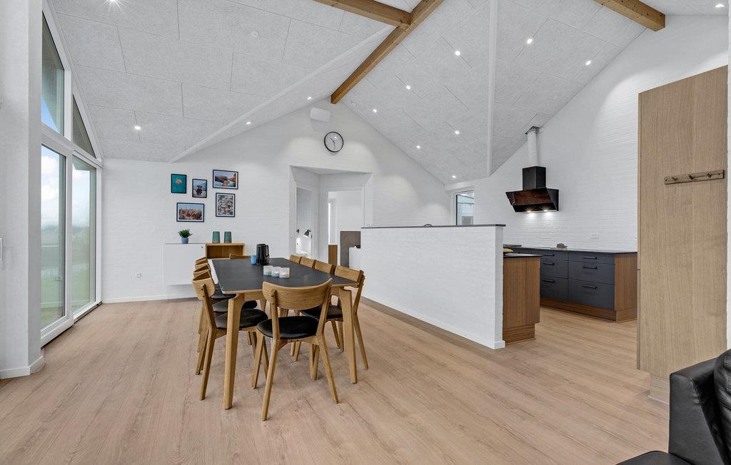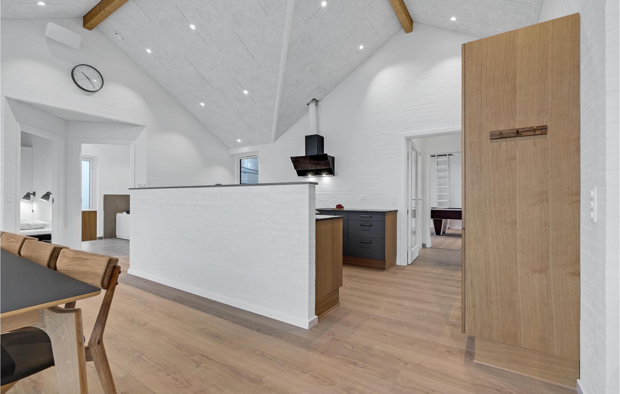 Dette feriehus har en moderne atmosfære og fremstår flot med gode, lyst indrettede rum, fine detaljer i træ og møbler af høj kvalitet. De høje lofter og store vinduespartier sørger for, at der kommer masser af lys ind indenfor. Den åbne opholdsstue med spiseplads og stort køkken garanterer hyggelige stunder med familie eller venner.