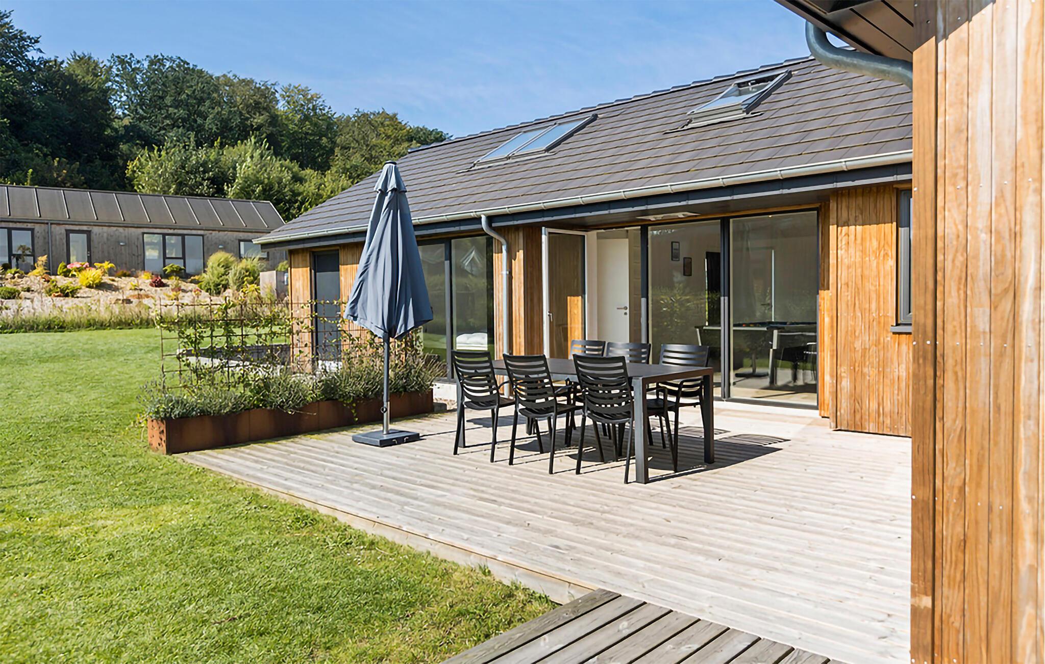 Lyst og familievenligt feriehus med spa og stor terrasse tæt på strand og natur.