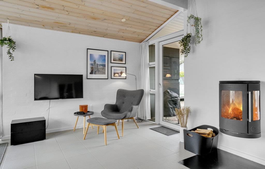 De store vinduer i huset lukker masser af lys ind og giver jer dejlig udsigt til omgivelserne. Om aftenen kan I sætte jer til rette i den store sofa og lytte til den knitrende ild i brændeovnen.