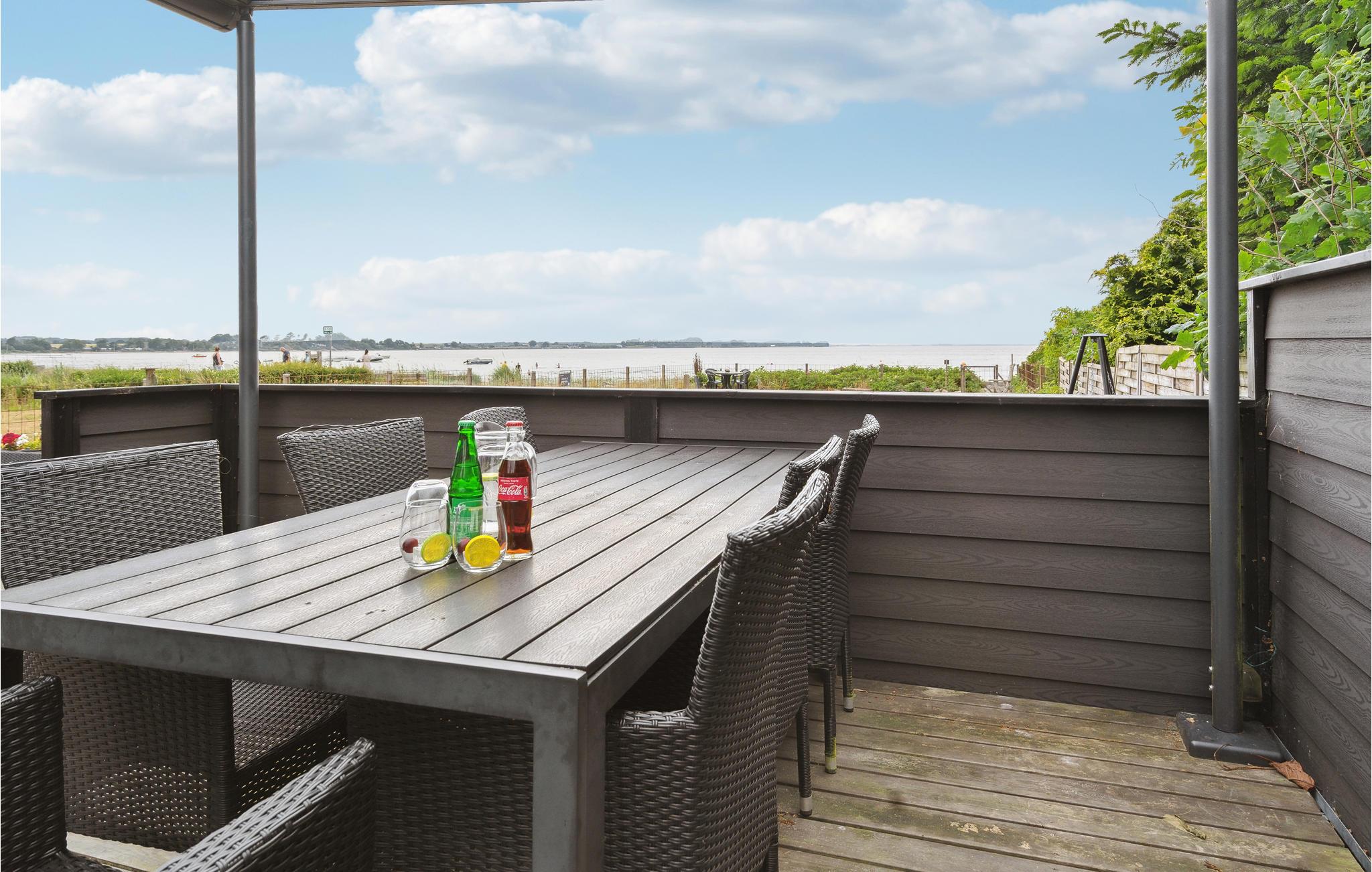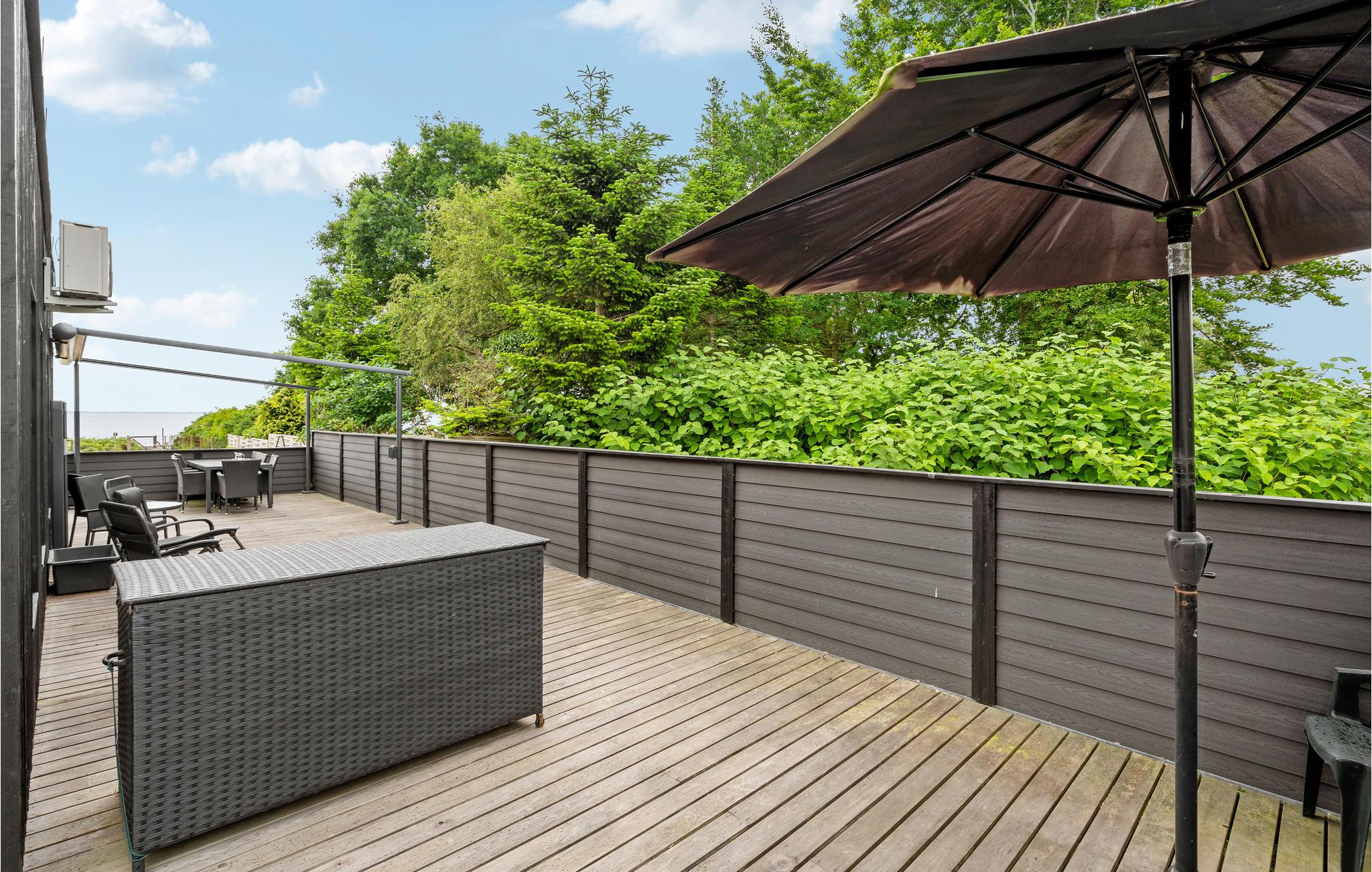 Hyggeligt feriehus i første række ved Grønninghoved strand med stor terrasse og panoramaudsigt over vandet.