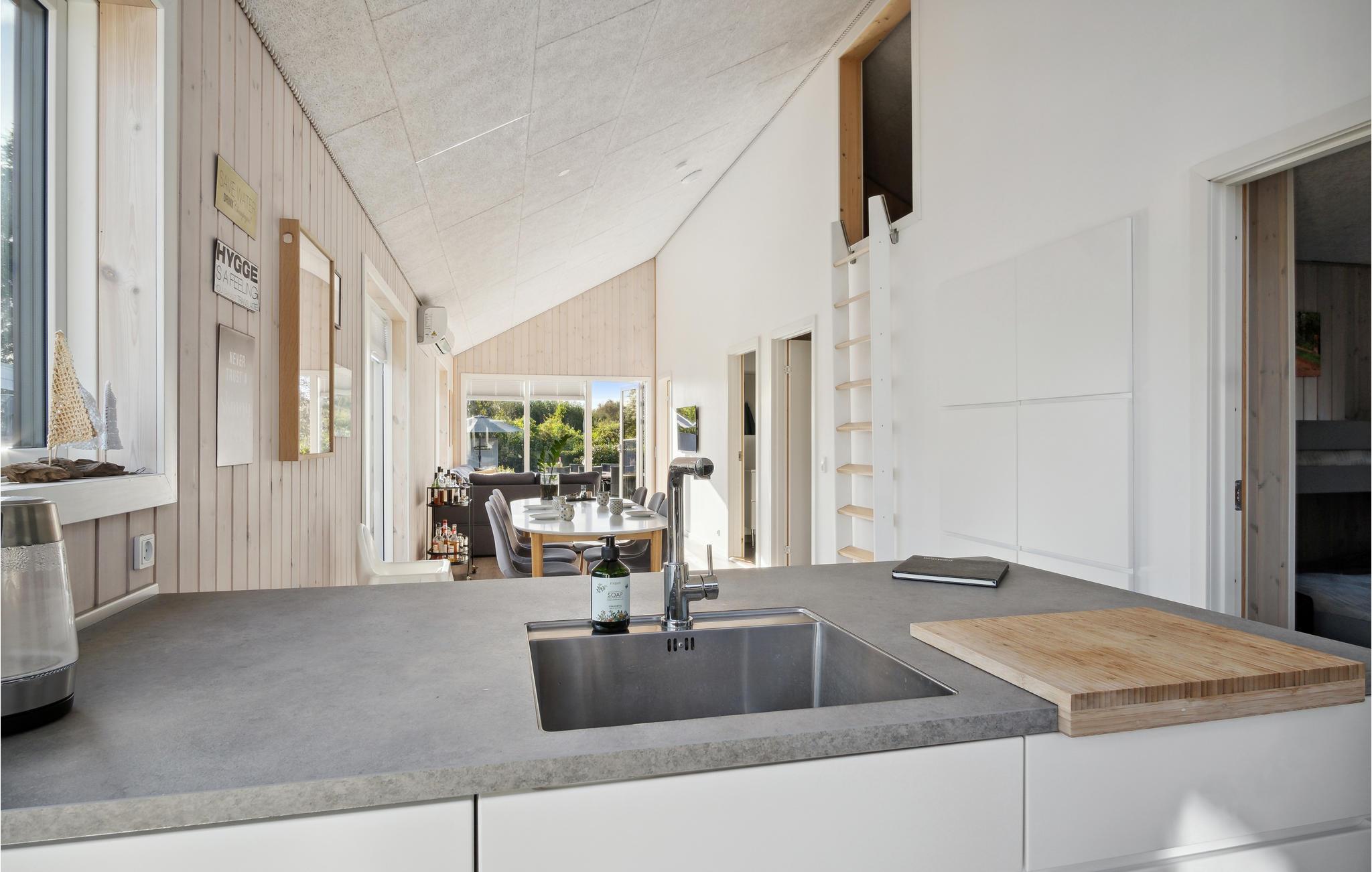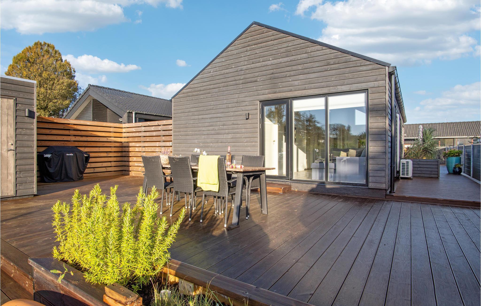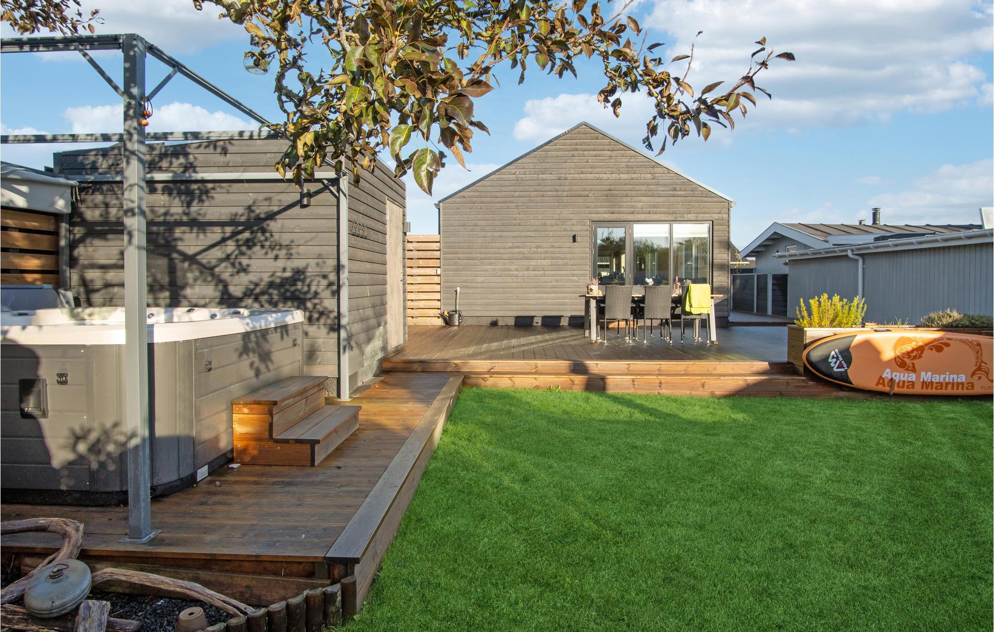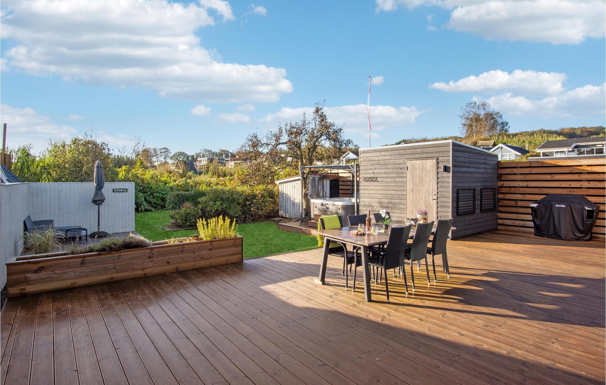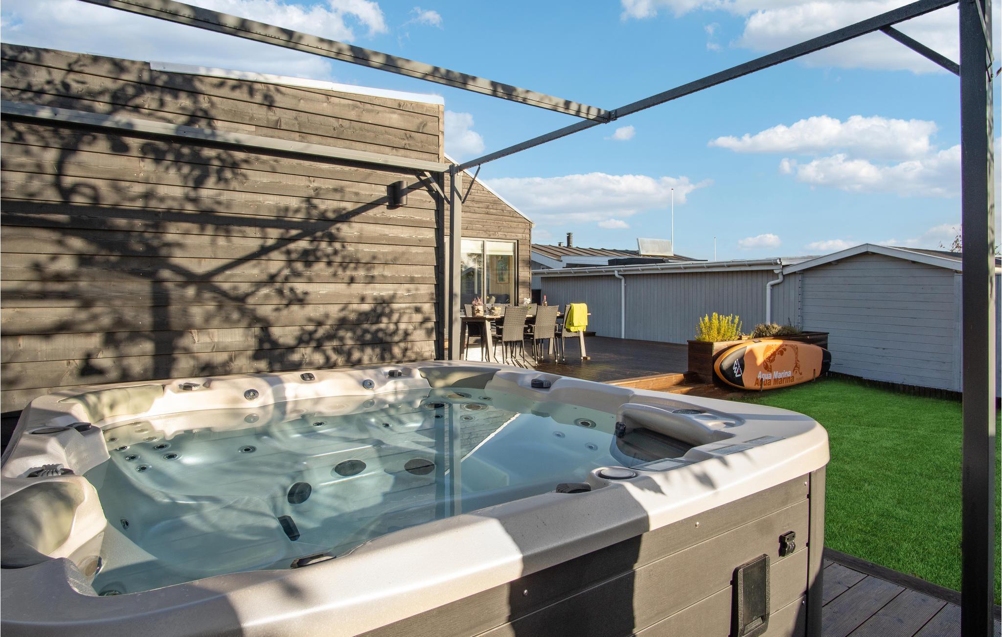 Dette skønne feriehus byder jer og jeres nærmeste velkommen med høj komfort. Den moderne arkitektoniske stil med mange vinduer giver masser af naturligt lys indenfor og inviterer jer til at smække fødderne op i sofaen, lave mad sammen og spille kort ved spisebordet. Ud over interiøret er haven og udendørsområdet også iøjnefaldende. Her kan I se frem til en stor træterrasse, der omgiver huset, så I kan nyde solen såvel om morgenen som også om eftermiddagen. Om aftenen kan grillmestrene tænde op i grillen, mens resten af familien slapper af i spabadet, og børnene løber rundt på græsplænen. I befinder jer meget tæt på den børnevenlige strand med roligt vand.