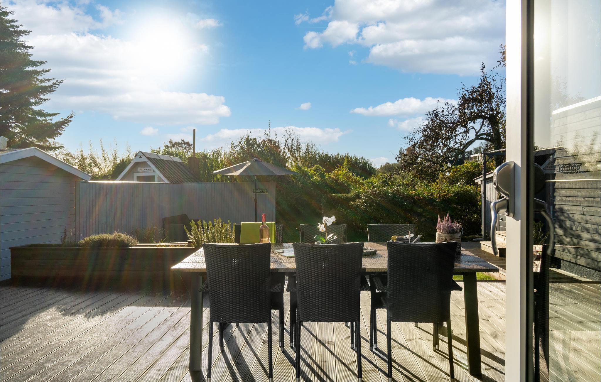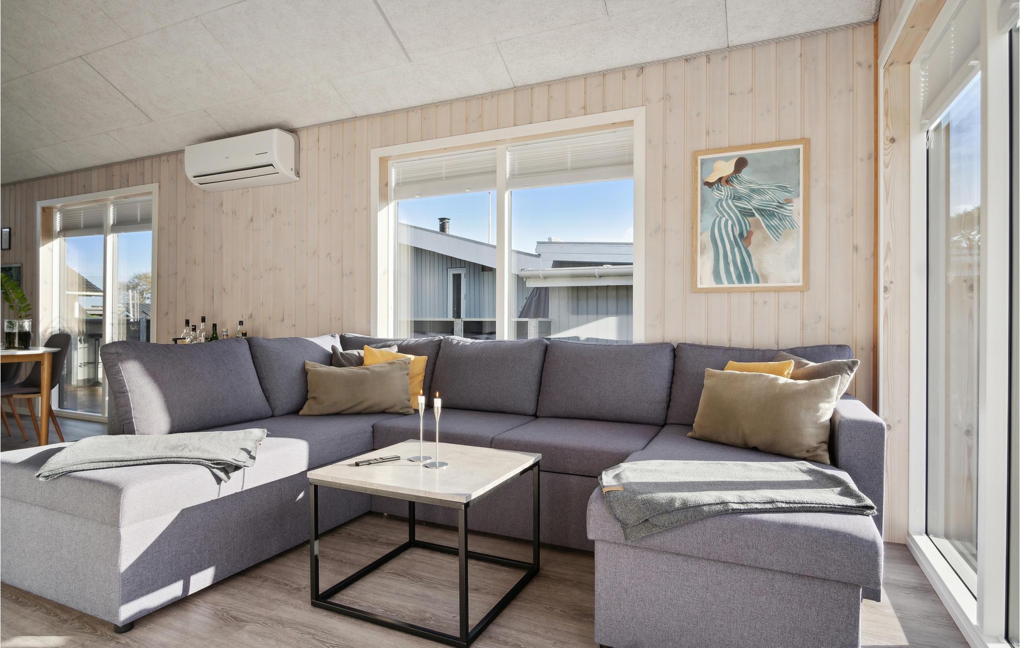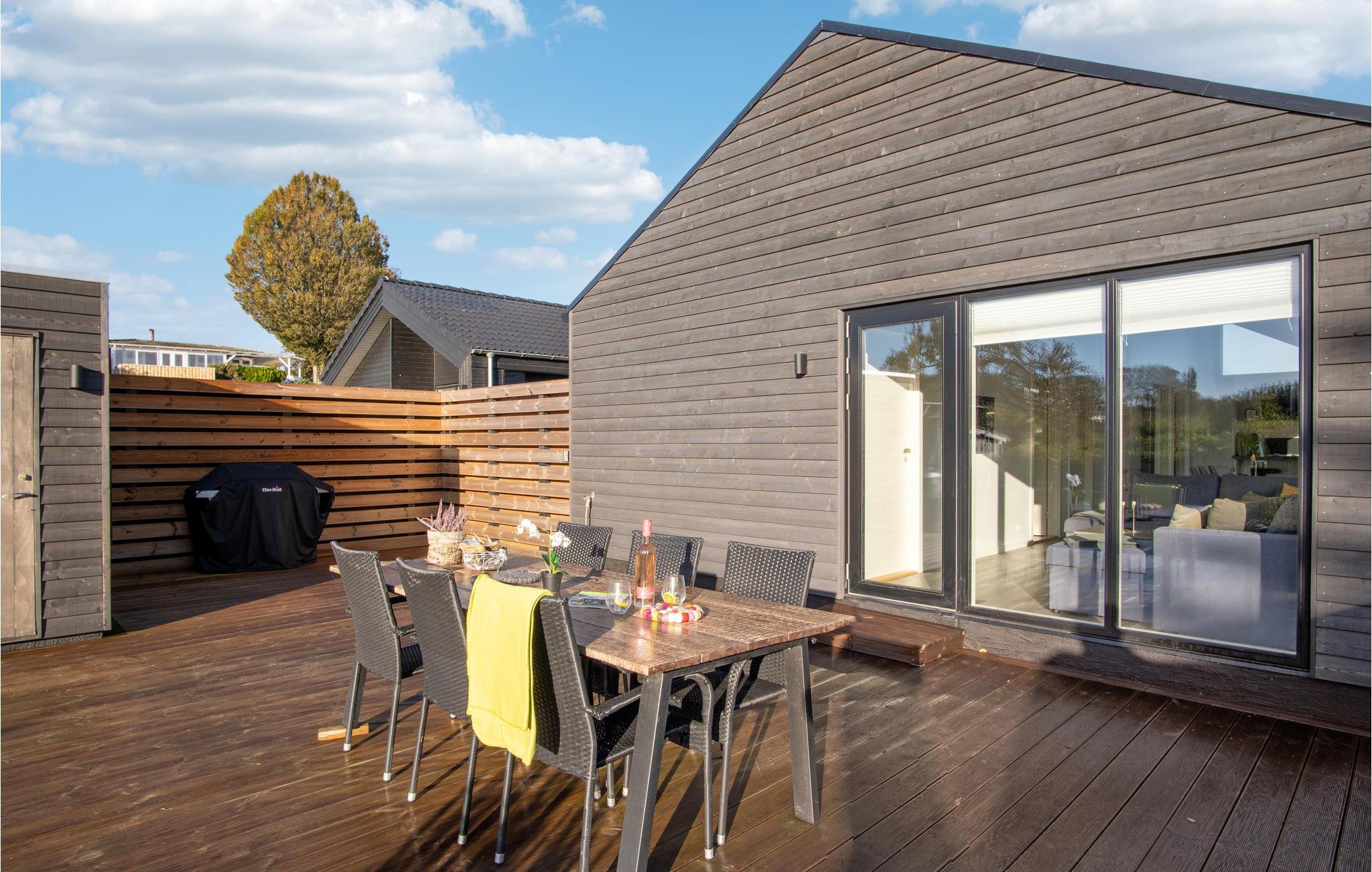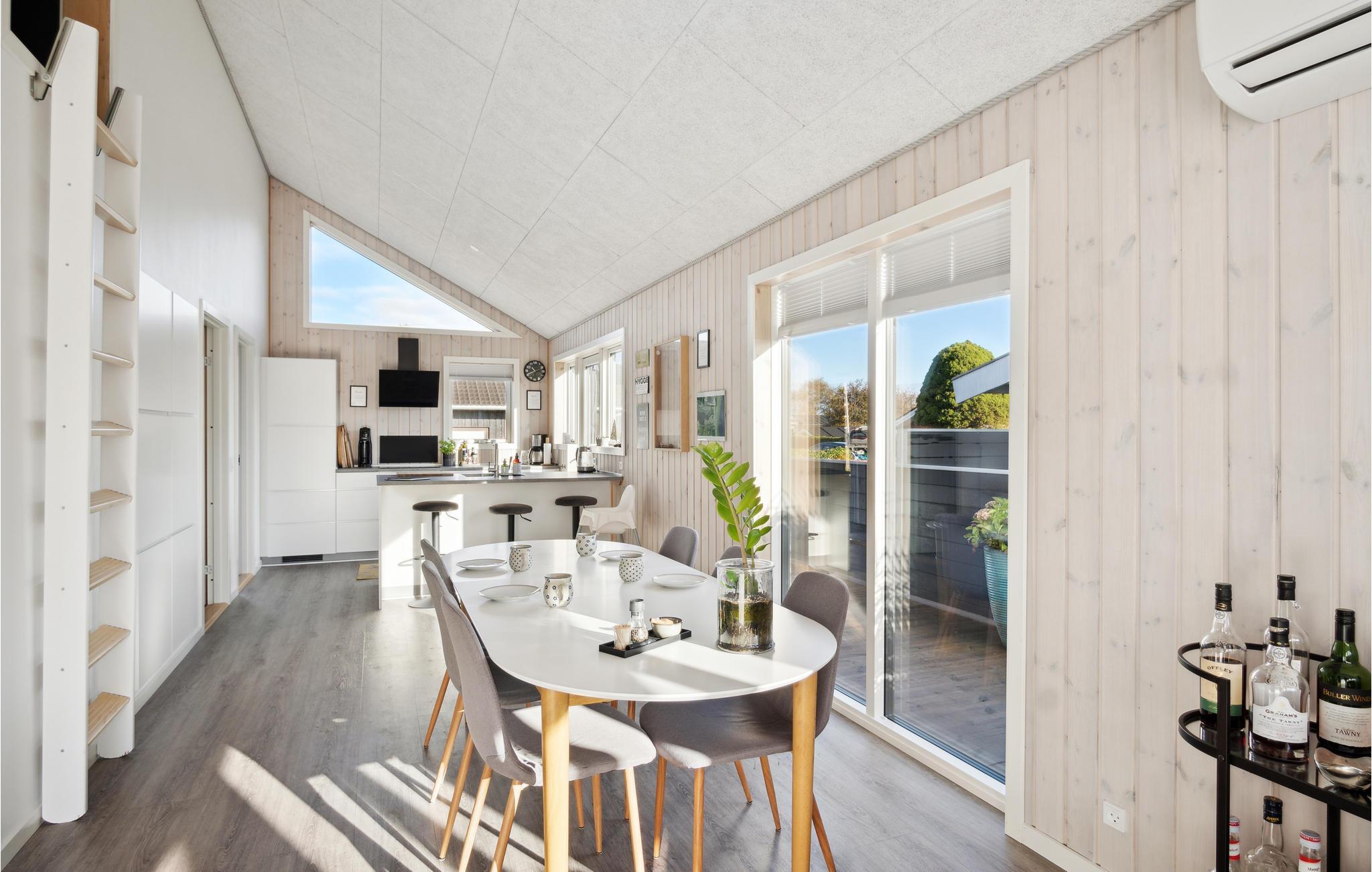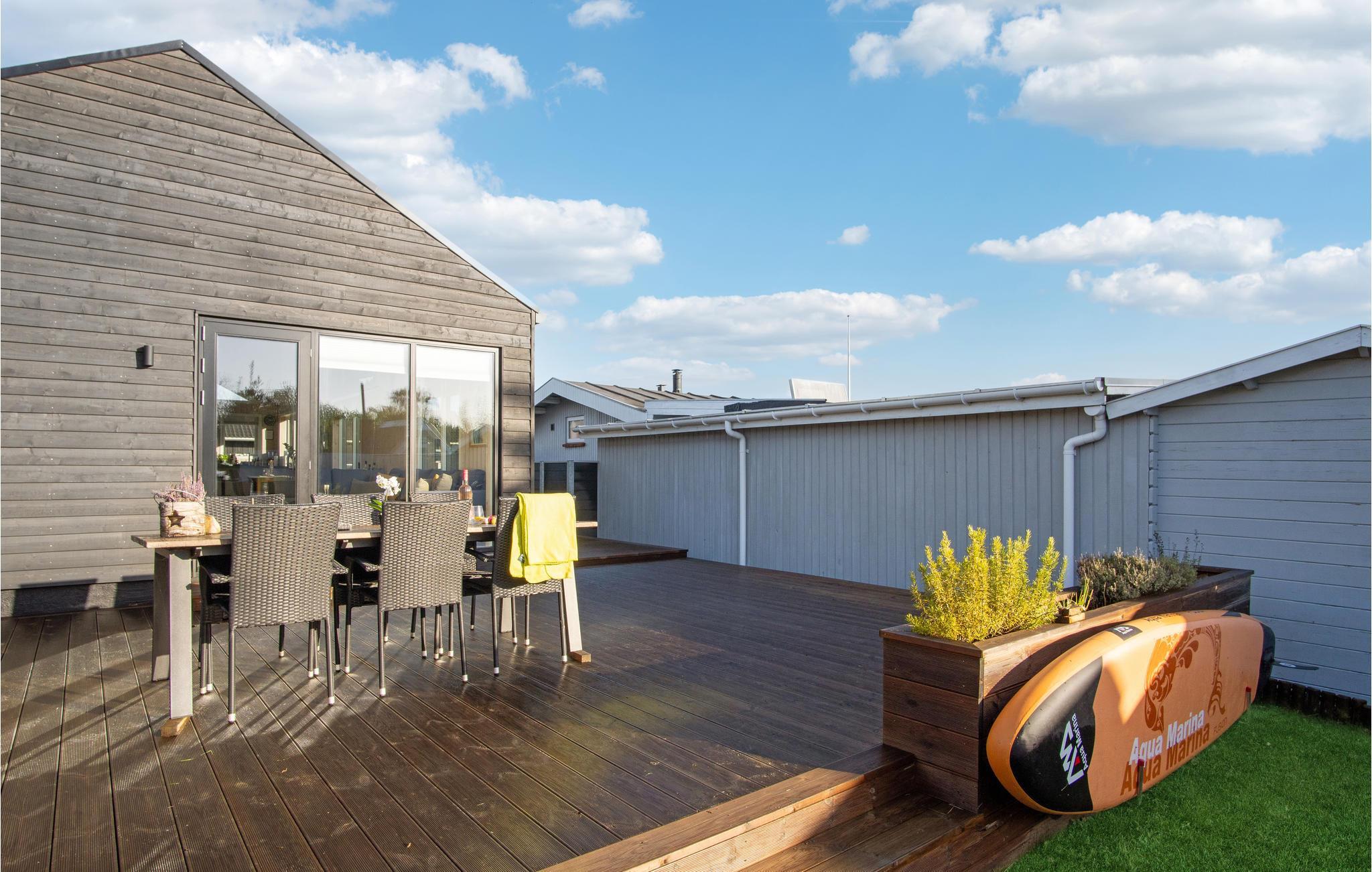 Dette skønne feriehus byder jer og jeres nærmeste velkommen med høj komfort. Den moderne arkitektoniske stil med mange vinduer giver masser af naturligt lys indenfor og inviterer jer til at smække fødderne op i sofaen, lave mad sammen og spille kort ved spisebordet. Ud over interiøret er haven og udendørsområdet også iøjnefaldende. Her kan I se frem til en stor træterrasse, der omgiver huset, så I kan nyde solen såvel om morgenen som også om eftermiddagen. Om aftenen kan grillmestrene tænde op i grillen, mens resten af familien slapper af i spabadet, og børnene løber rundt på græsplænen. I befinder jer meget tæt på den børnevenlige strand med roligt vand.