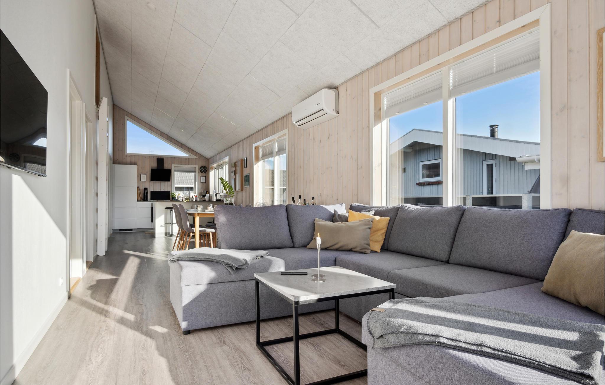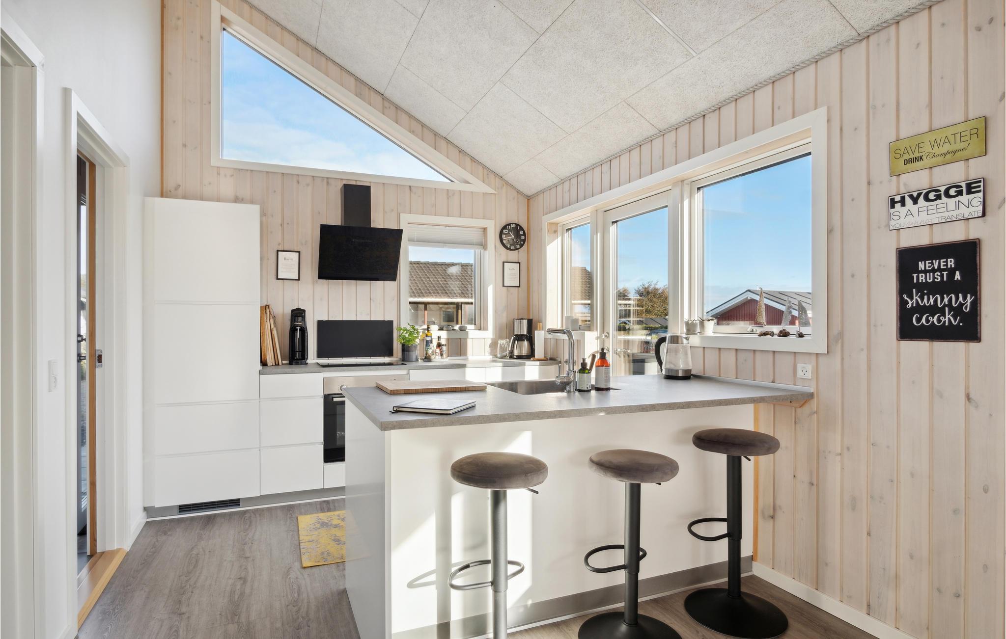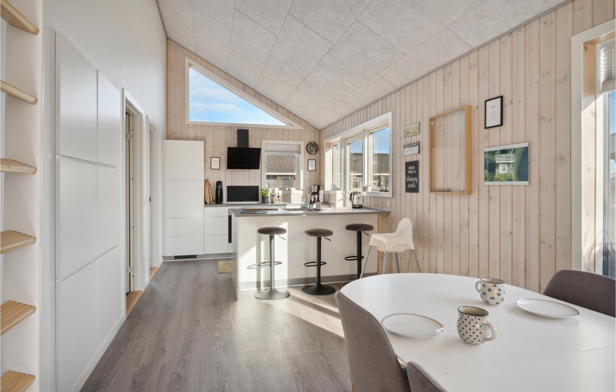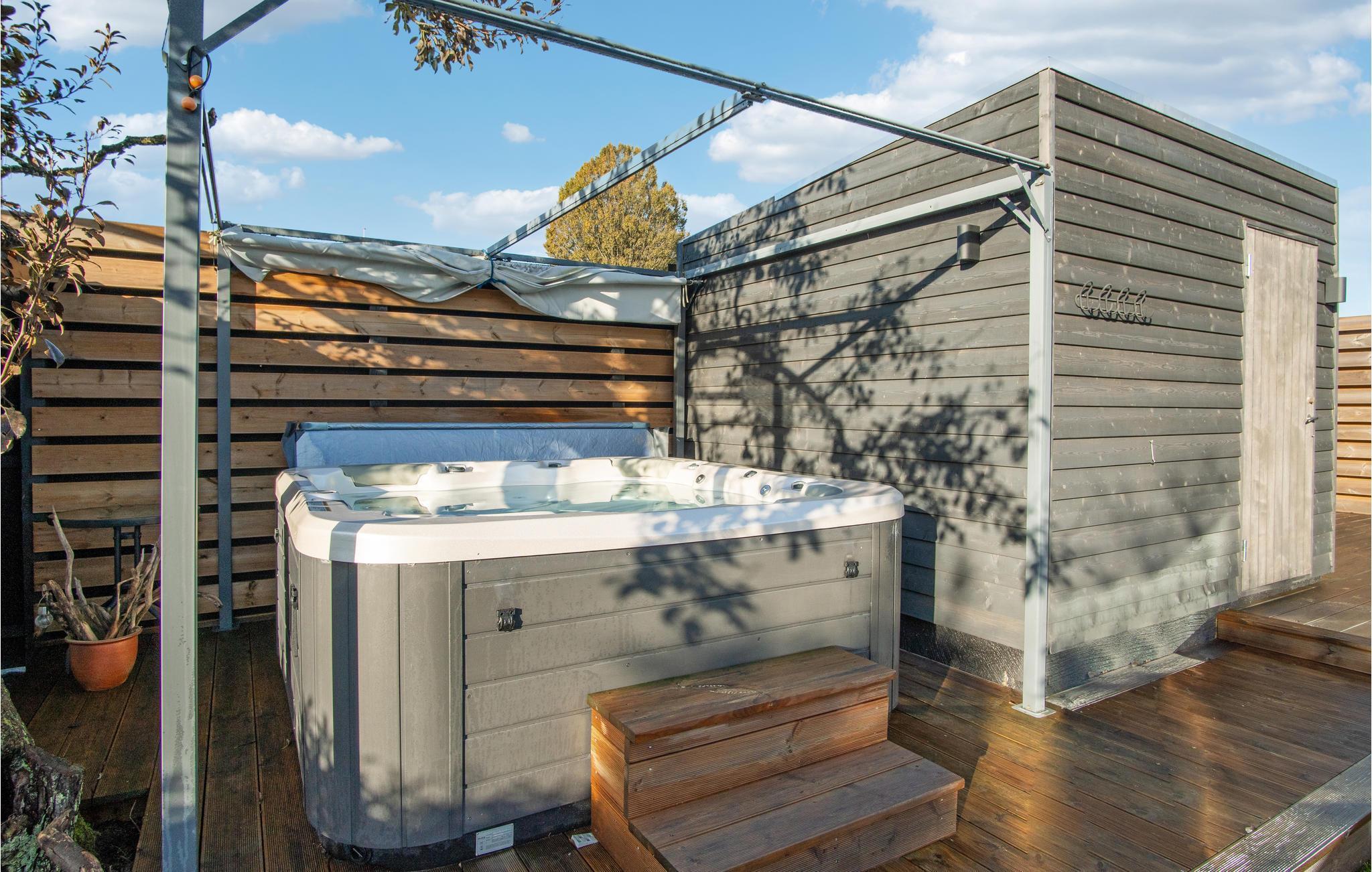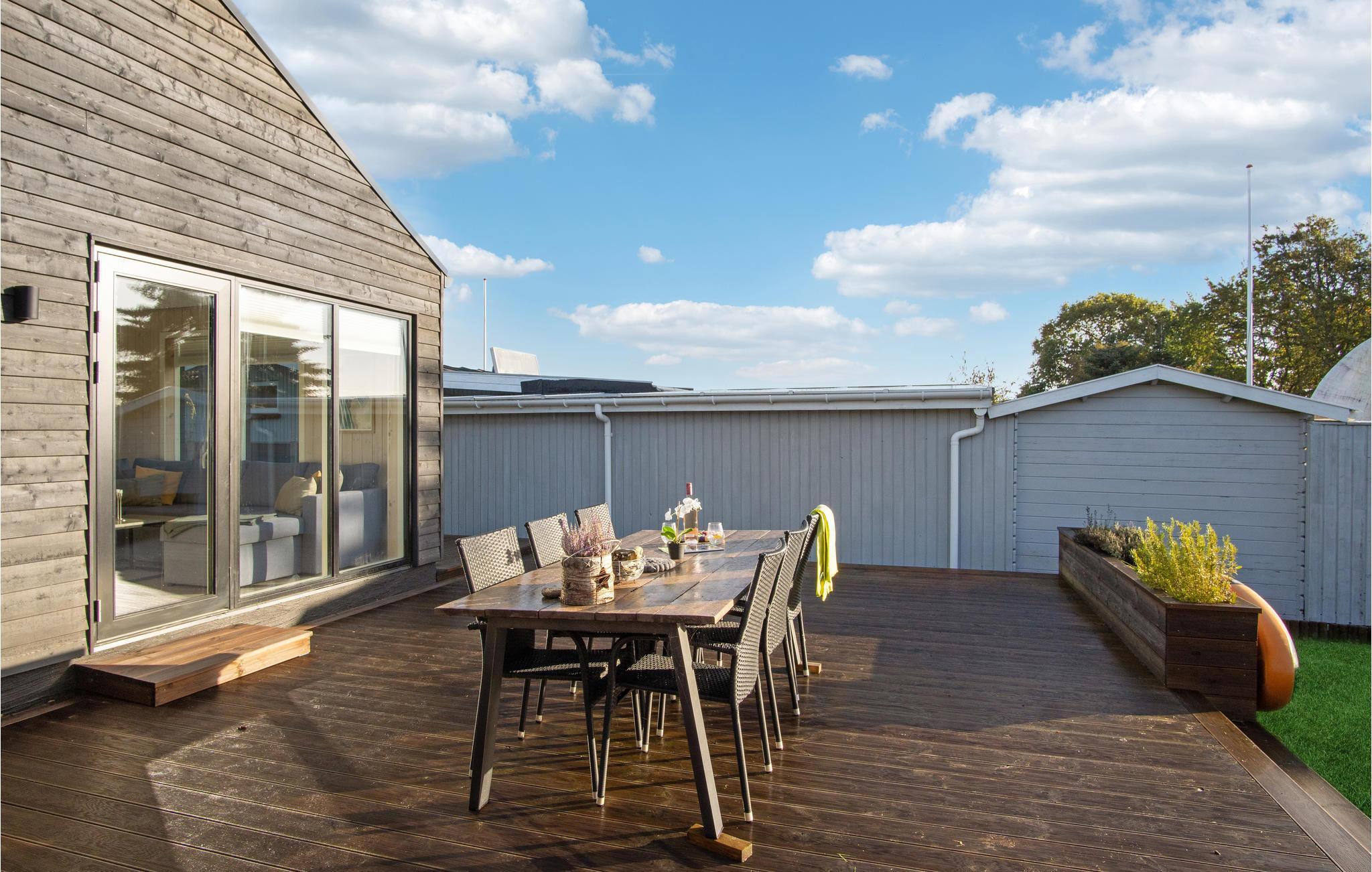 Dette skønne feriehus byder jer og jeres nærmeste velkommen med høj komfort. Den moderne arkitektoniske stil med mange vinduer giver masser af naturligt lys indenfor og inviterer jer til at smække fødderne op i sofaen, lave mad sammen og spille kort ved spisebordet. Ud over interiøret er haven og udendørsområdet også iøjnefaldende. Her kan I se frem til en stor træterrasse, der omgiver huset, så I kan nyde solen såvel om morgenen som også om eftermiddagen. Om aftenen kan grillmestrene tænde op i grillen, mens resten af familien slapper af i spabadet, og børnene løber rundt på græsplænen. I befinder jer meget tæt på den børnevenlige strand med roligt vand.