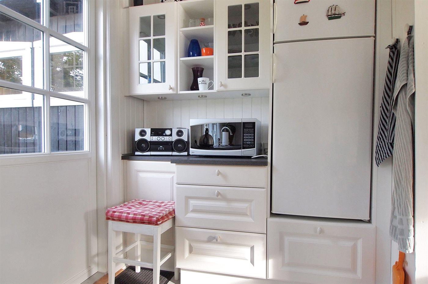Køkkenet er udstyret med 1 køleskab. Der er 4 keramiske kogeplader, varmluftovn, mikrobølgeovn samt opvaskemaskine.