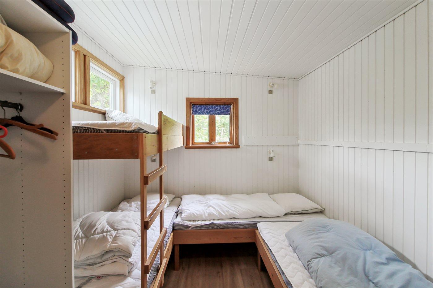 Der er i alt 2 soveværelser. Sovepladserne fordeler sig på: 2 sovepladser i dobbeltseng. 1 soveplads i enkeltseng. 4 sovepladser i køjesenge. Derudover er der 1 stk. barneseng.