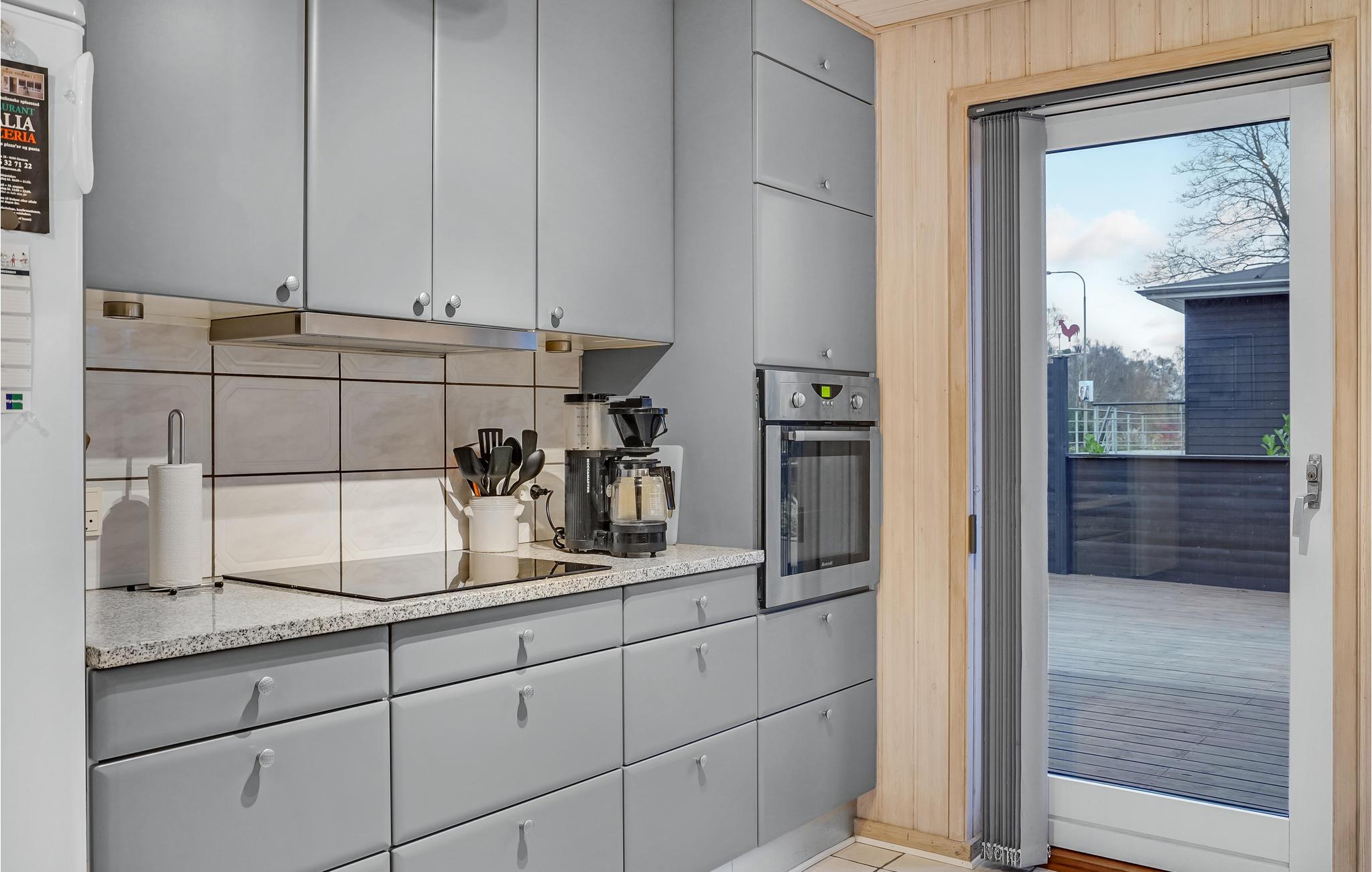Nyd det lyse, åbne køkken-alrum, og hyg jer sammen i den rummelige opholdsstue. Tag plads i sofaerne, og tænd op i brændeovnen, som skaber en behagelig varme på køligere aftener. Tilbered jeres måltider i det moderne køkken, der byder på god bordplads og direkte adgang til terrassen. Tilbring hyggelige aftener ved spisebordet, hvor der er plads til hele familien.