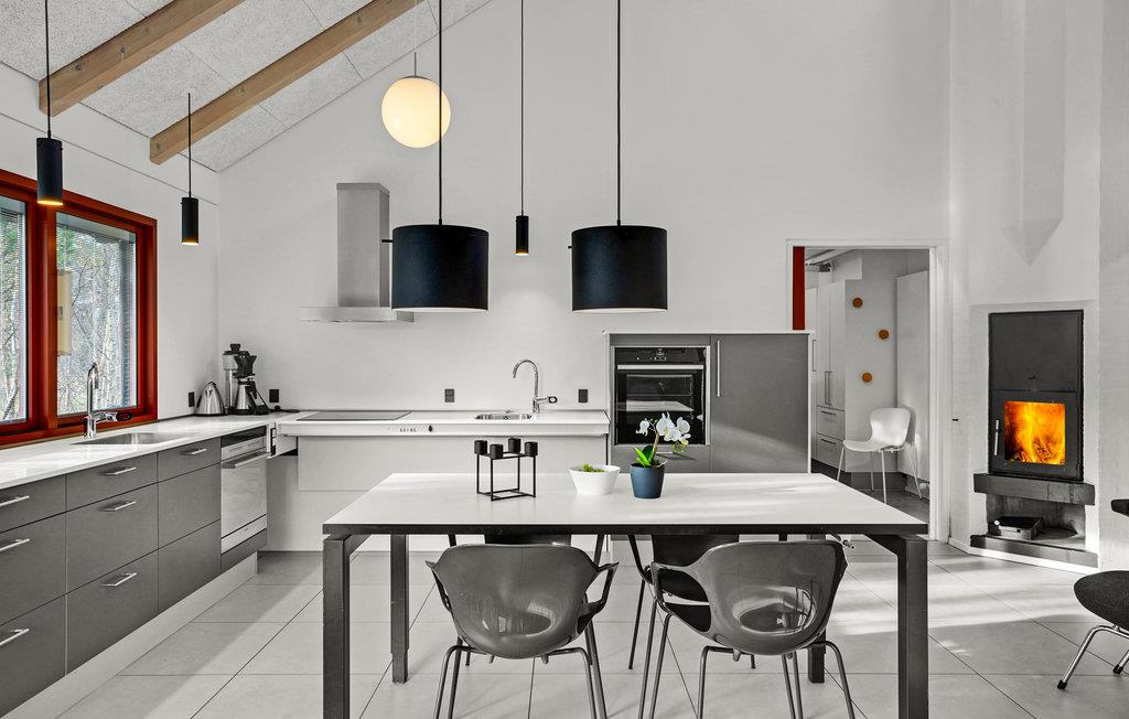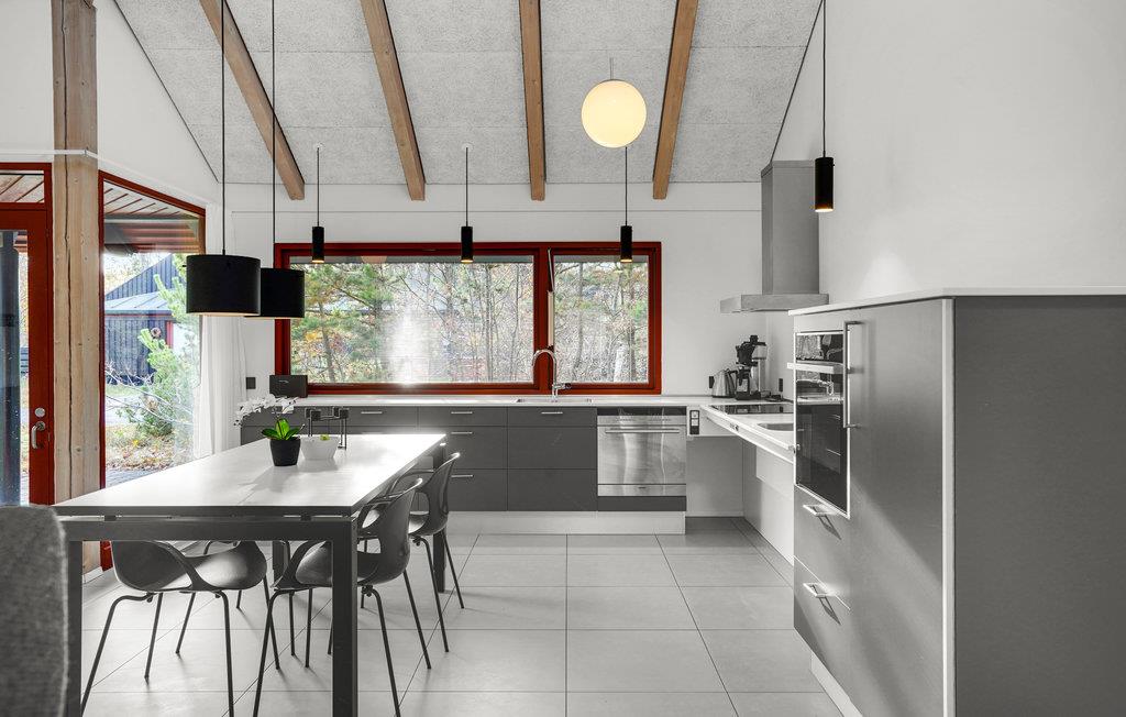 Dette lyse og venlige feriehus kan rumme op mod fem gæster og et lille barn. Huset er praktisk indrettet med gode detaljer som et stort opholdsrum, hvor I både kan sammensætte dagens menu og slappe af, mens ilden knitrer i brændeovnen. Vinduespartierne sørger for et skønt, naturligt lysindfald, hvilket giver jer ekstra behagelige rammer om indendørshyggen.