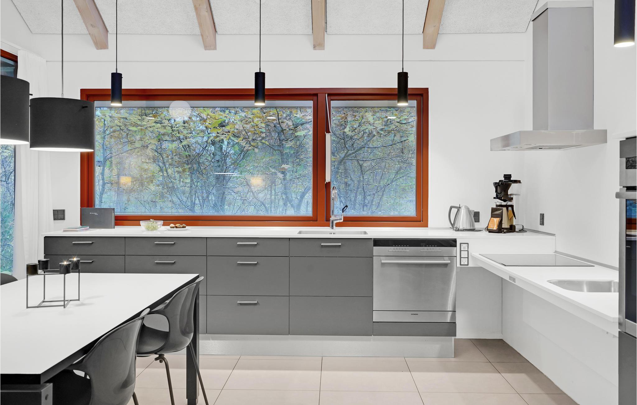 Dette lyse og venlige feriehus kan rumme op mod fem gæster og et lille barn. Huset er praktisk indrettet med gode detaljer som et stort opholdsrum, hvor I både kan sammensætte dagens menu og slappe af, mens ilden knitrer i brændeovnen. Vinduespartierne sørger for et skønt, naturligt lysindfald, hvilket giver jer ekstra behagelige rammer om indendørshyggen.