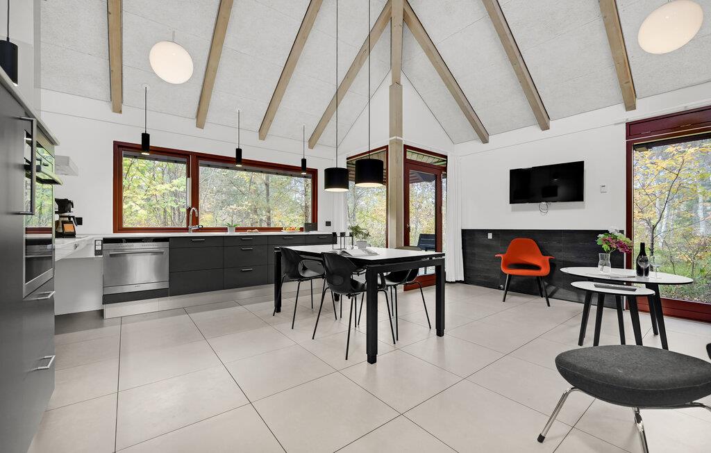 Dette lyse, indbydende og praktiske sommerhus byder op til fem gæster og et barn velkommen. Det har en hyggelig stue med køkken, hvor I kan slappe af foran brændeovnen. Der strømmer dejligt meget lys ind gennem de store vinduespartier.