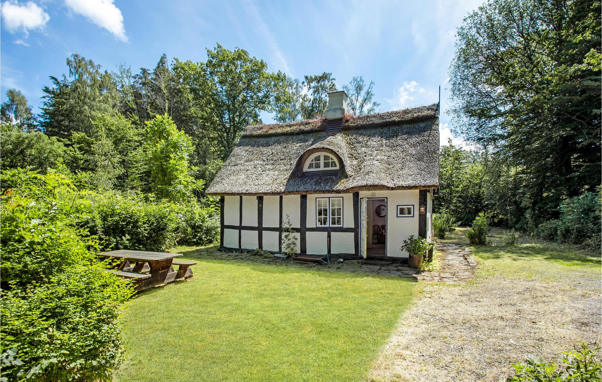 Charmerende bindingsværkshus med stråtag og brændeovn nær idylliske Gudhjem, perfekt til en afslappende ferie i rolige omgivelser.