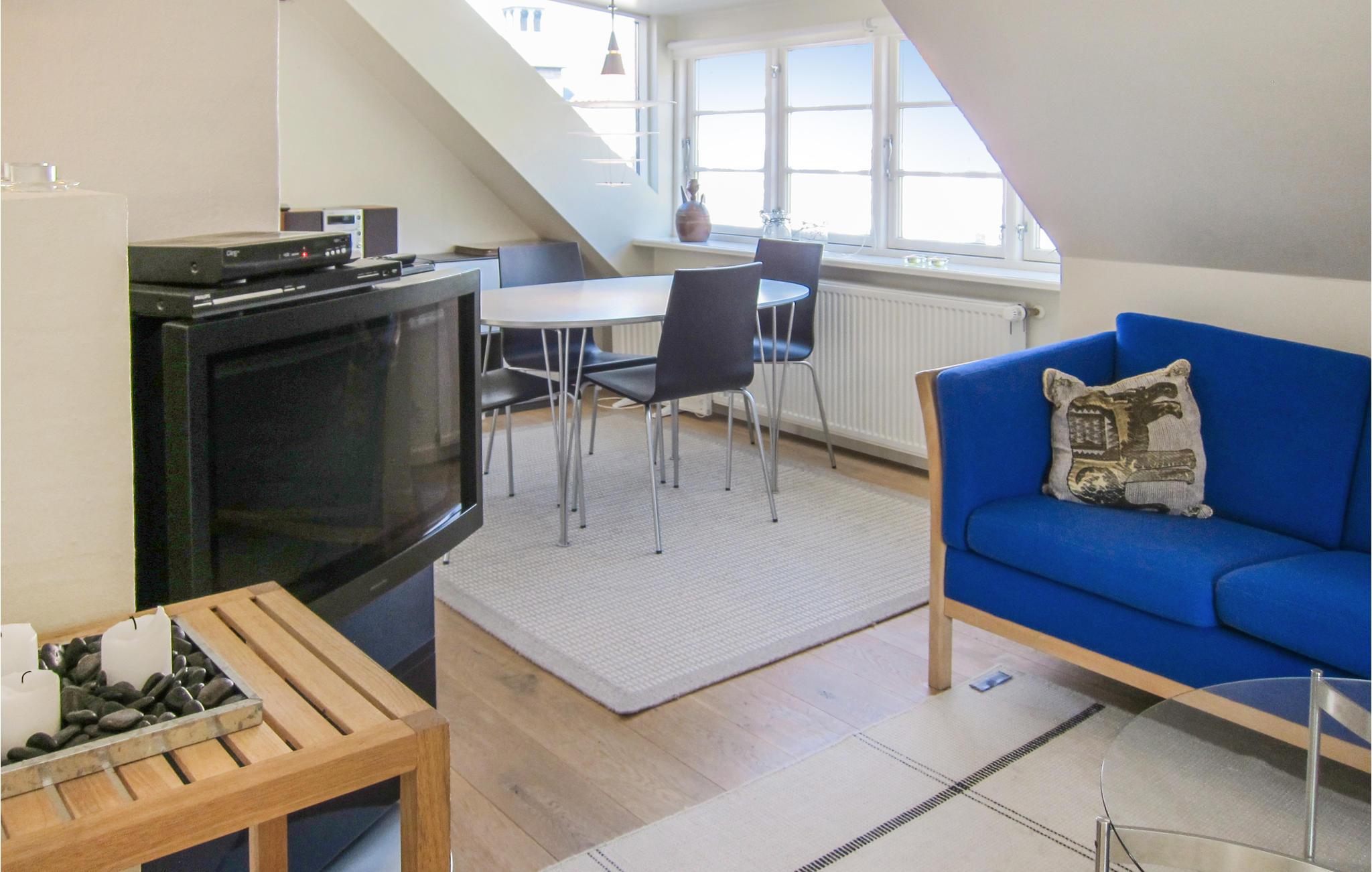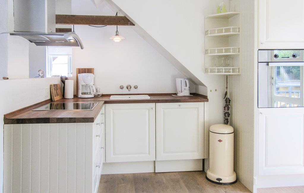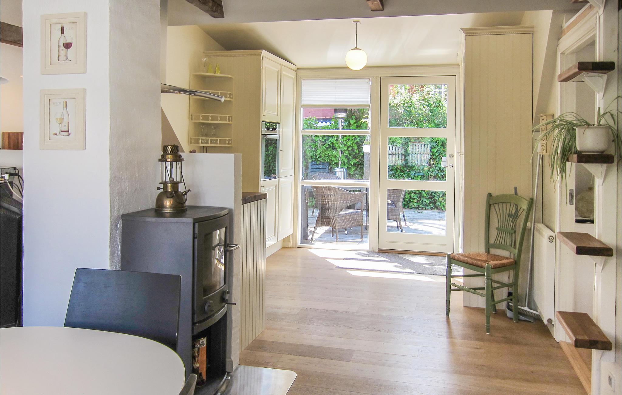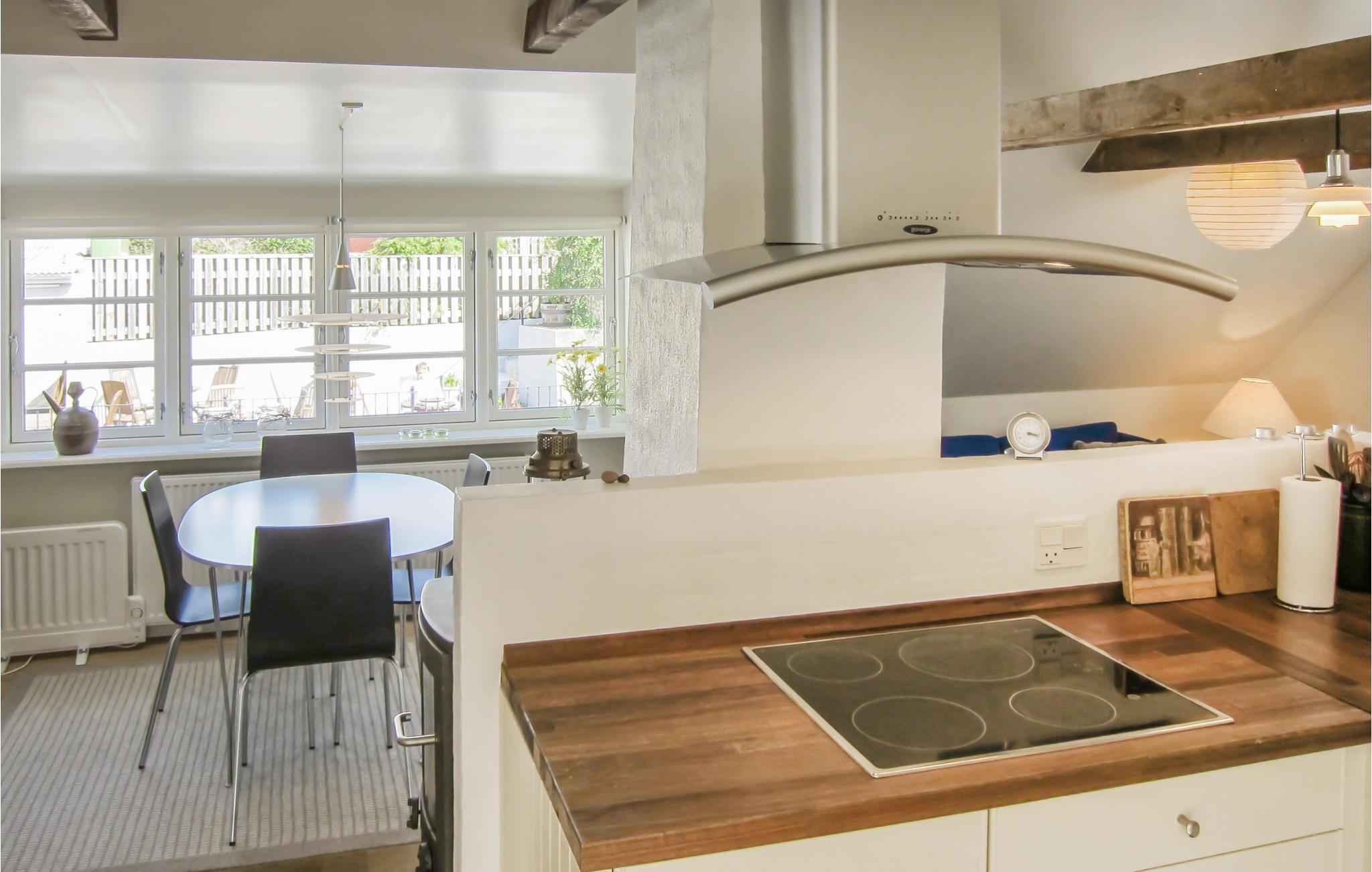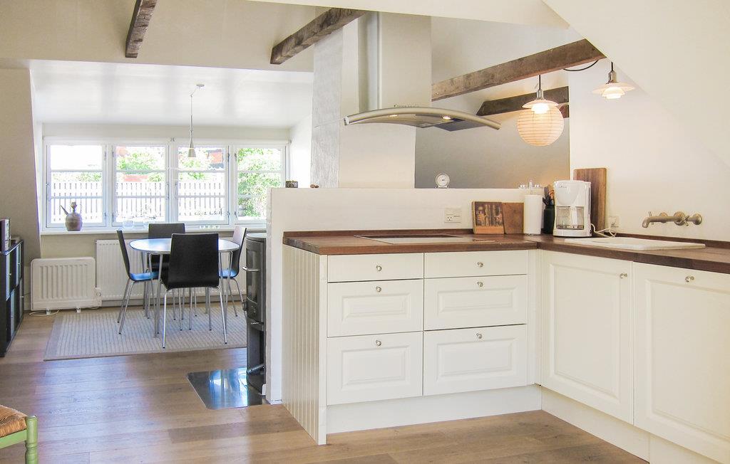 Her mærker man byens puls, men samtidig er der masser af ro og hygge. Indretningen er klassisk, og der er lavet en flot renovering med åbent til kip og fritlagte spær. Fra spiseafdelingen og opholdsstuen har I havkig til Christiansø, så I får et skønt rum til måltiderne og aftenhyggen, som bliver ekstra hyggeligt i de kolde måneder, hvor I kan tænde op i brændeovnen.