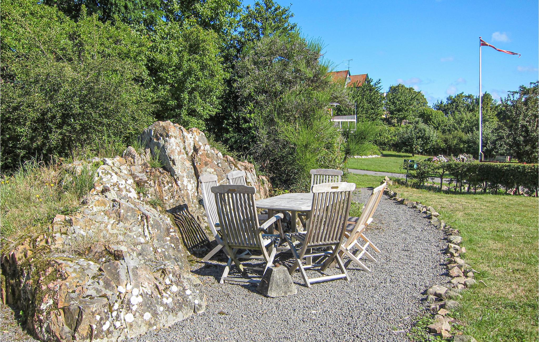 Fra opholdsstuen er der udgang til en flot klippehave med terrasse og fin plads til leg. Terassen er udstyret med havemøbler og en grill, så I kan tilberede lækre feriemåltider i solen. Lad de milde sommeraftener gå på hæld herude til et godt glas vin.