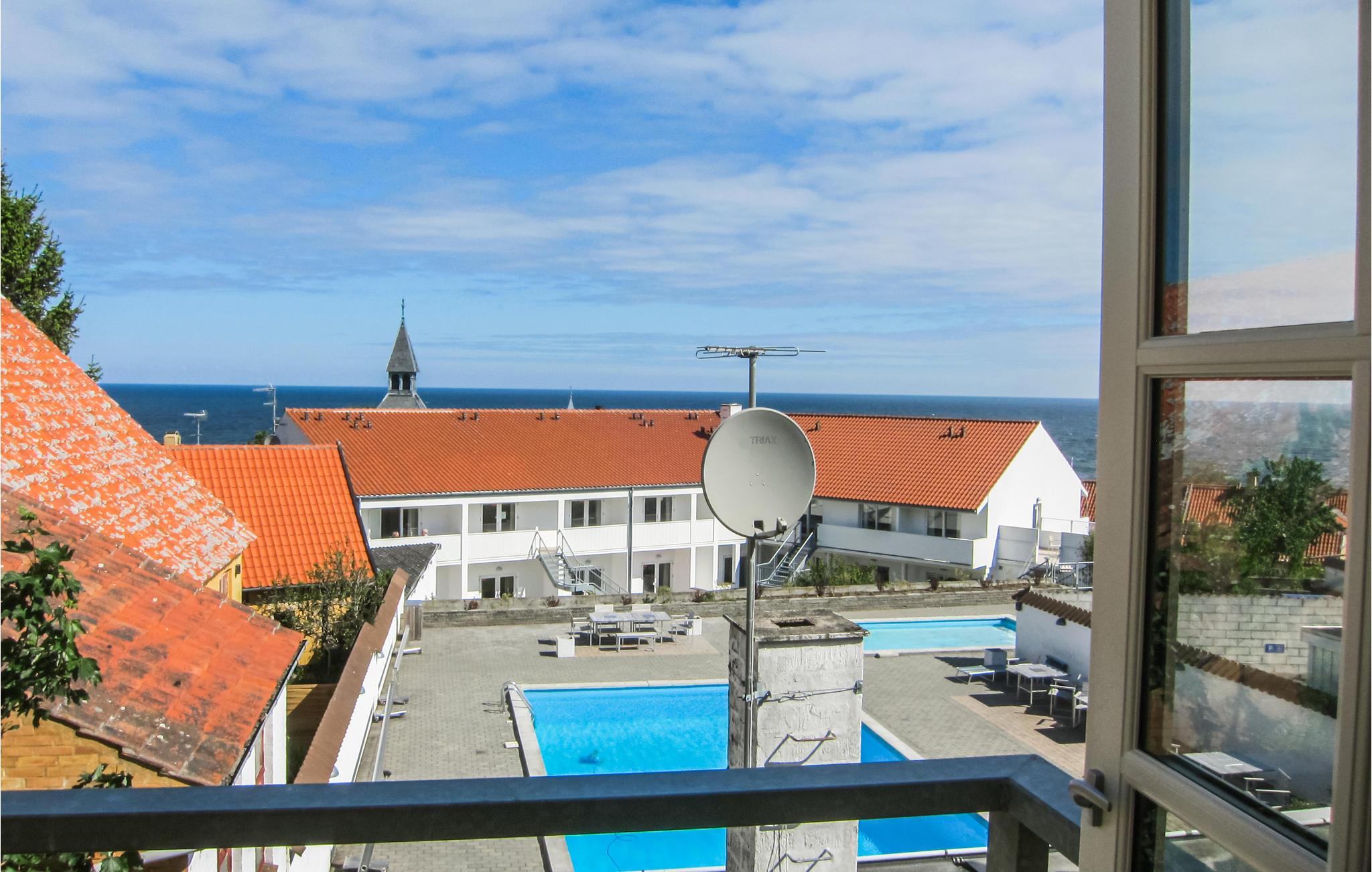 Flot ferielejlighed i hjertet af Gudhjem med havudsigt, terrasse, fælles pool og nærhed til byens charme og Bornholms seværdigheder.