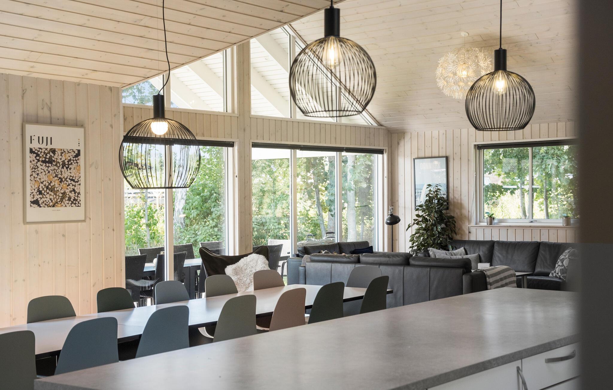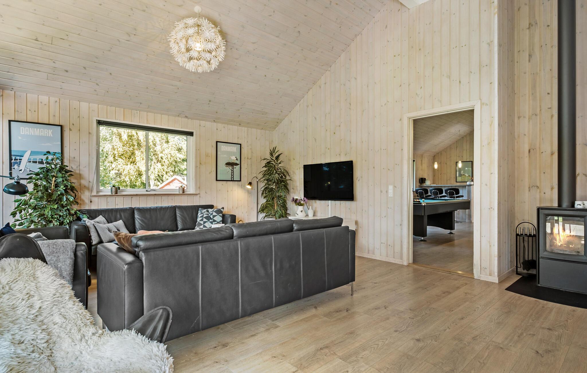 Glæd jer til en dejlig ferie i dette sommerhus, som er oplagt til den helt store familietur. Indenfor er huset beklædt i lyst træ og med store vinduer, som inviterer både lys og udsigten ind. Her er høft til loftet og åbent, så der er masser af plads at boltrer sig på. Slå jer ned i sofahjørnet i alrummet, tænd op for brændeovnen og sæt en god film på tv’et. På det lange spisebord kan I lave en masse kreative aktiviteter, mens andre kan dyste mod hinanden i bordfodbold, dart eller billiard. Trænger I til en dukkert kan I skifte til badetøj og hopppe i den indendørs pool med rutchebane. I har også mulighed for at slappe af i spaen eller tage en tur i saunaen.