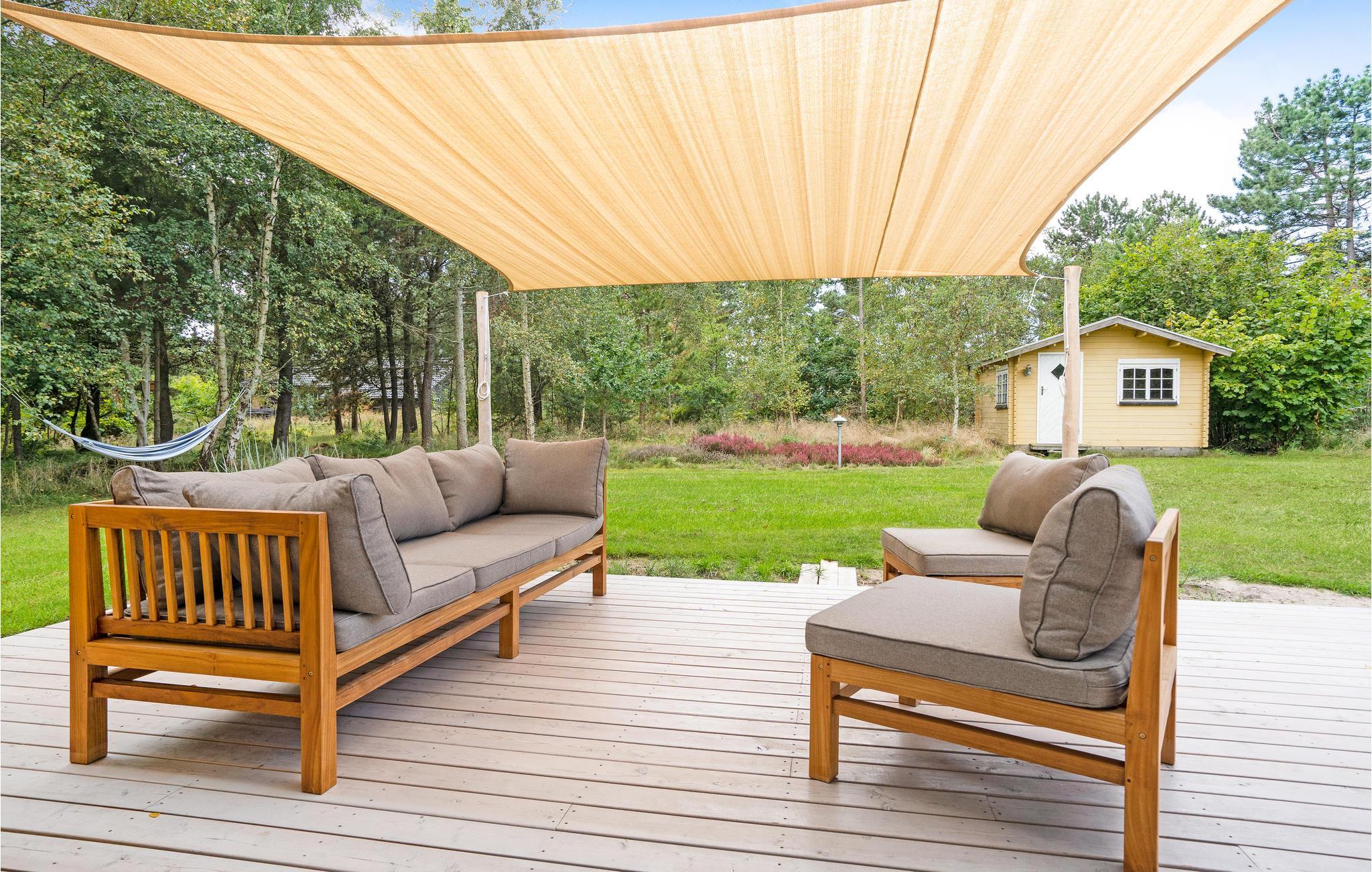 Udenfor inviterer den overdækkede terrasse med havemøbler jer til at tilbringe behagelige timer i den friske luft. I kan slappe af her med en kop kaffe eller en kølig drink, mens børnene leger på plænen.