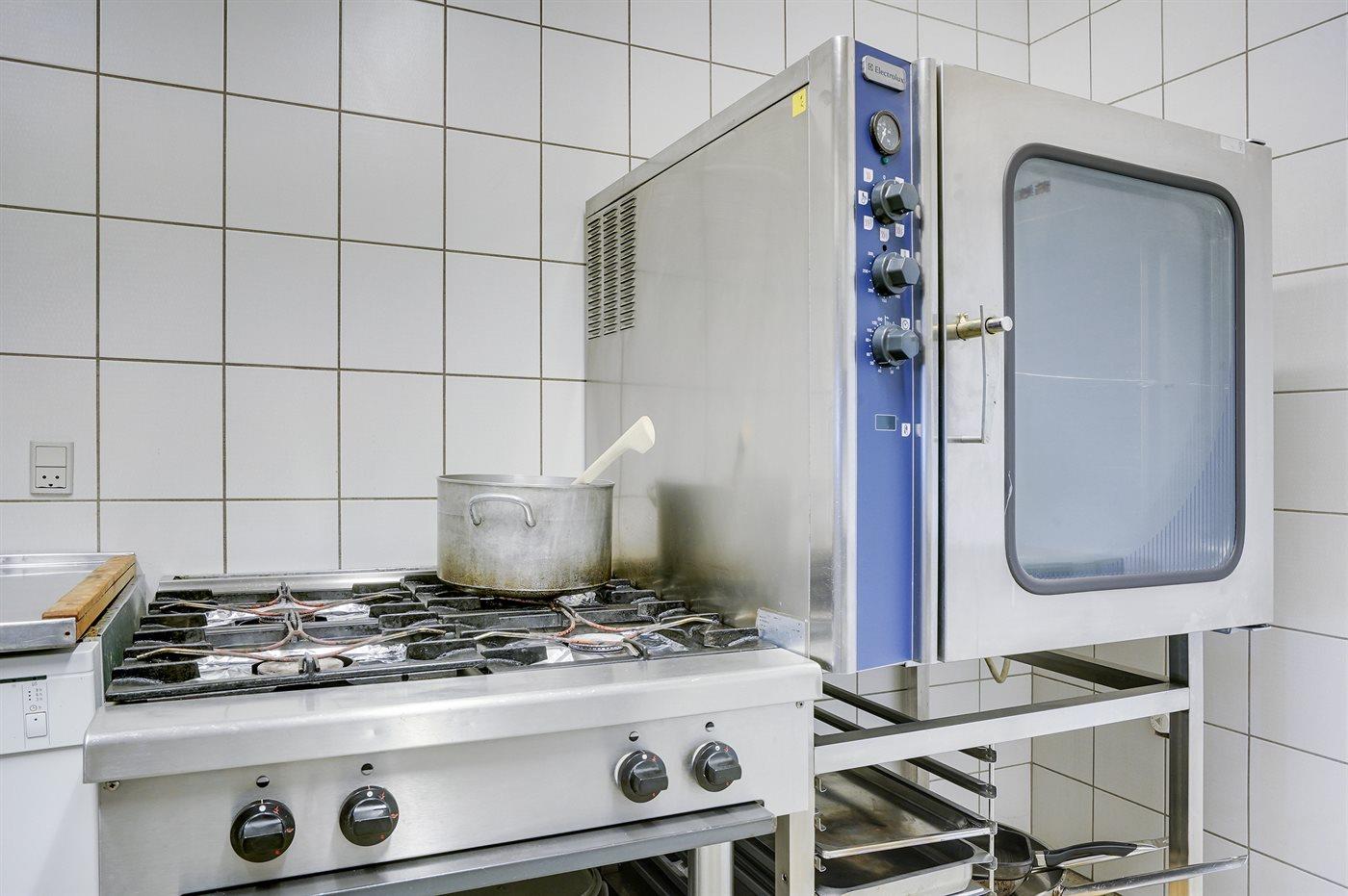 Køkkenet er udstyret med 2 køleskabe. Der er 4 gasblus, varmluftovn samt 2 opvaskemaskiner.
