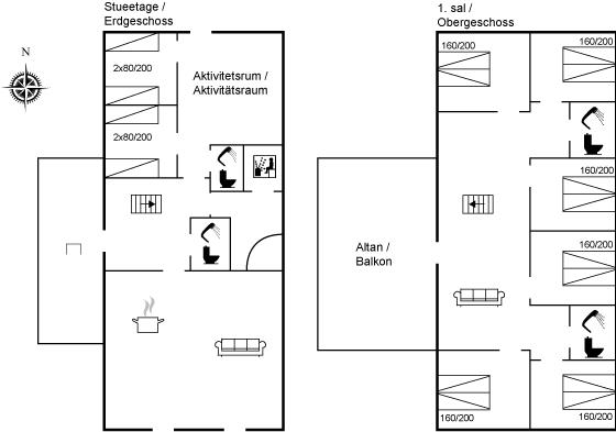 Der er i alt 8 soveværelser. Sovepladserne fordeler sig på: 12 sovepladser i dobbeltsenge. 4 sovepladser i enkeltsenge.