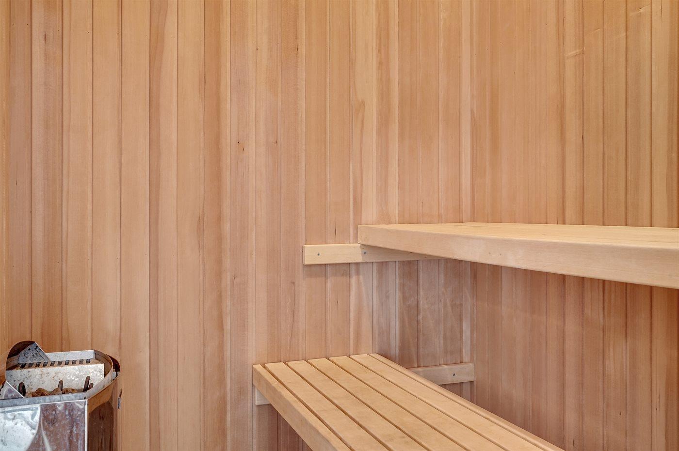 Der er 4 badeværelser med gulvvarme, bruseniche og toilet. I det ene badeværelse er der desuden badekar. I saunaen er der mulighed for afslapning.