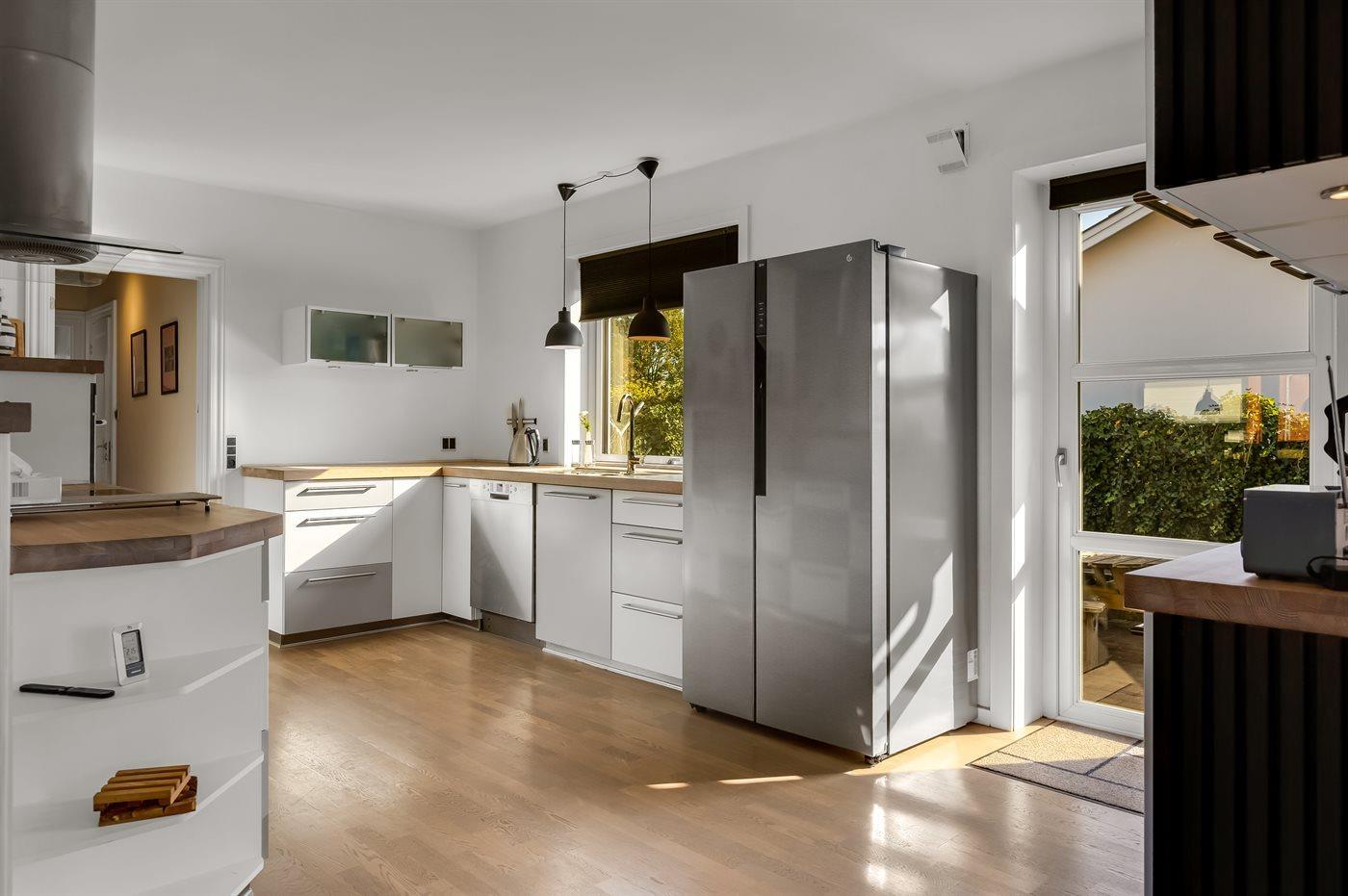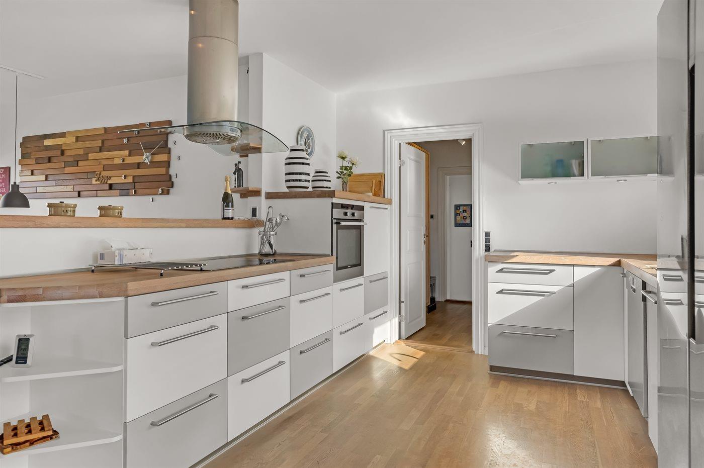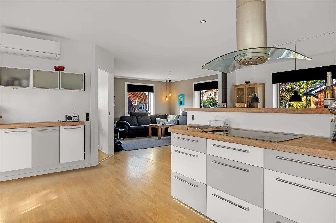 Køkkenet er udstyret med 1 køleskab. Der er 4 induktionskogeplader, varmluftovn samt opvaskemaskine.