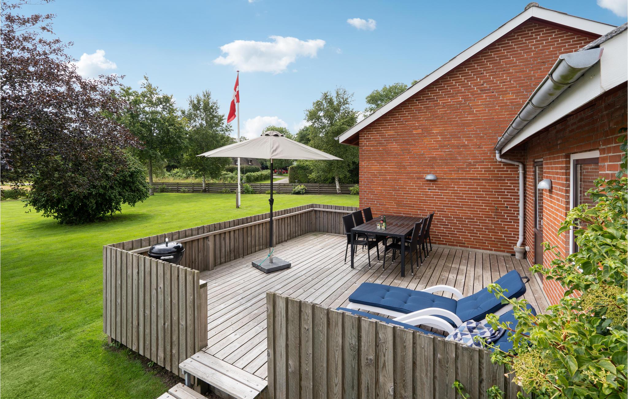 Huset ligger på en stor grund med en vidunderlig græsplæne, hvor der er plads til mange timers leg og boldspil. Her finder I også en gynge og sandkasse til de små. På terrassen er der en grill, og her kan I nyde de magiske sommeraftener med et lækkert måltid mad og en kølig drink.