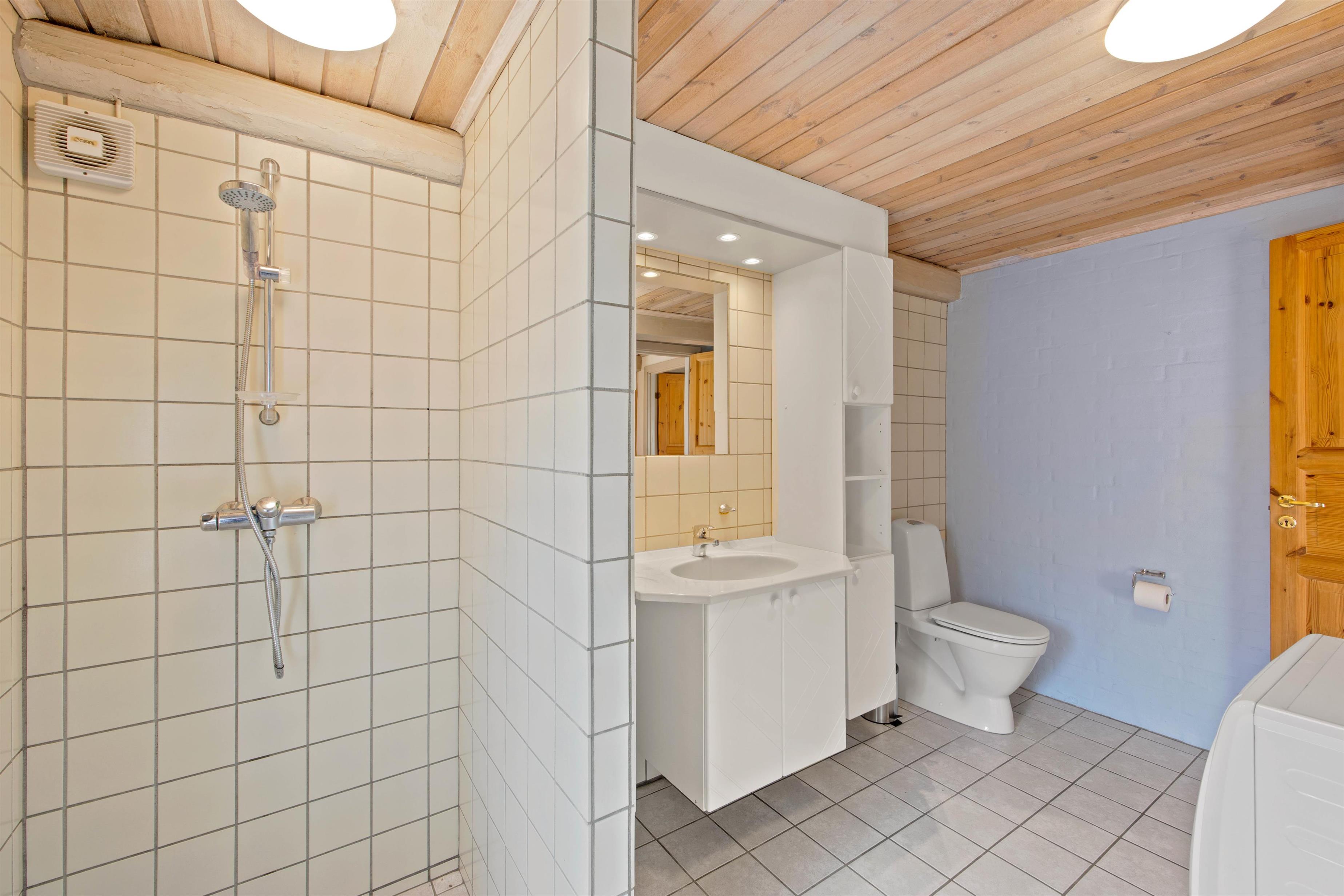 På sommerhusets badeværelse med gulvvarme finder I både vaskemaskine og tørretumbler, så I kan vaske lidt tøj eller håndklæder, hvis det skulle blive nødvendigt.