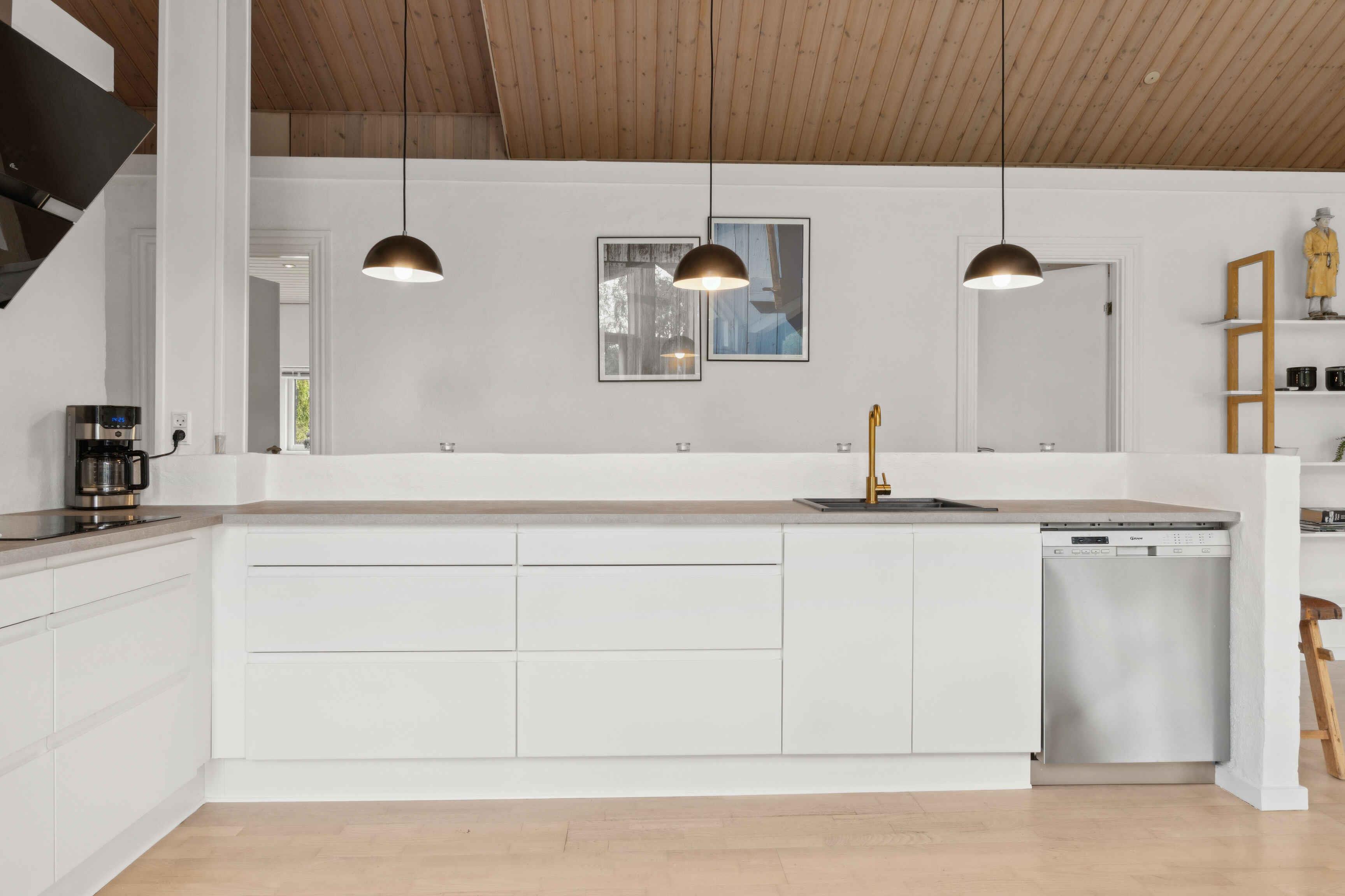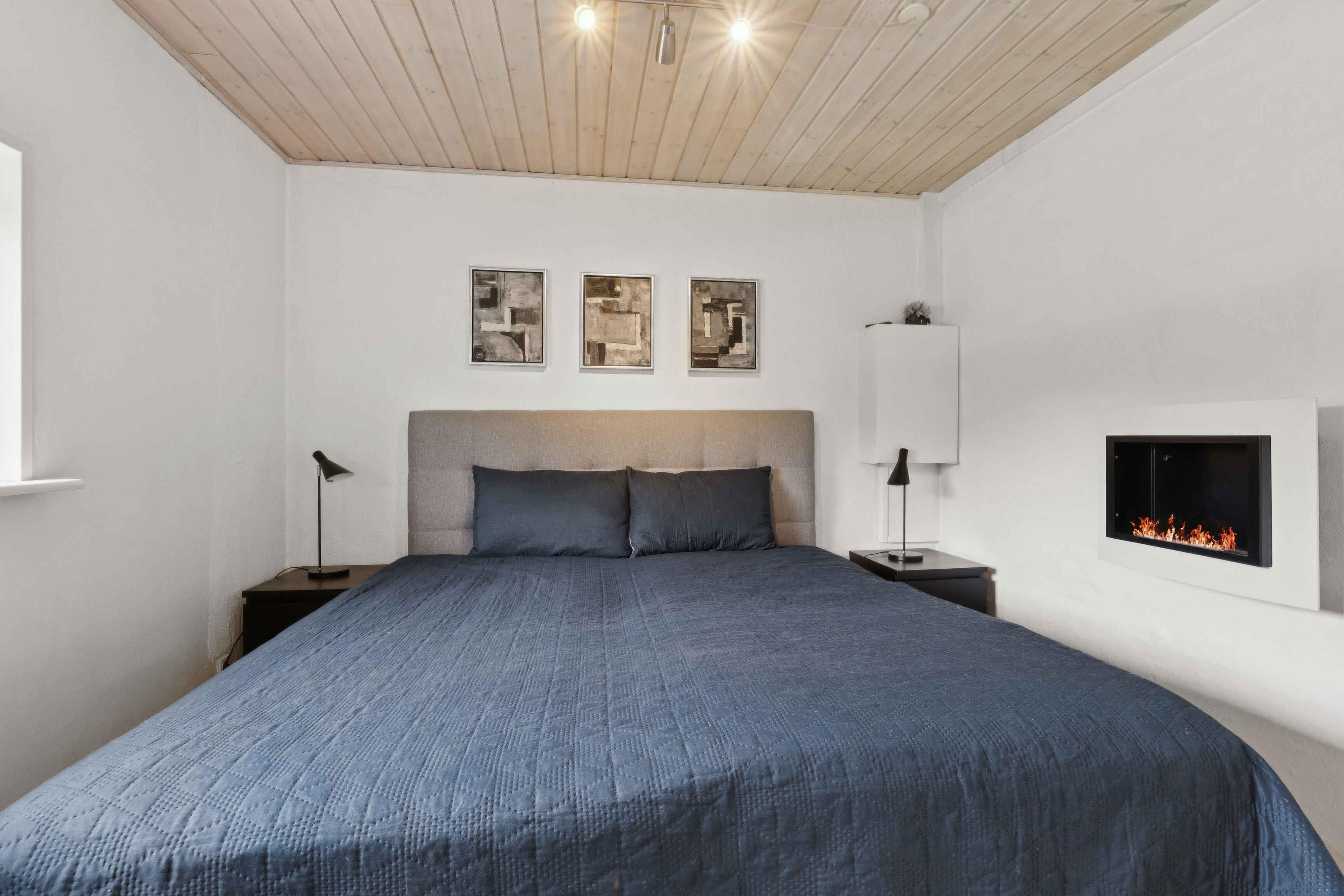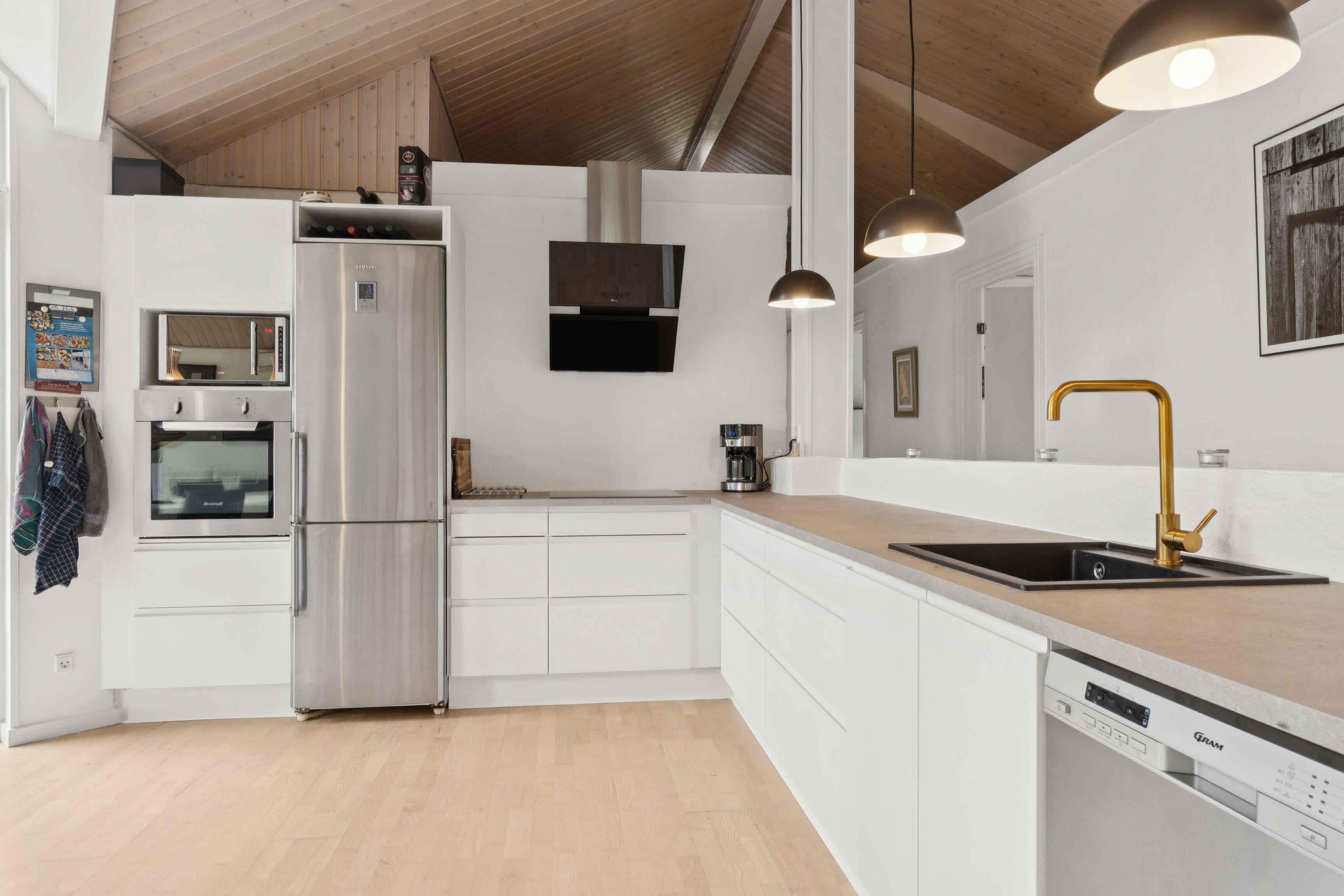 dejligt lyst sommerhus, to badeværelser det ene med spa, åben køkken i forbindelse med stuen, varmepumpe, brændeovn, internet, stor terrasse, tæt på stranden, de to af sovepladserne er på hemsen, hvor der er en dobbeltseng