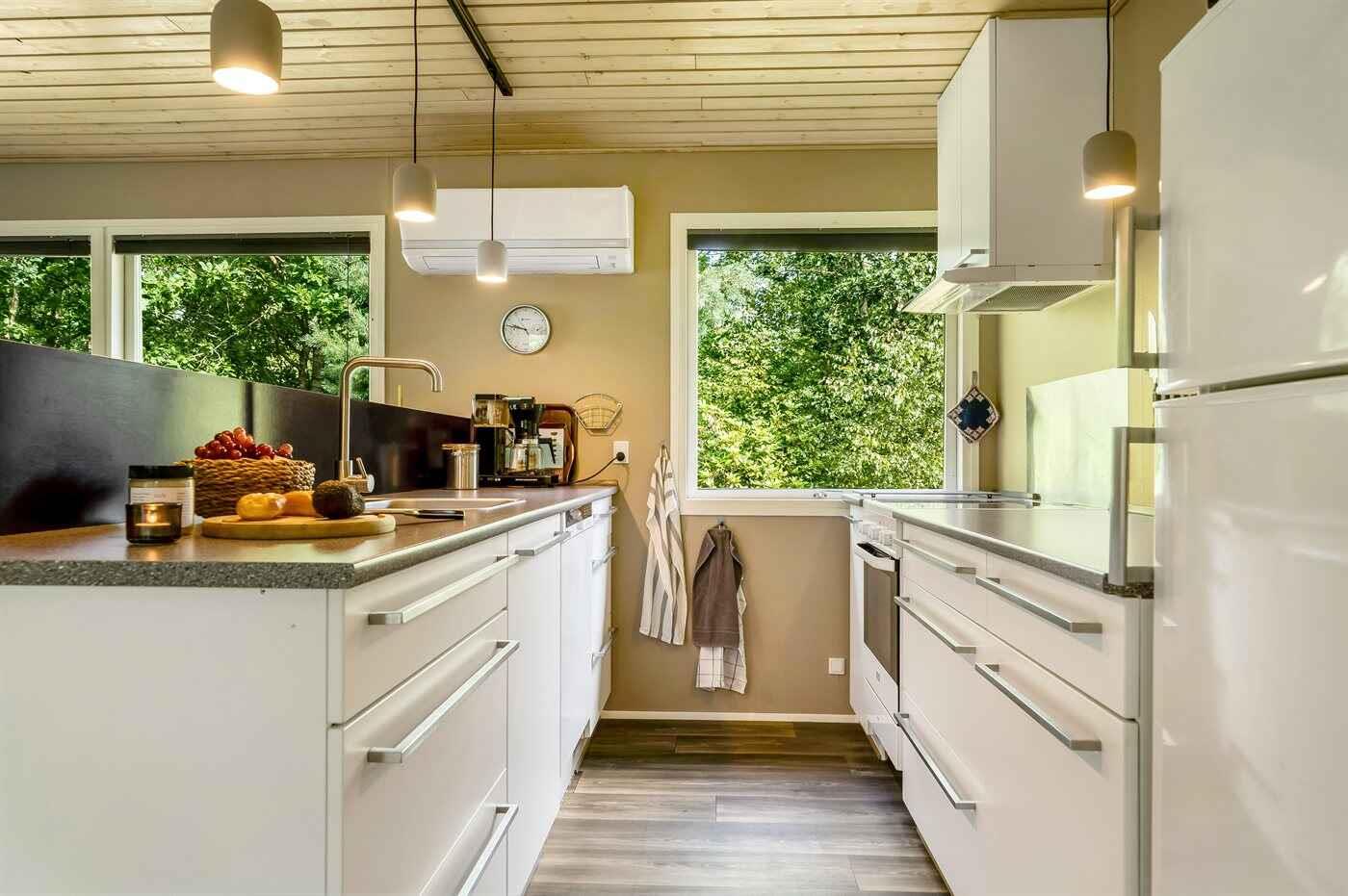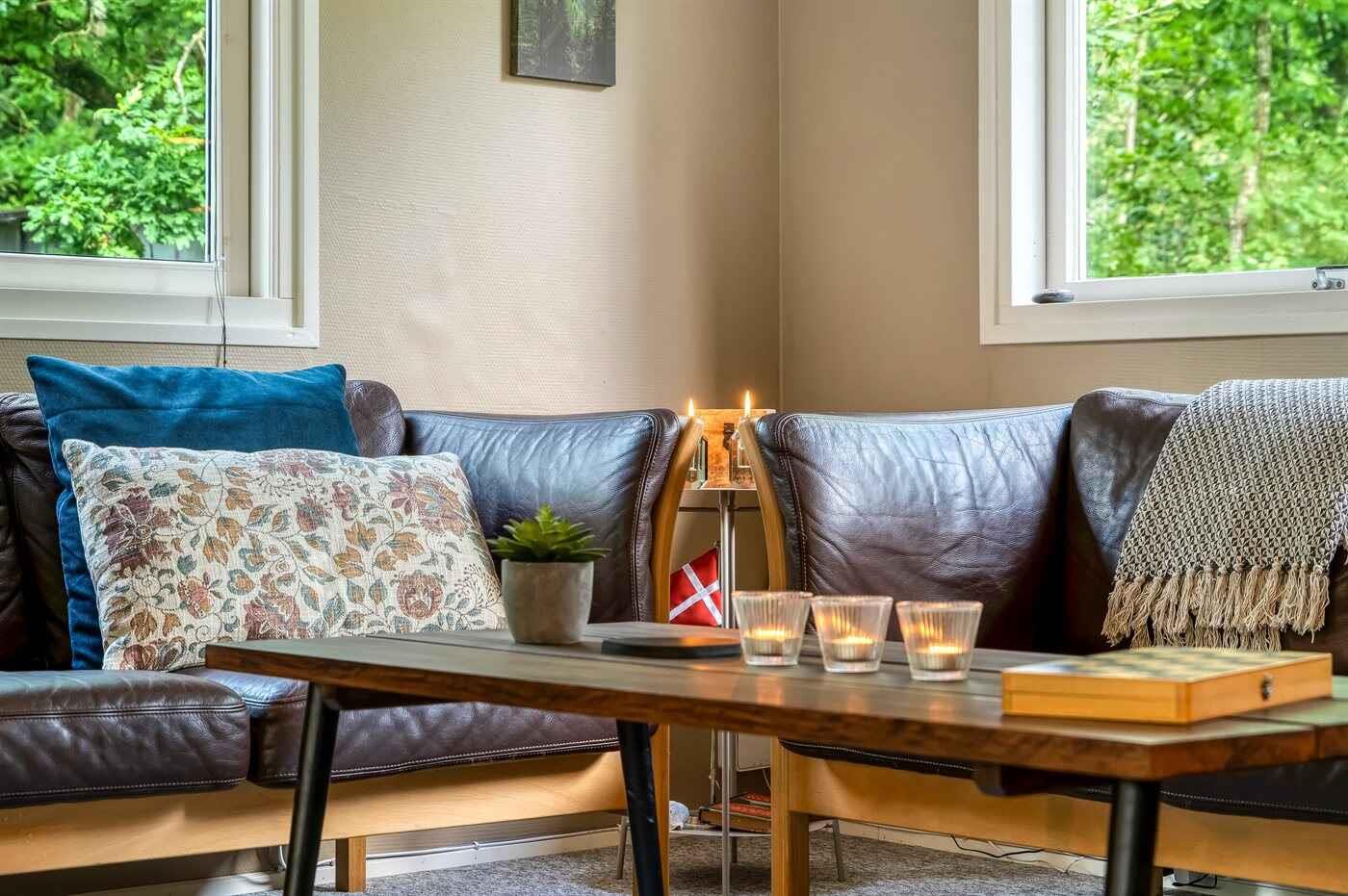 Hyggeligt feriehus i skoven nær hav og fjord med stor terrasse og moderne faciliteter.