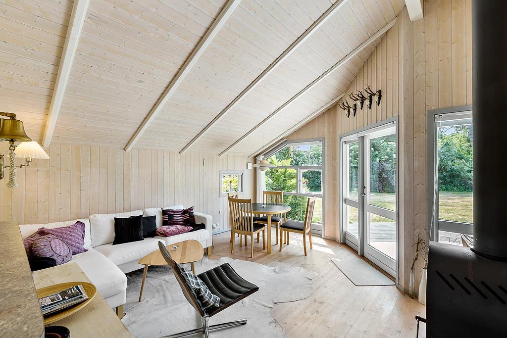 Træd ind i dette lyse og venlige sommerhus, der straks emmer af hygge og feriestemning. I opholdsstuen kan I finde jer til rette i de komfortable møbler, mens brændeovnen knitrer og skaber varme på kølige aftener. Det åbne og funktionelle køkken gør det let at forberede dagens måltider, mens samtalen med familien fortsætter ubesværet. Fra hovedhuset fører terrassen jer direkte over til annekset, der giver ekstra plads til overnattende gæster i de varme måneder. Her er alt indrettet til, at I kan føle jer hjemme og nyde tiden sammen.