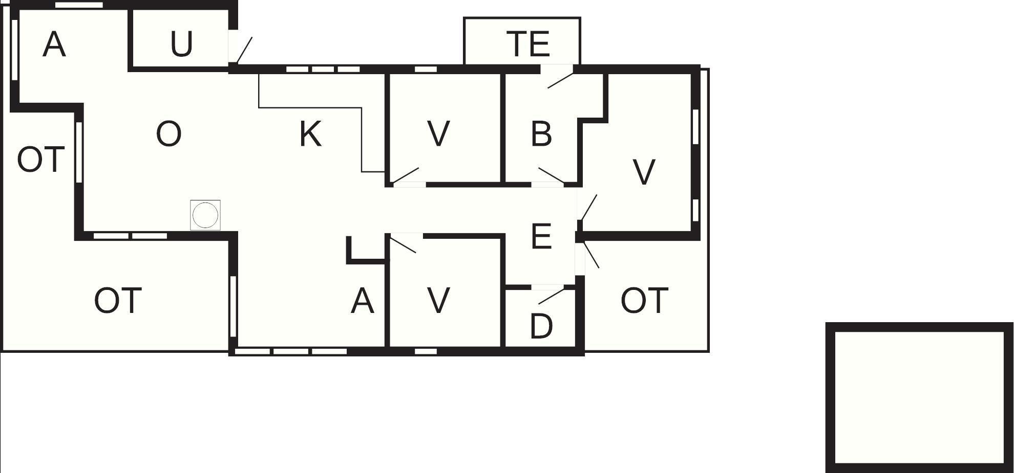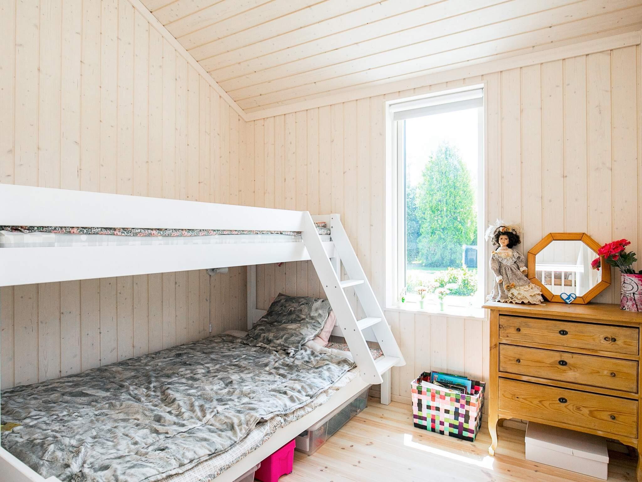 Sommerhuset indeholder entré/gang, hems, badeværelse med vaskemaskine samt udgang til udebruser. Derudover er der stort og rummeligt soveværelse med dobbeltseng samt skabsvæg, værelse med dobbeltseng samt værelse med norsk køjeseng og mindre hems til leg.